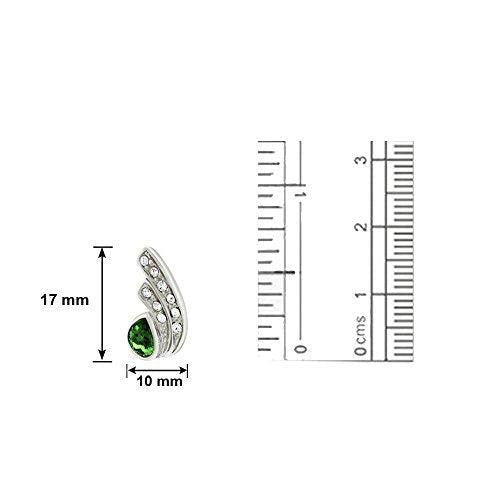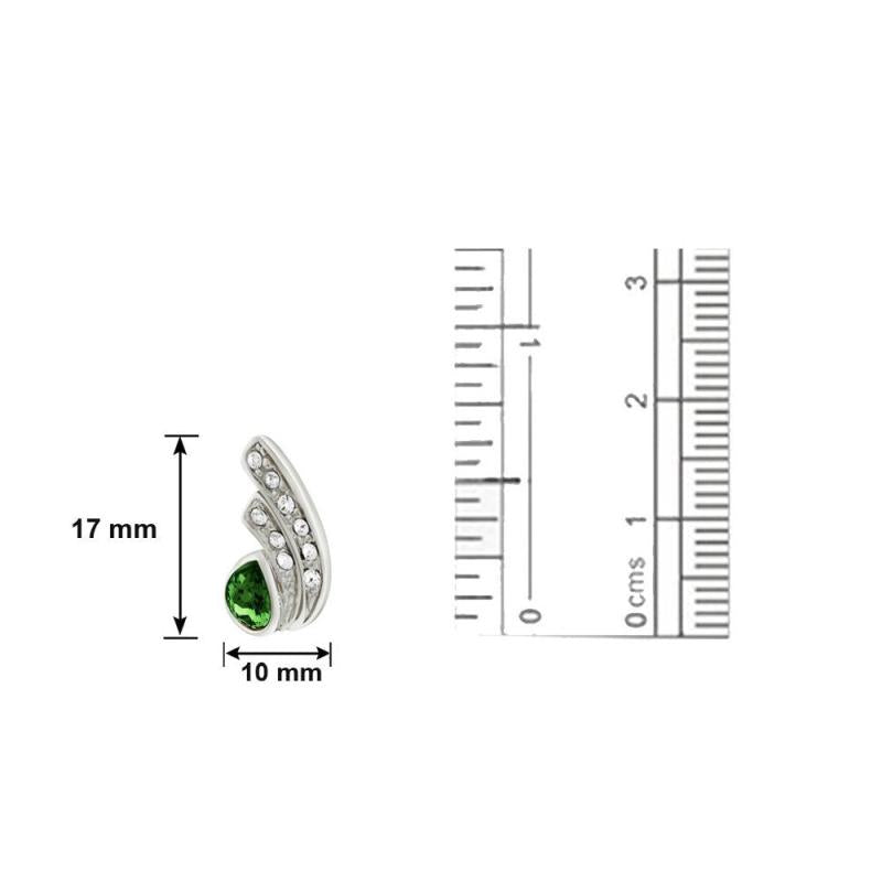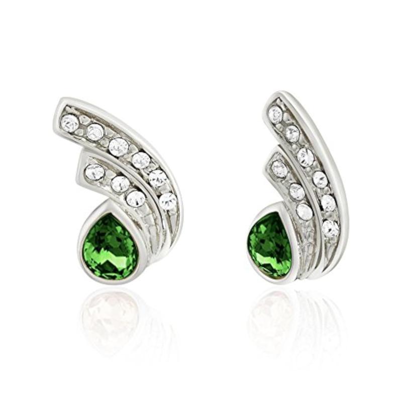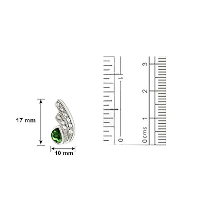 Stunning rhodium plated green drop earrings featuring a peacock feather design with Swarovski Elements for a touch of elegance.