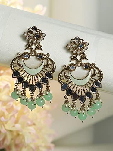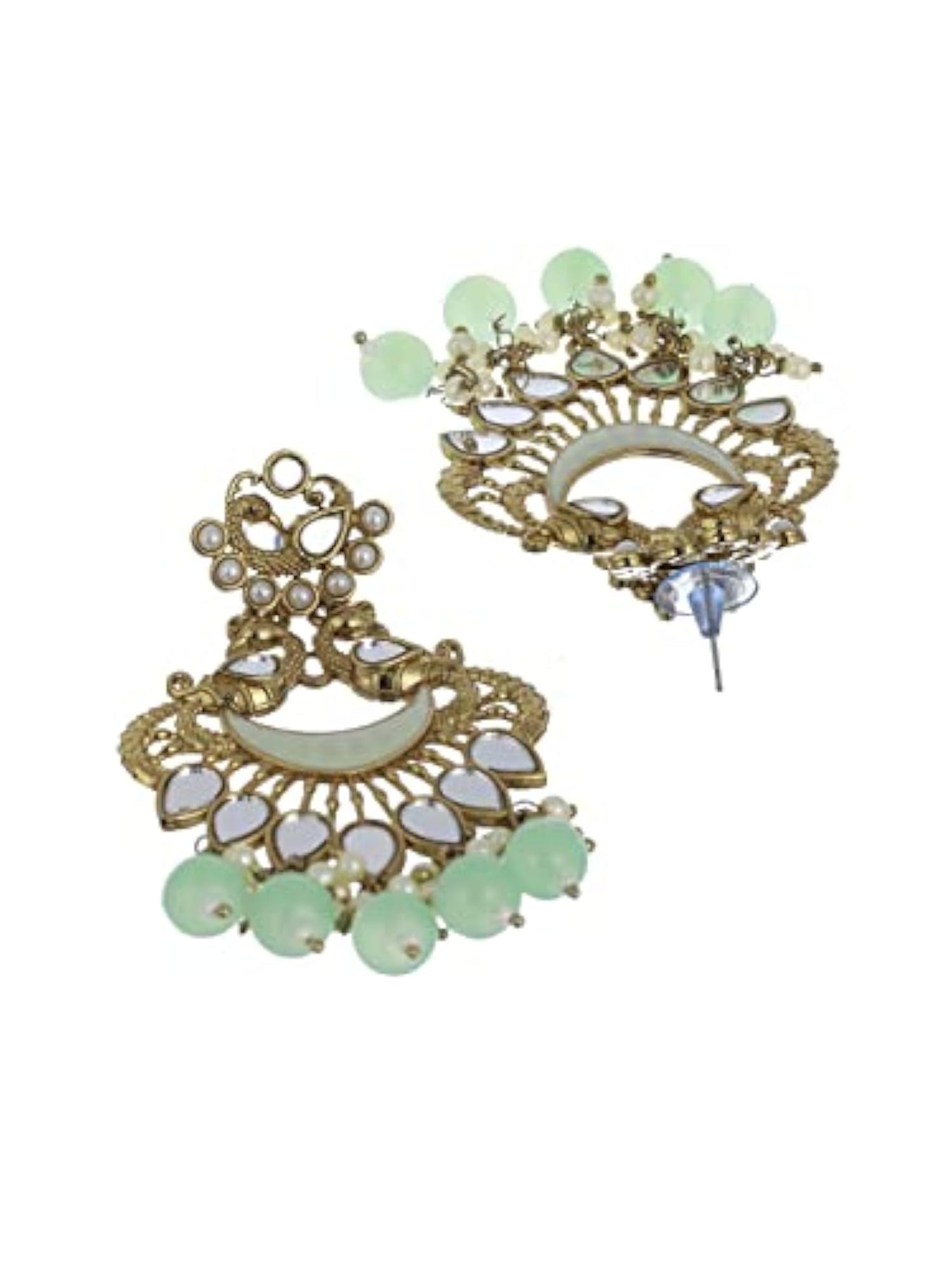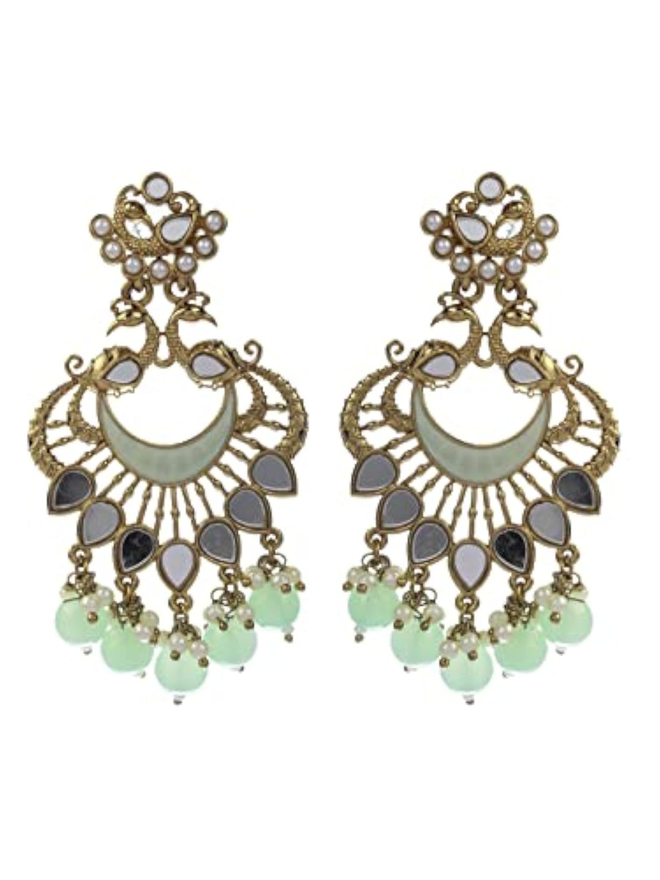 Elevate your style with these stunning peacock-shaped earrings featuring green enamel and mirror studs. These modern earrings are a perfect accessory for any occasion.