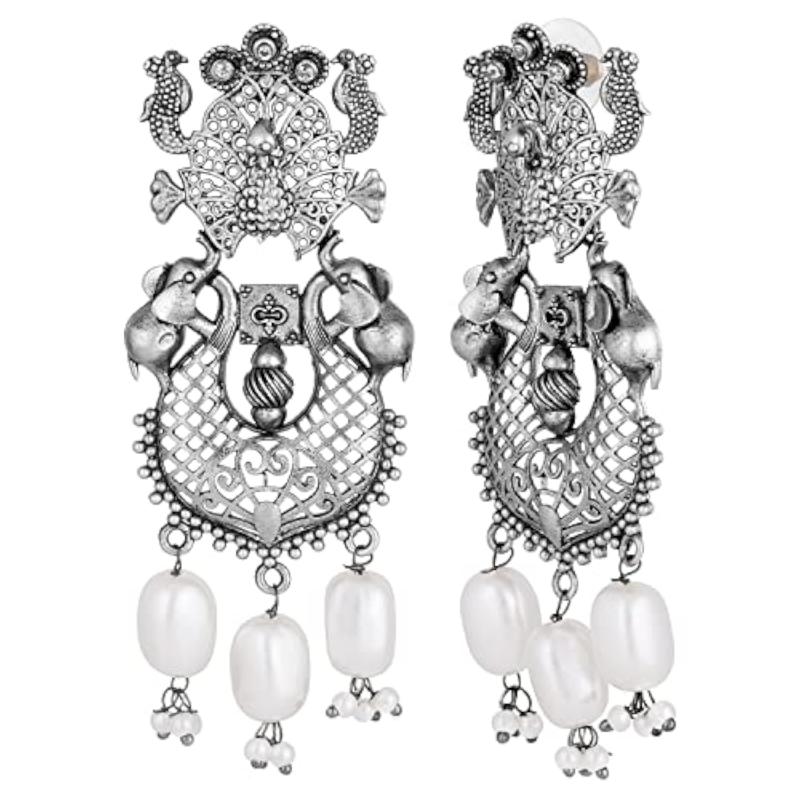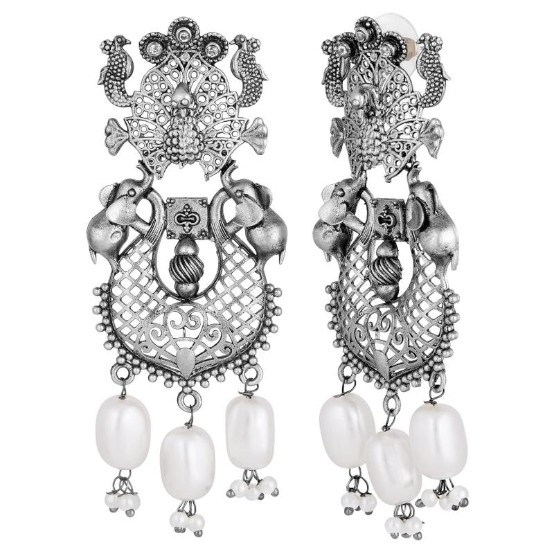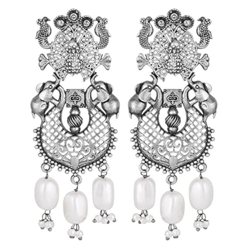 Elegant silver oxidised earrings with peacock design, perfect for traditional Indian wear.