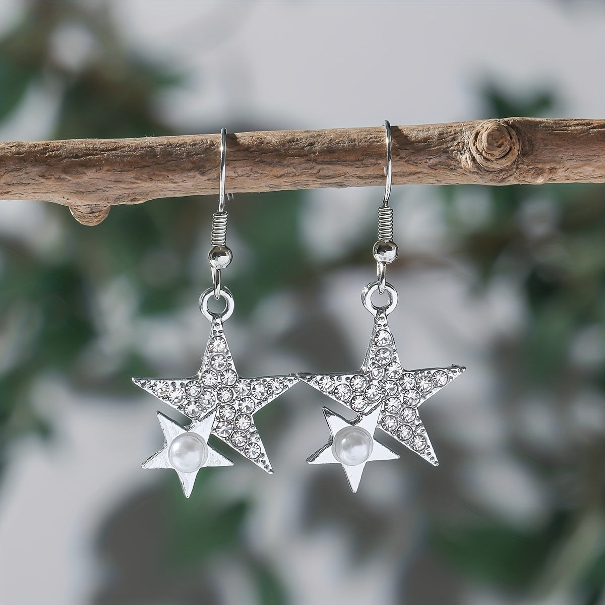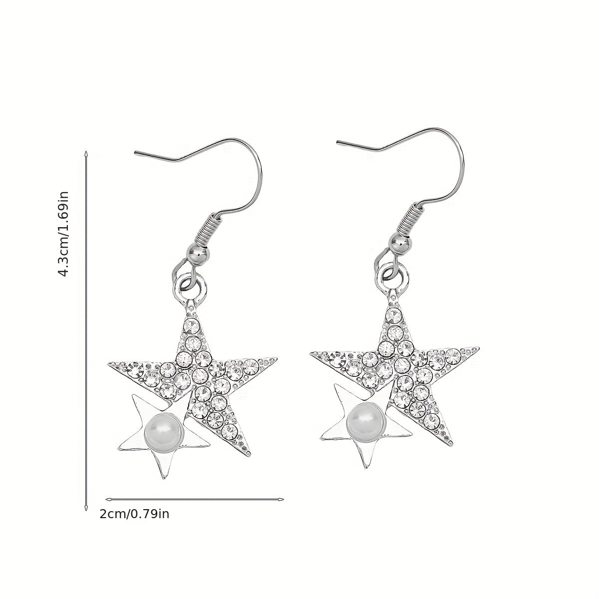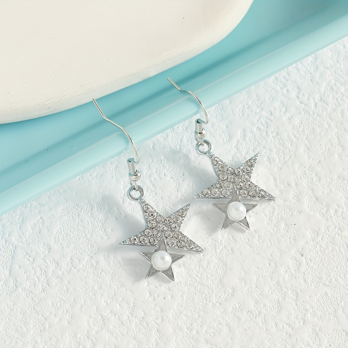 Elevate your style with these double pentagram dangle earrings featuring rhinestones and faux pearls. Made of zinc alloy, these stunning earrings are perfect for adding a touch of glamour to any outfit.