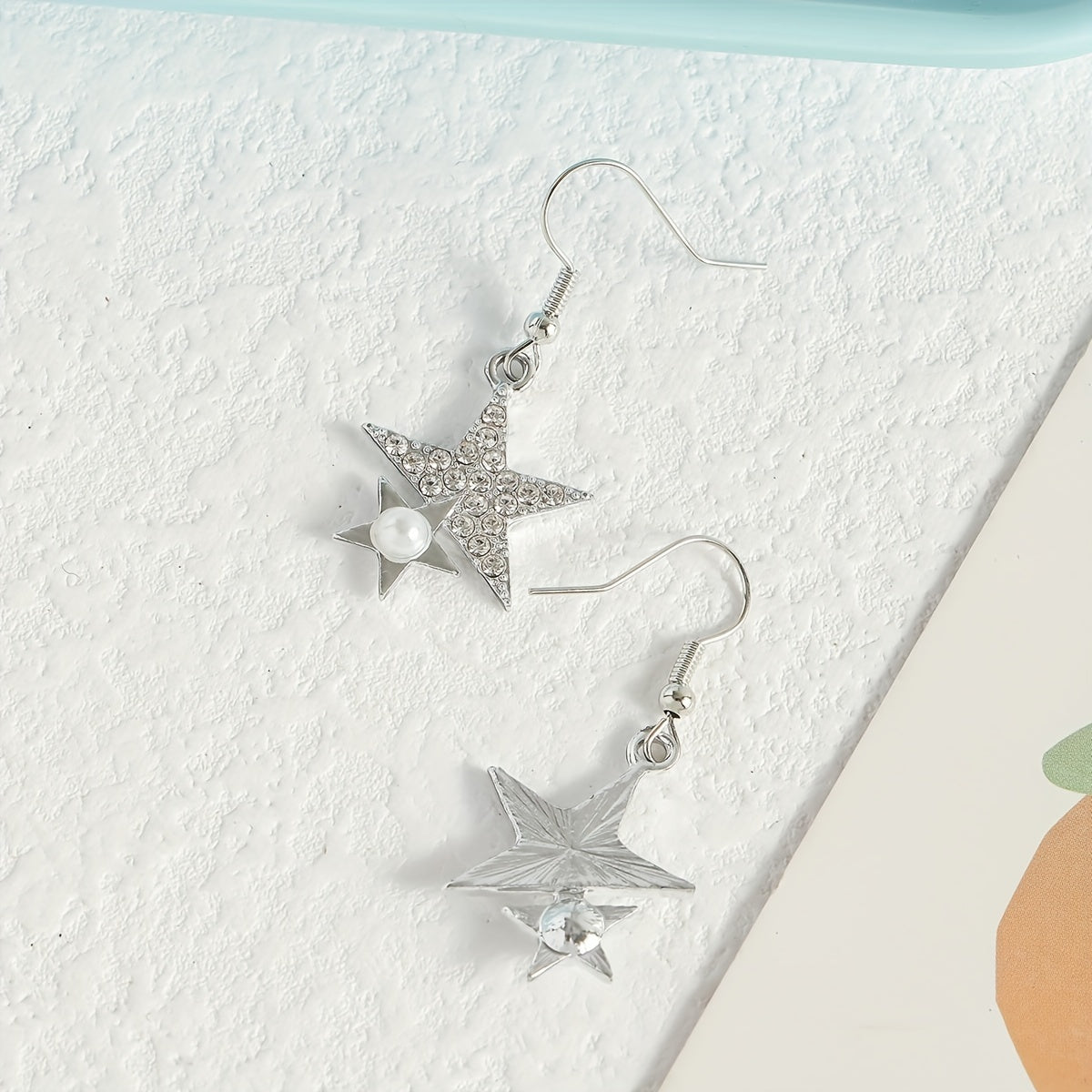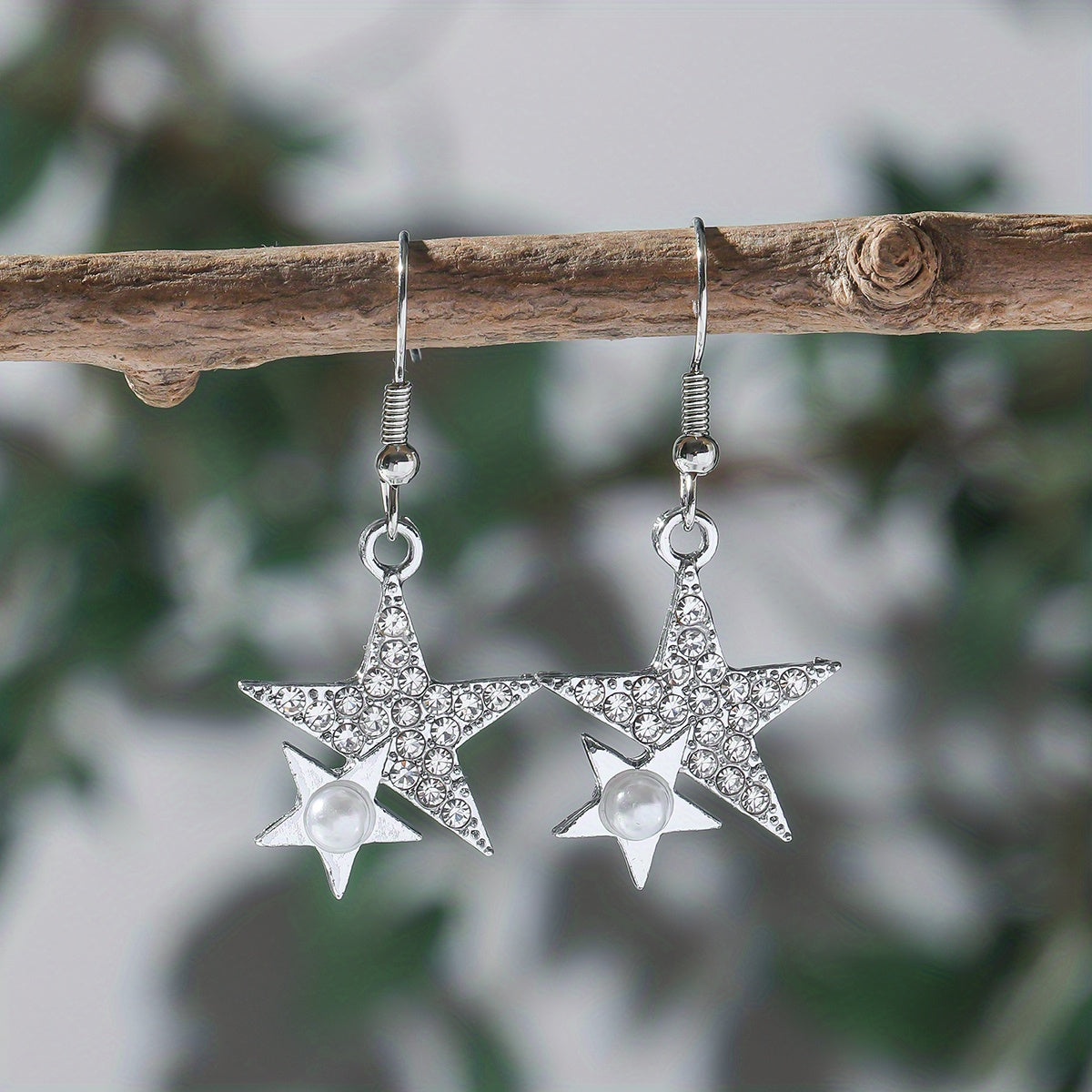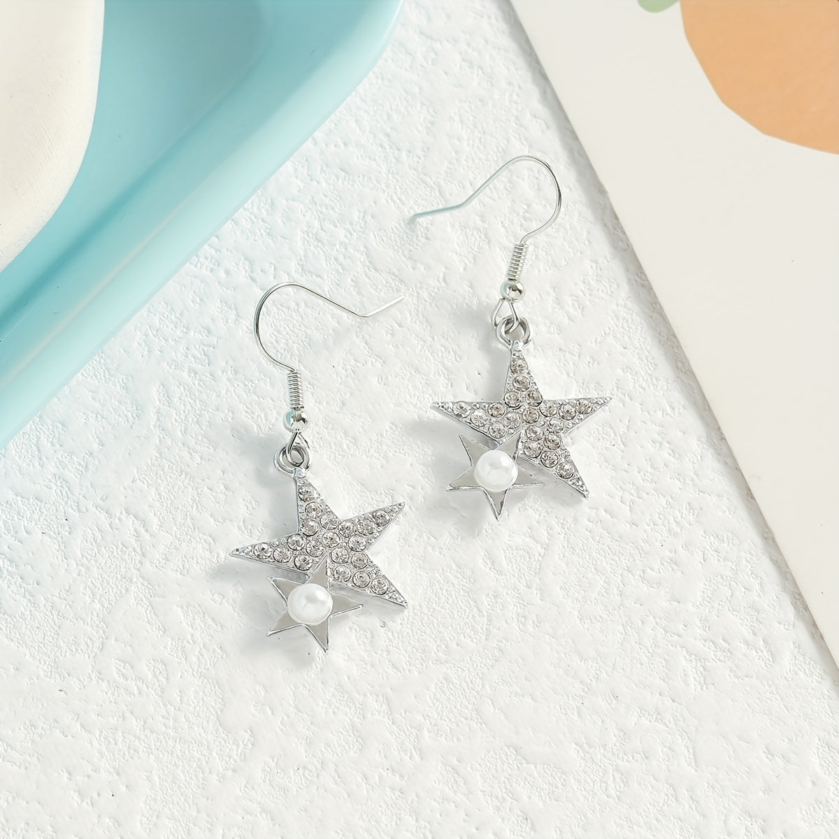 Elevate your style with these double pentagram dangle earrings featuring rhinestones and faux pearls. Made of zinc alloy, these stunning earrings are perfect for adding a touch of glamour to any outfit.