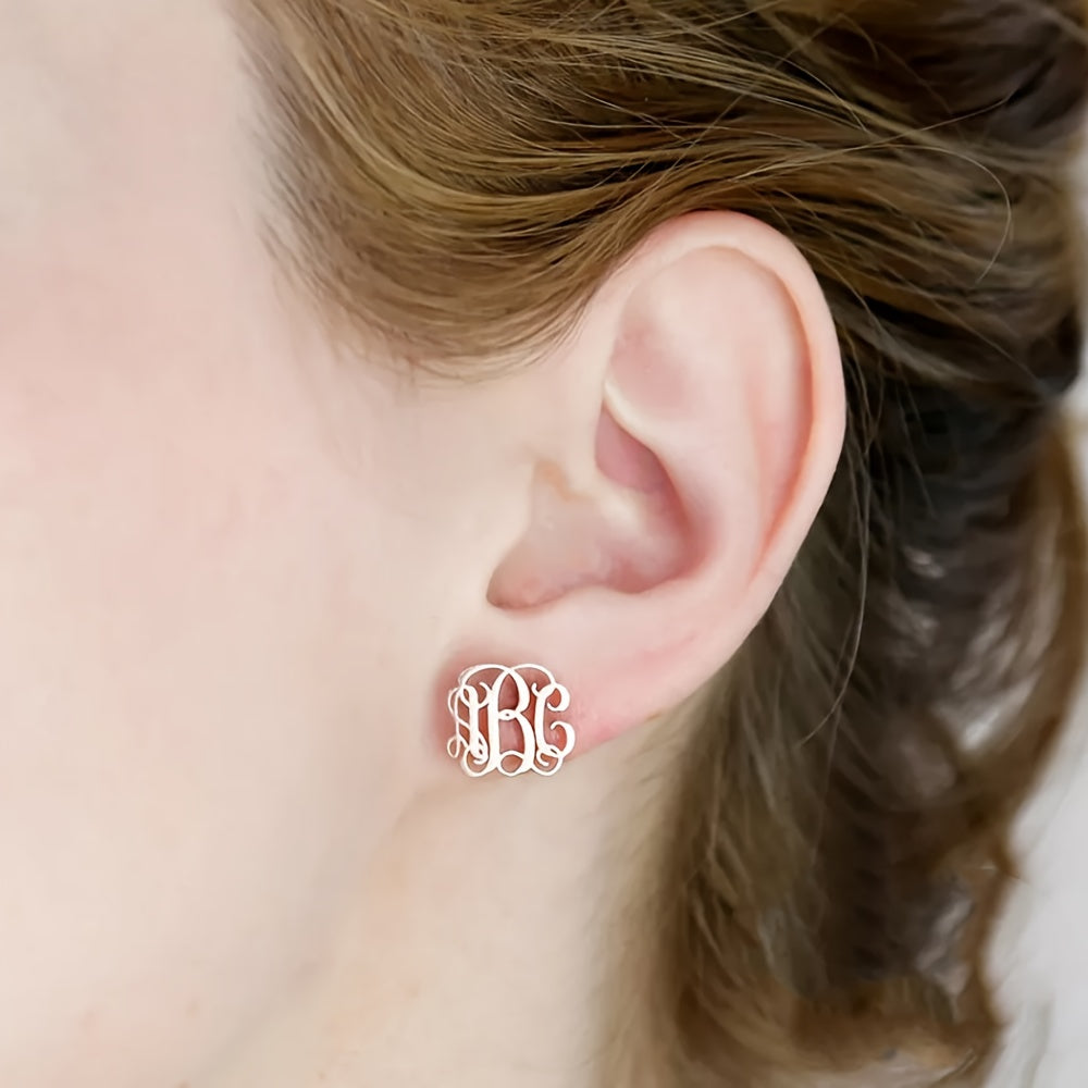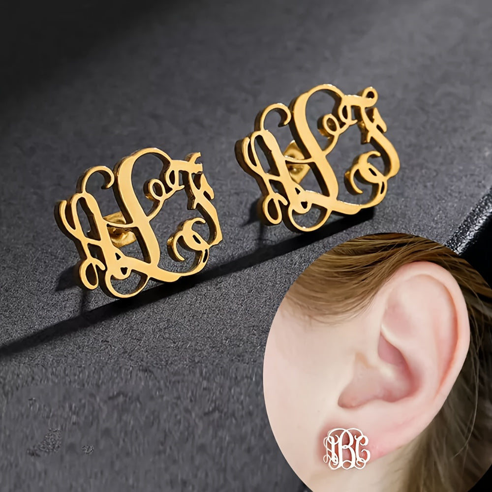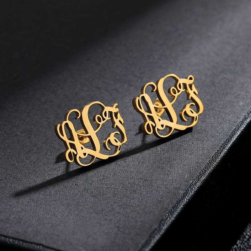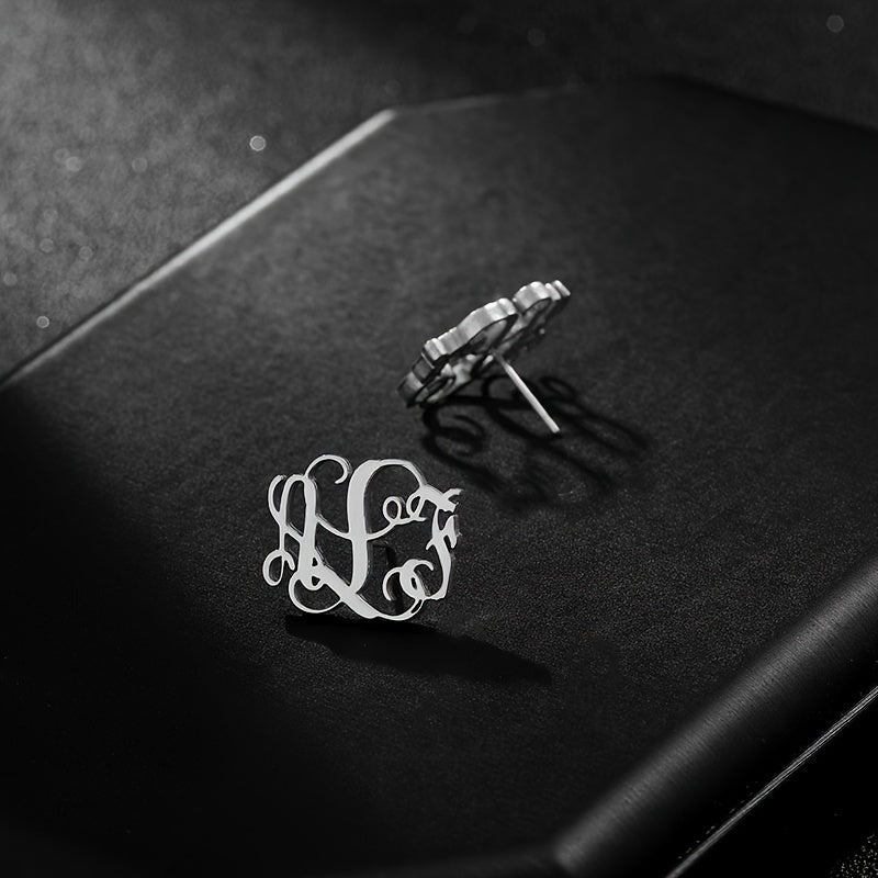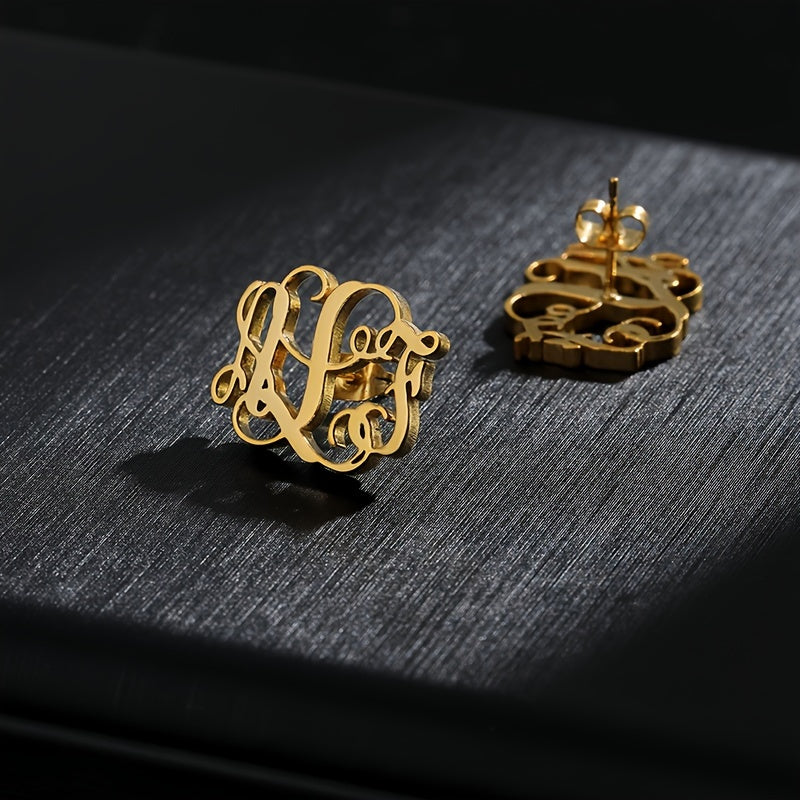Customize your own pair of ear studs with a name of your choice in a beautiful flower seal font. Made of high-quality stainless steel, perfect for birthdays, graduations, anniversaries, and weddings.