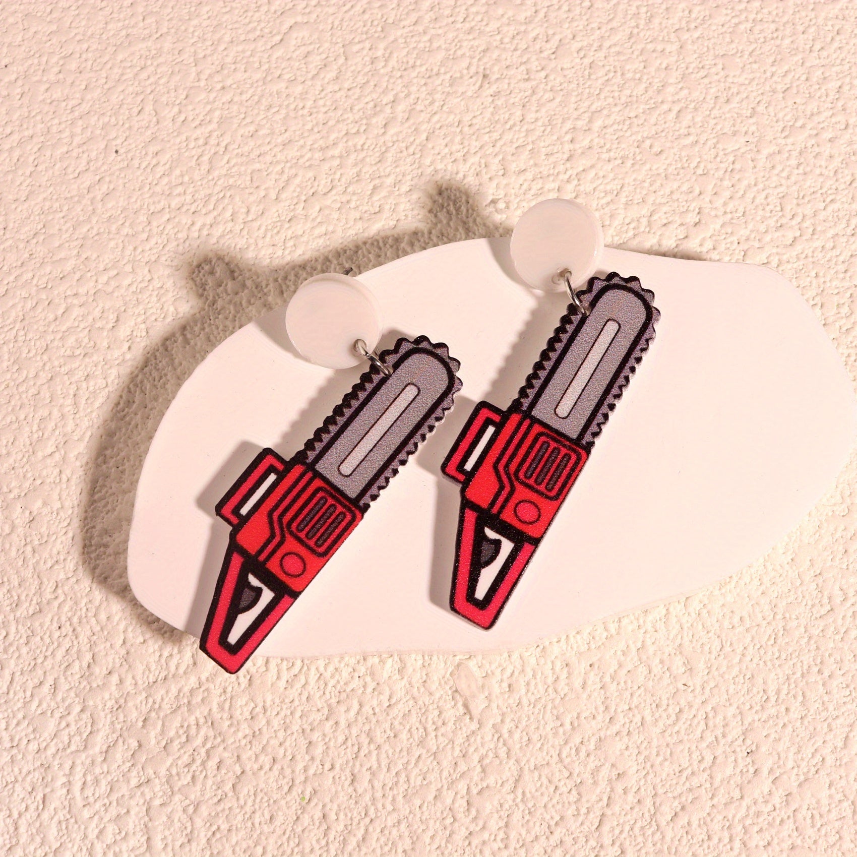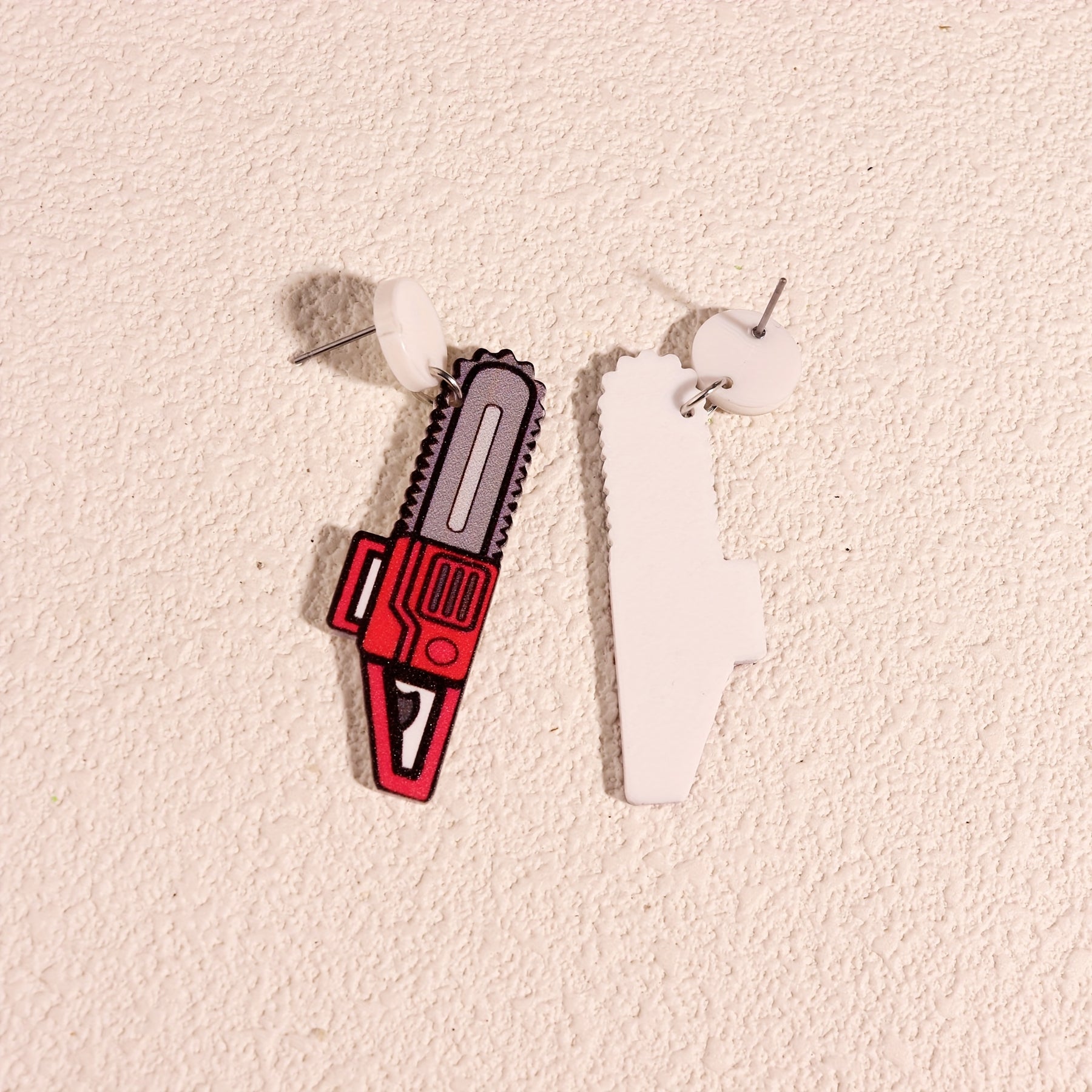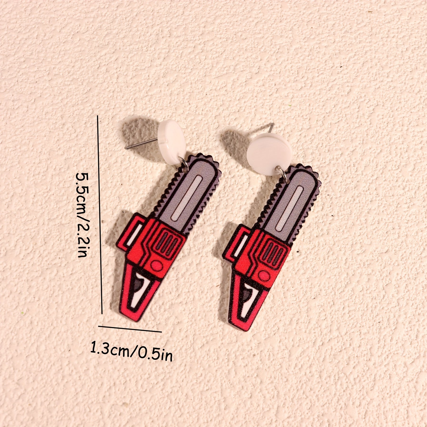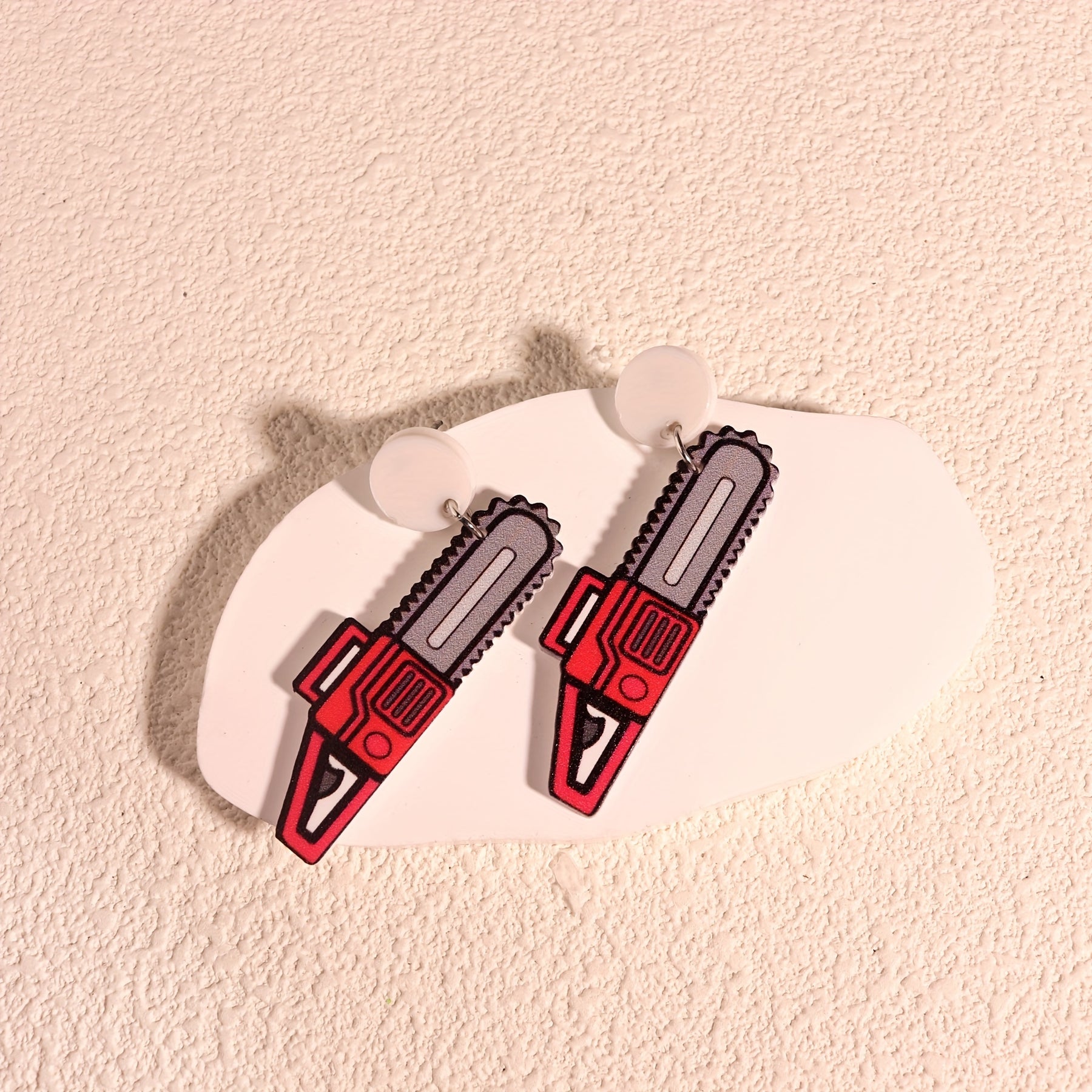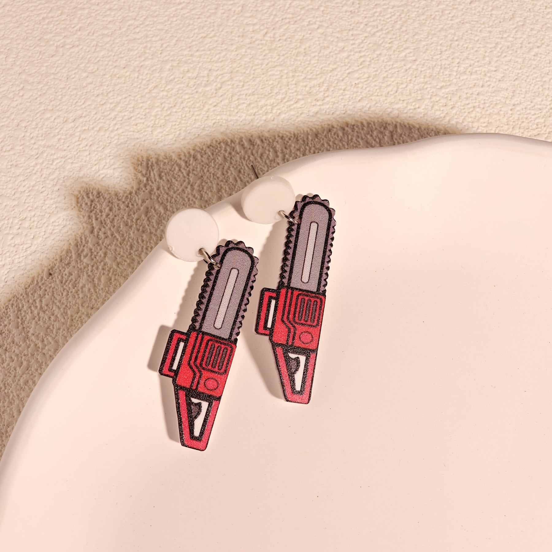 These dangle earrings feature a pink chainsaw cartoon graffiti design, perfect to add a touch of humor to your style. Made of acrylic, these earrings are delicate and lightweight, making them a great gift for women and girls.