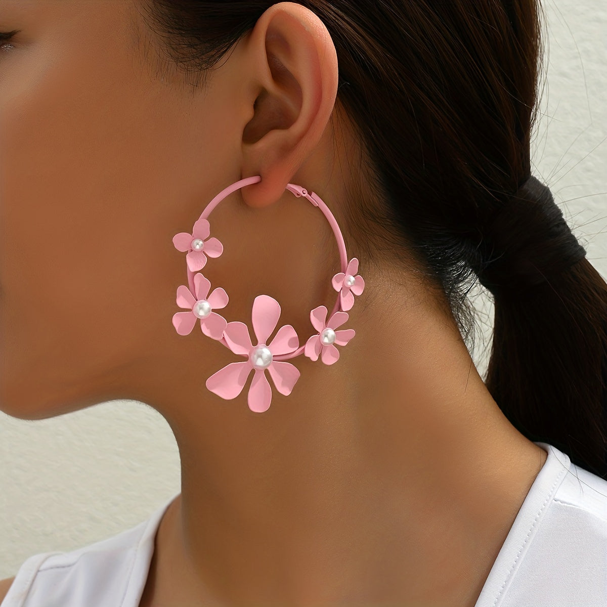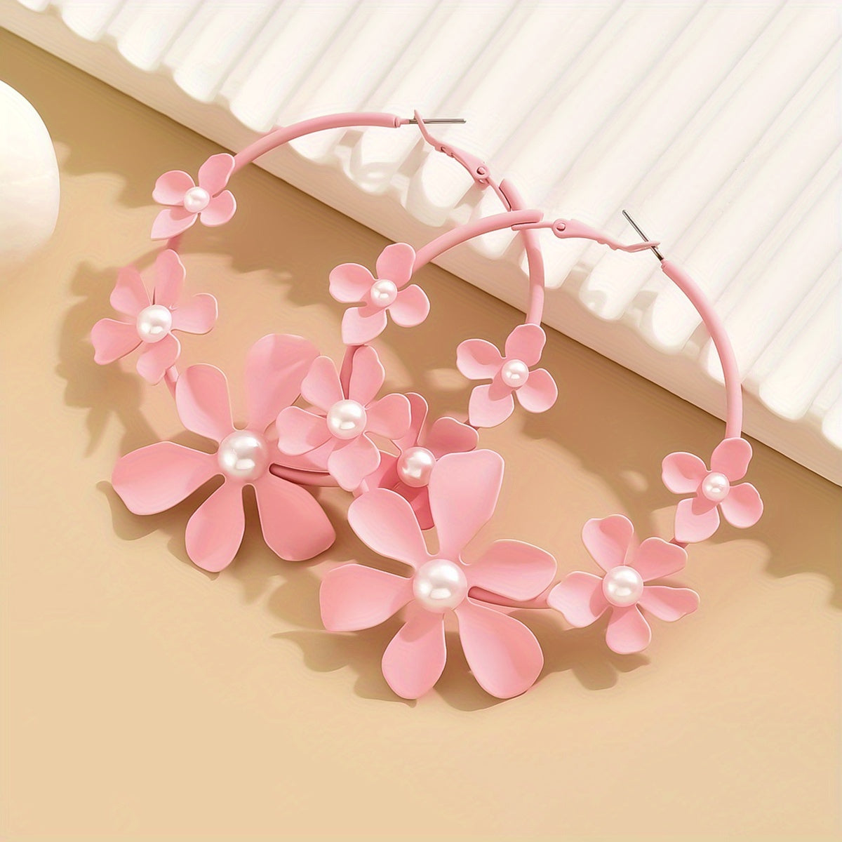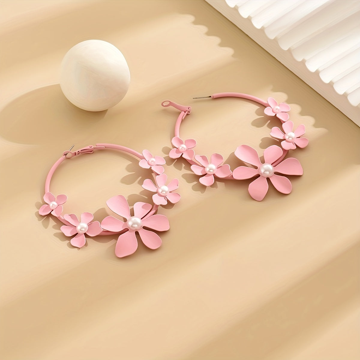 These lovely hoop earrings feature pink flower decor with faux pearl inlays. A delicate and feminine gift for any occasion.