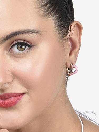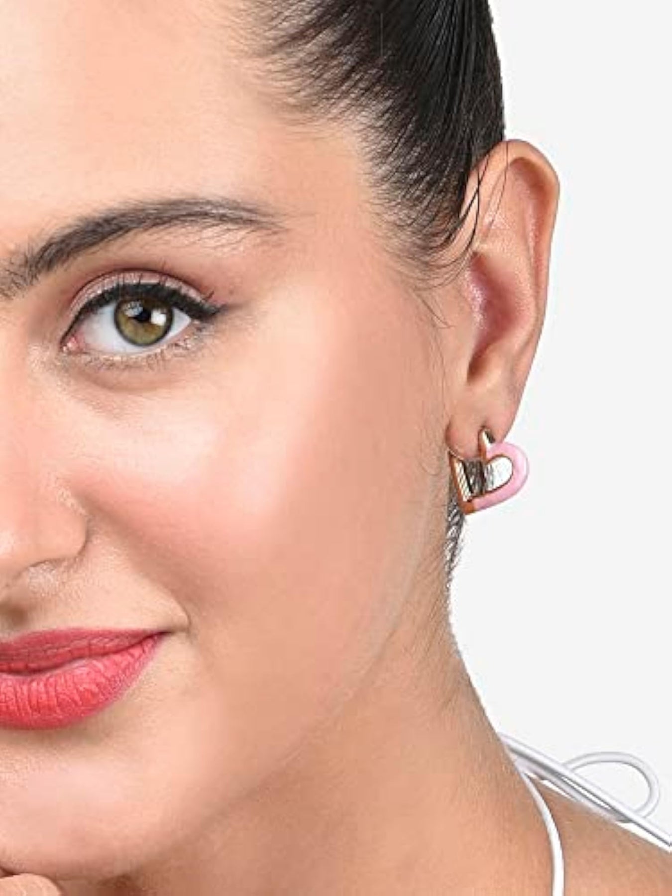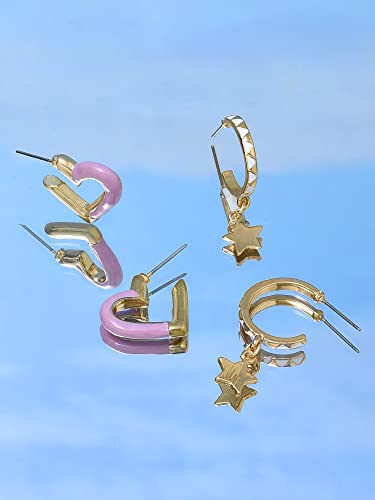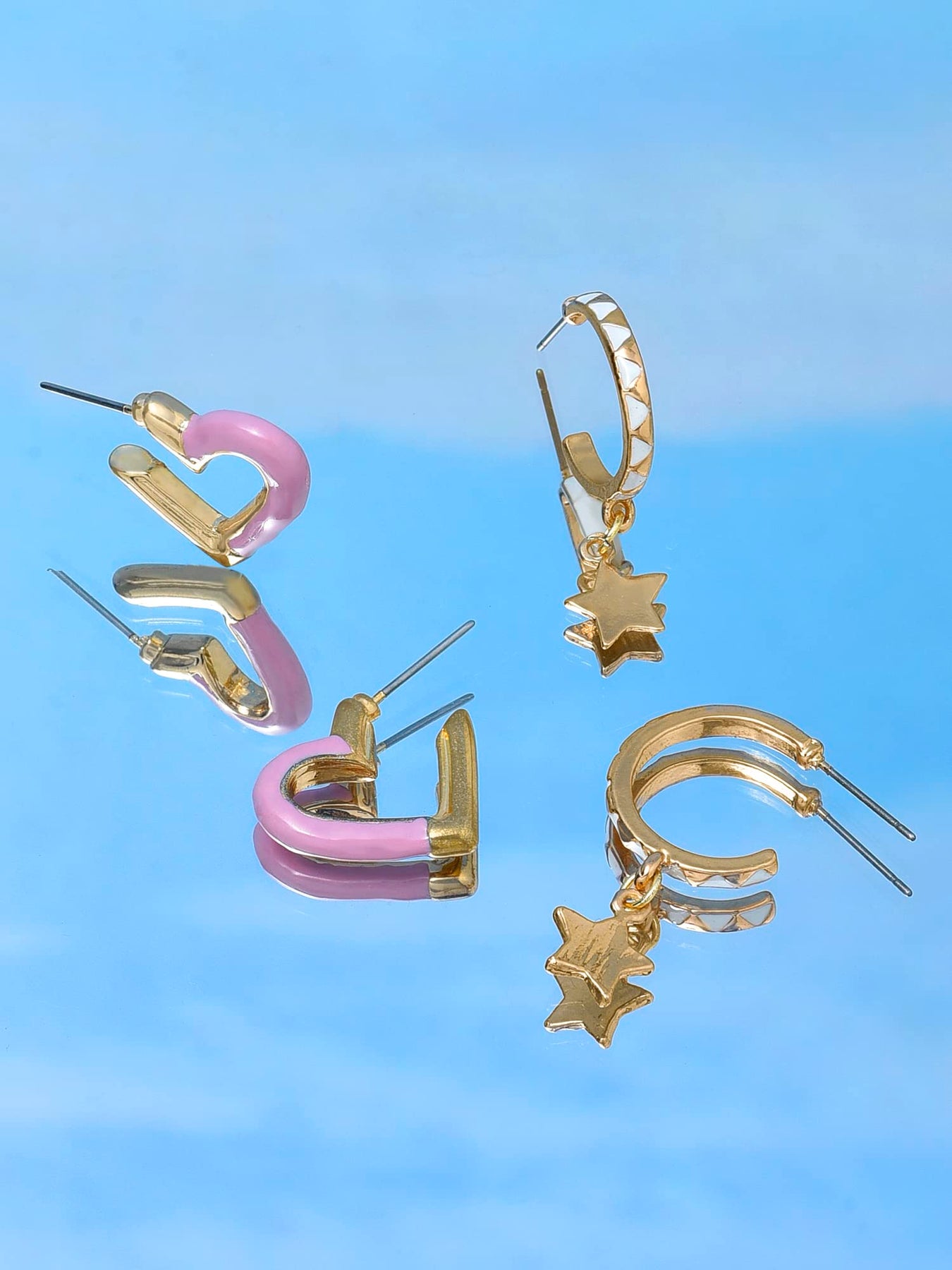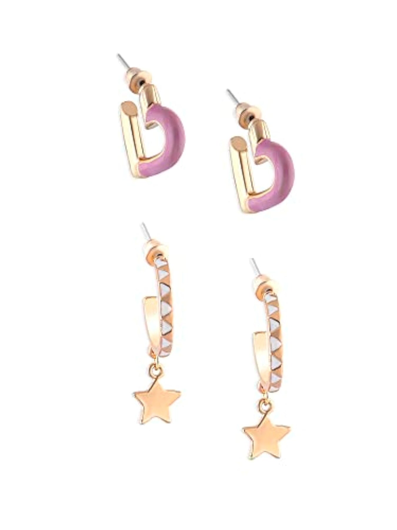Add a touch of contemporary style with this set of 2 pink heart enamel star hoop earrings. These semi hoops are perfect for women who love unique and trendy accessories.