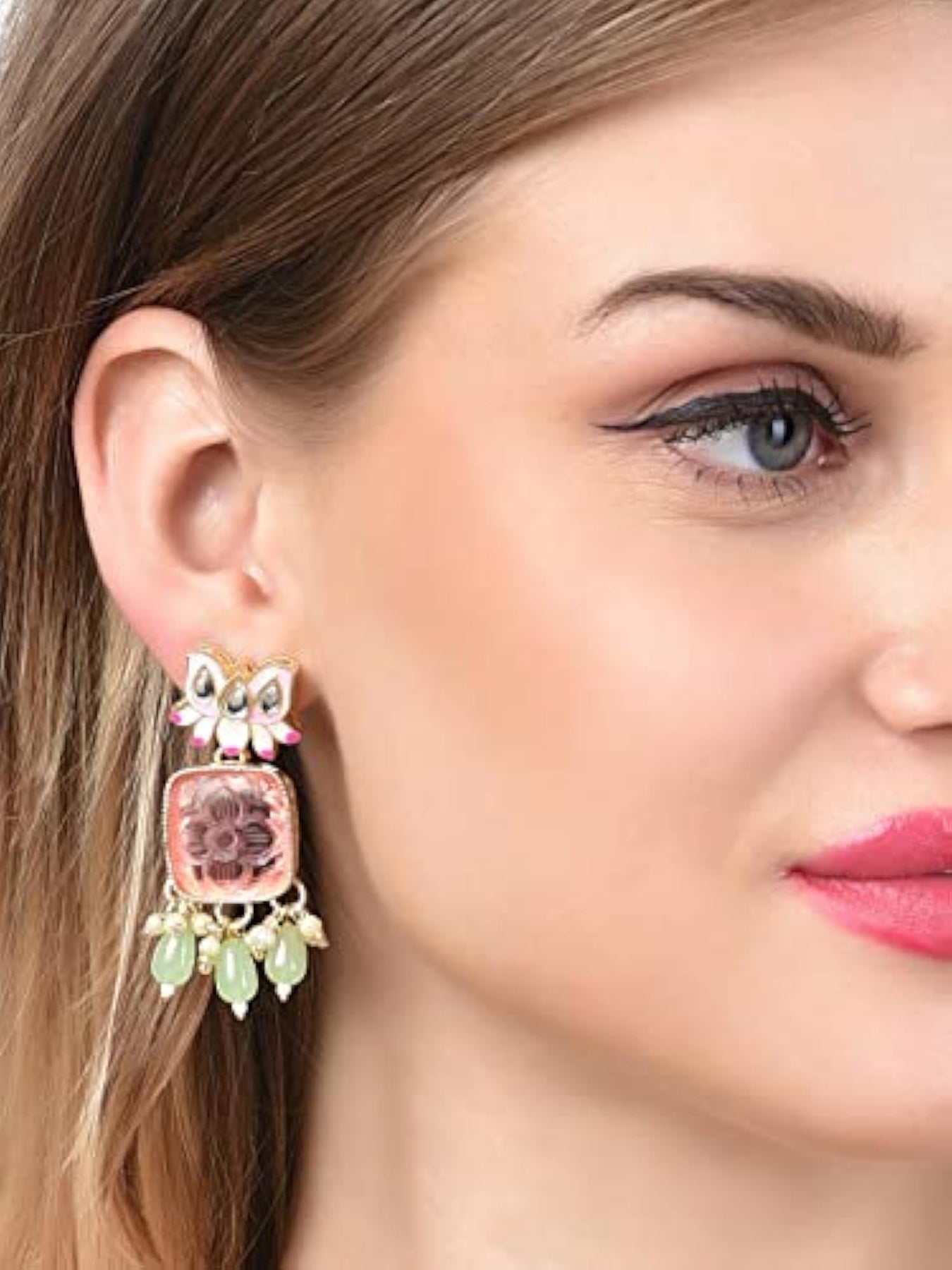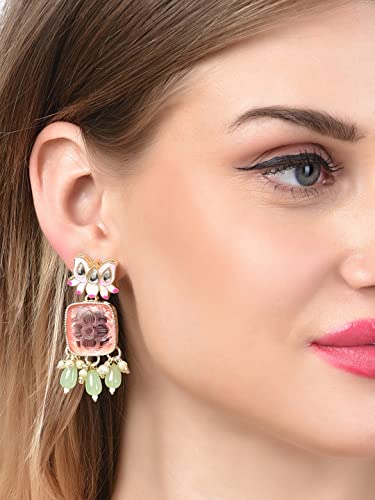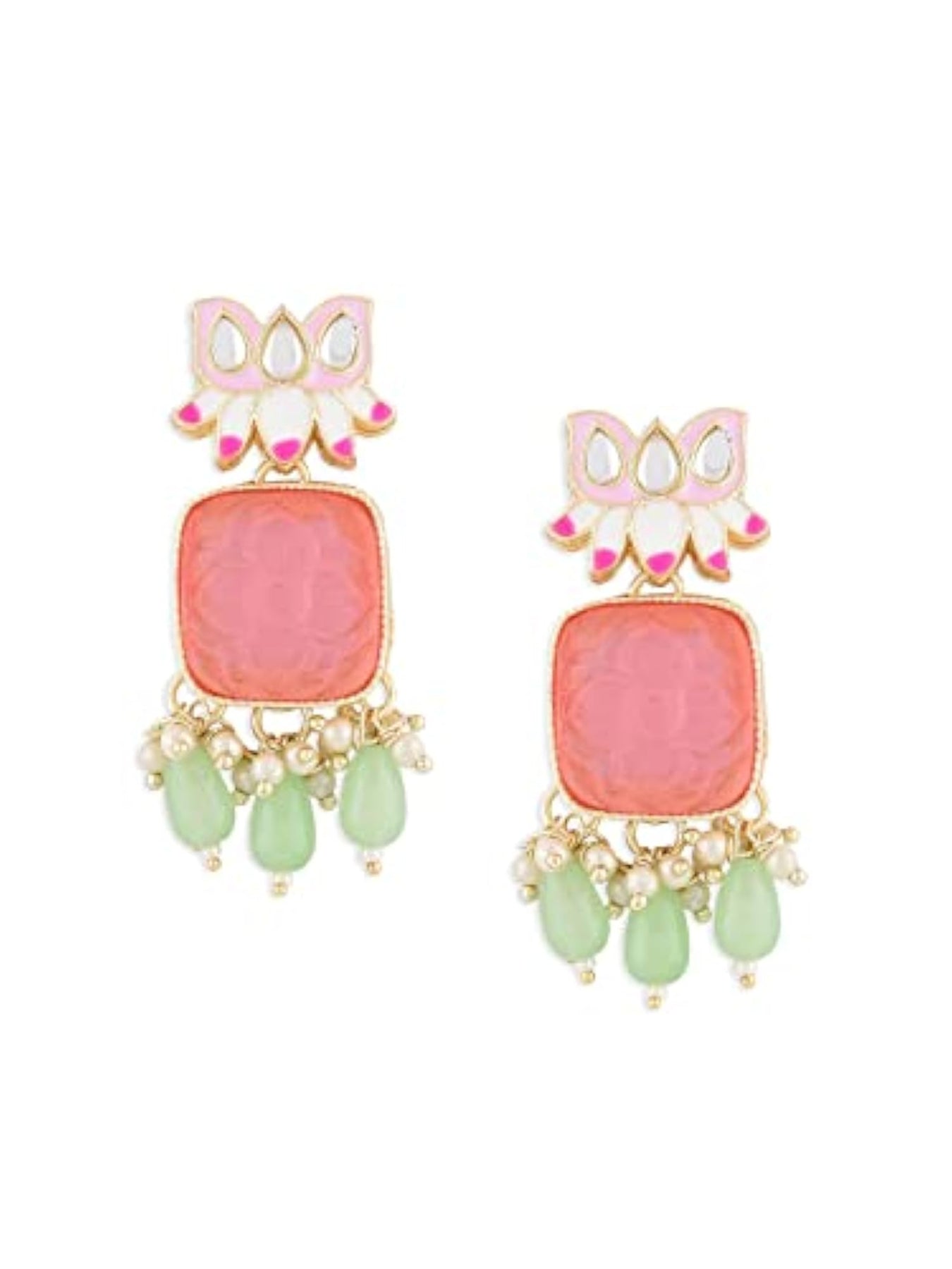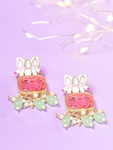 This stunning earring features a pink Meenakari lotus design with green beads and yellow drop, perfect for women who love ethnic jewelry.