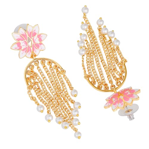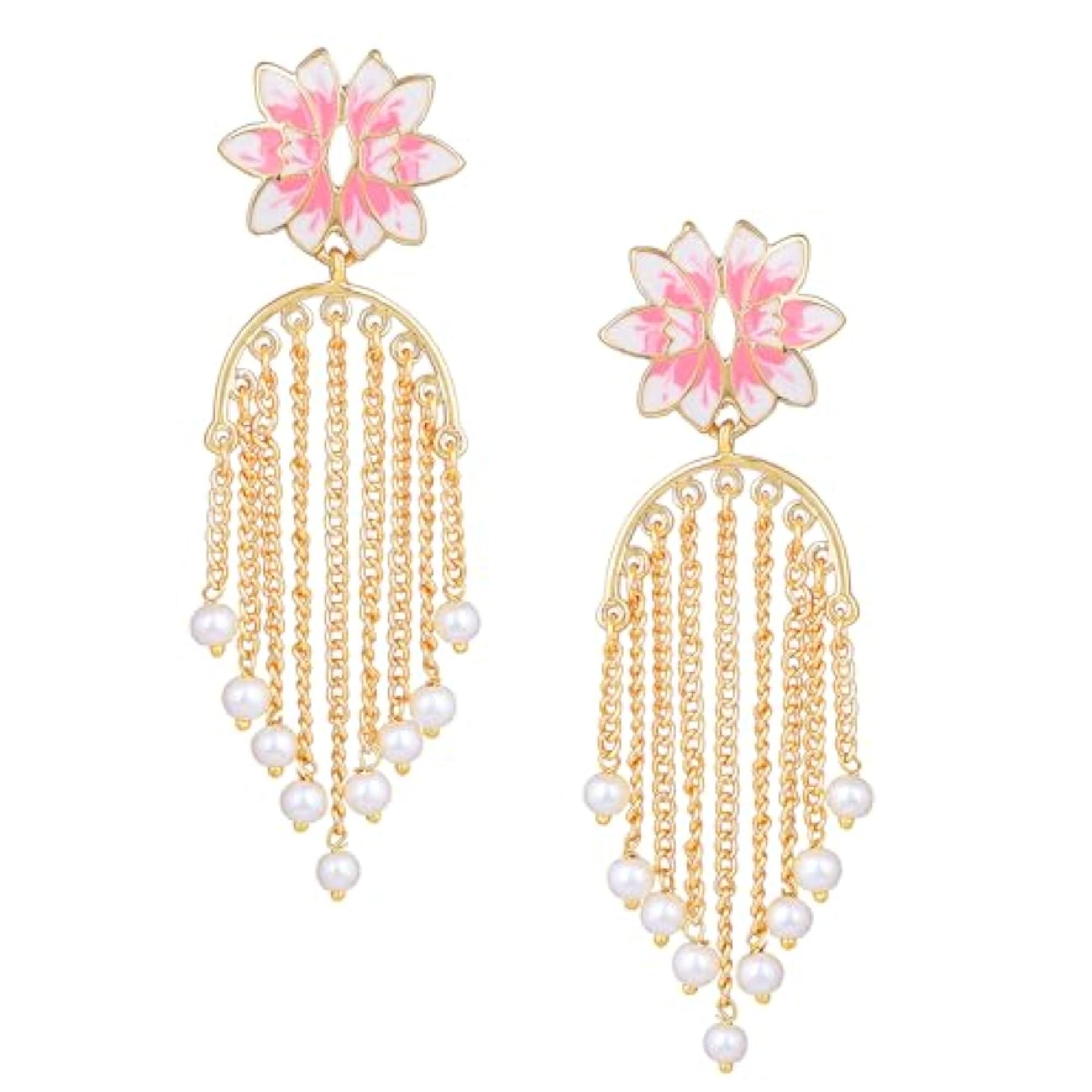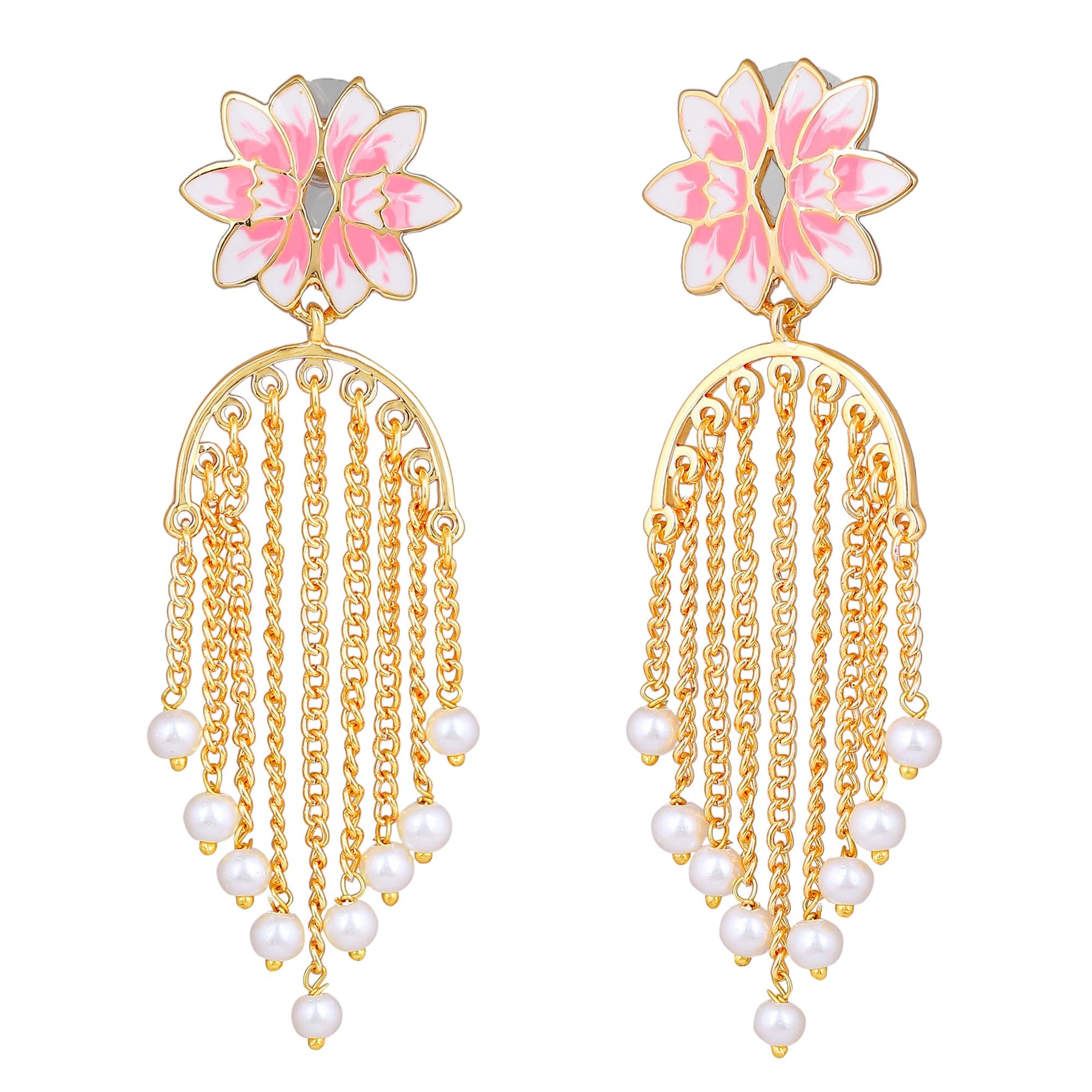 These splendid earrings feature a pink lotus design with enamel and a dangling pearl drop. Versatile for any occasion.