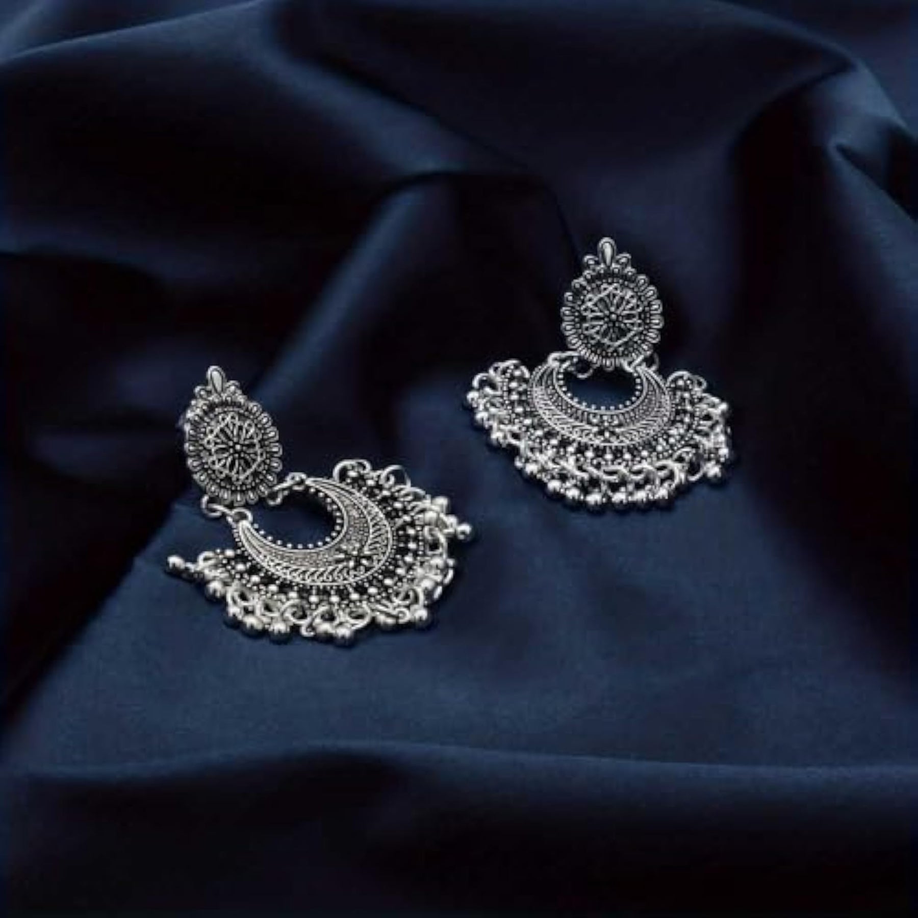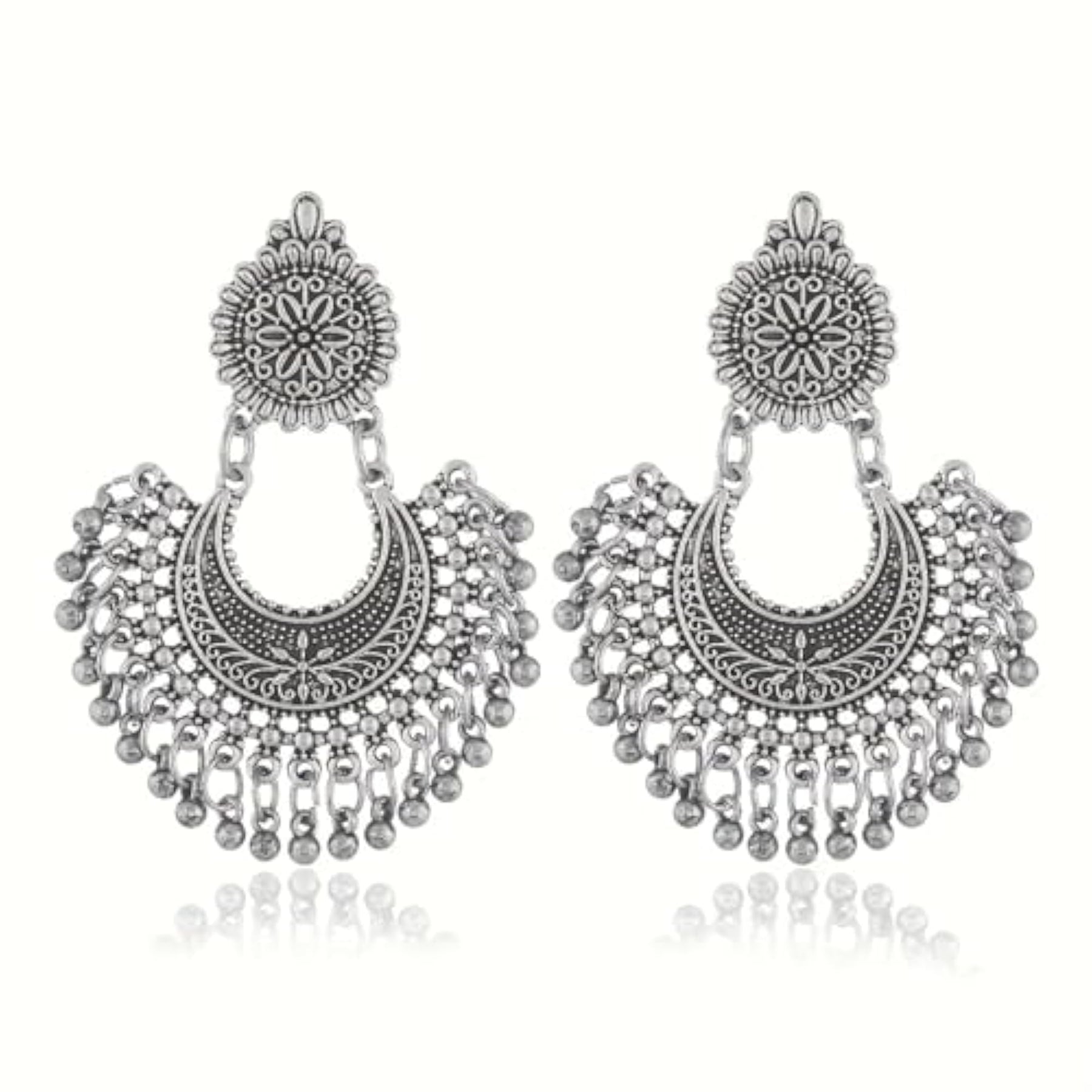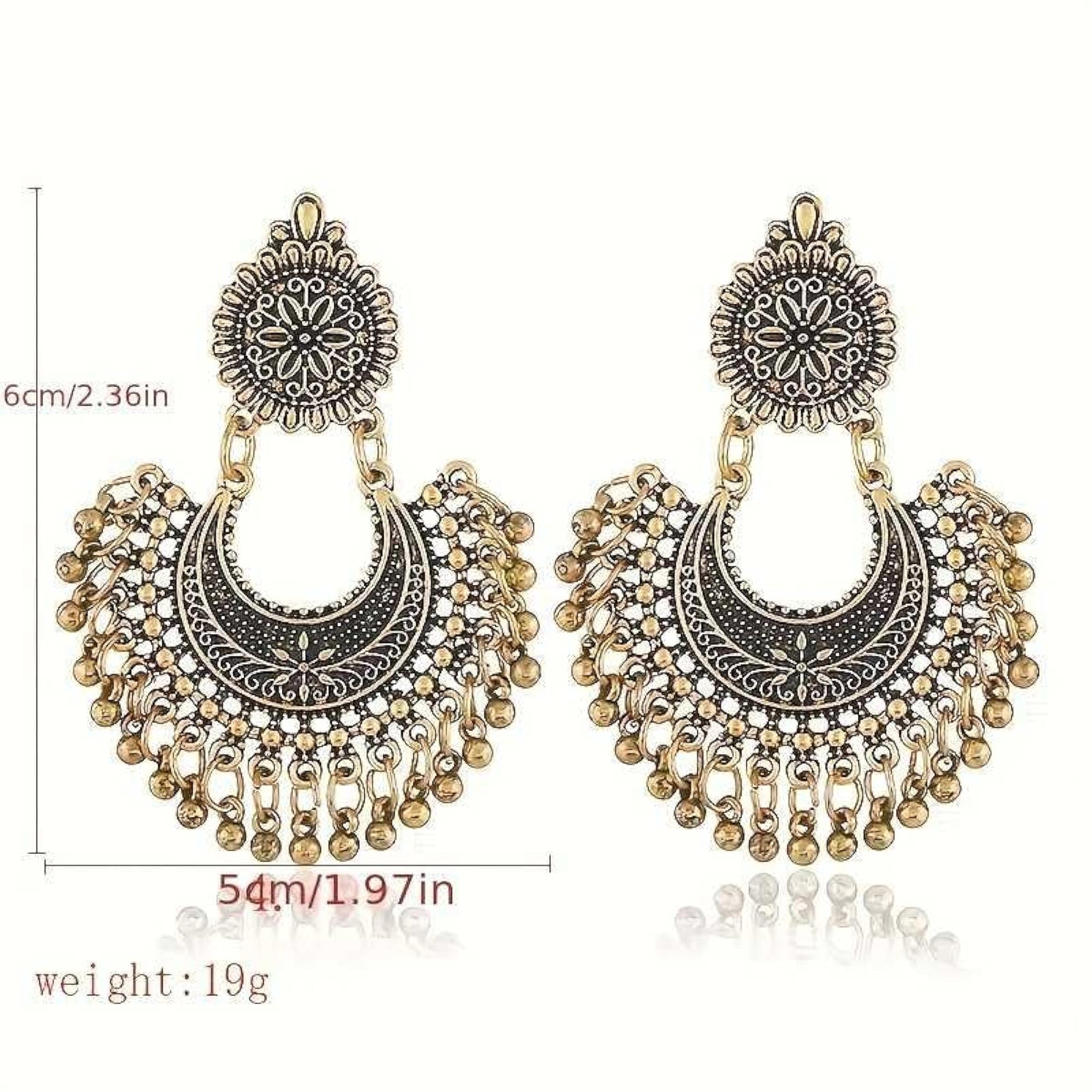 Elevate your style with these bohemian plated floral crescent earrings that feature dangling beads and bell tassel. Perfect for a fan-shaped earring look.
