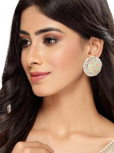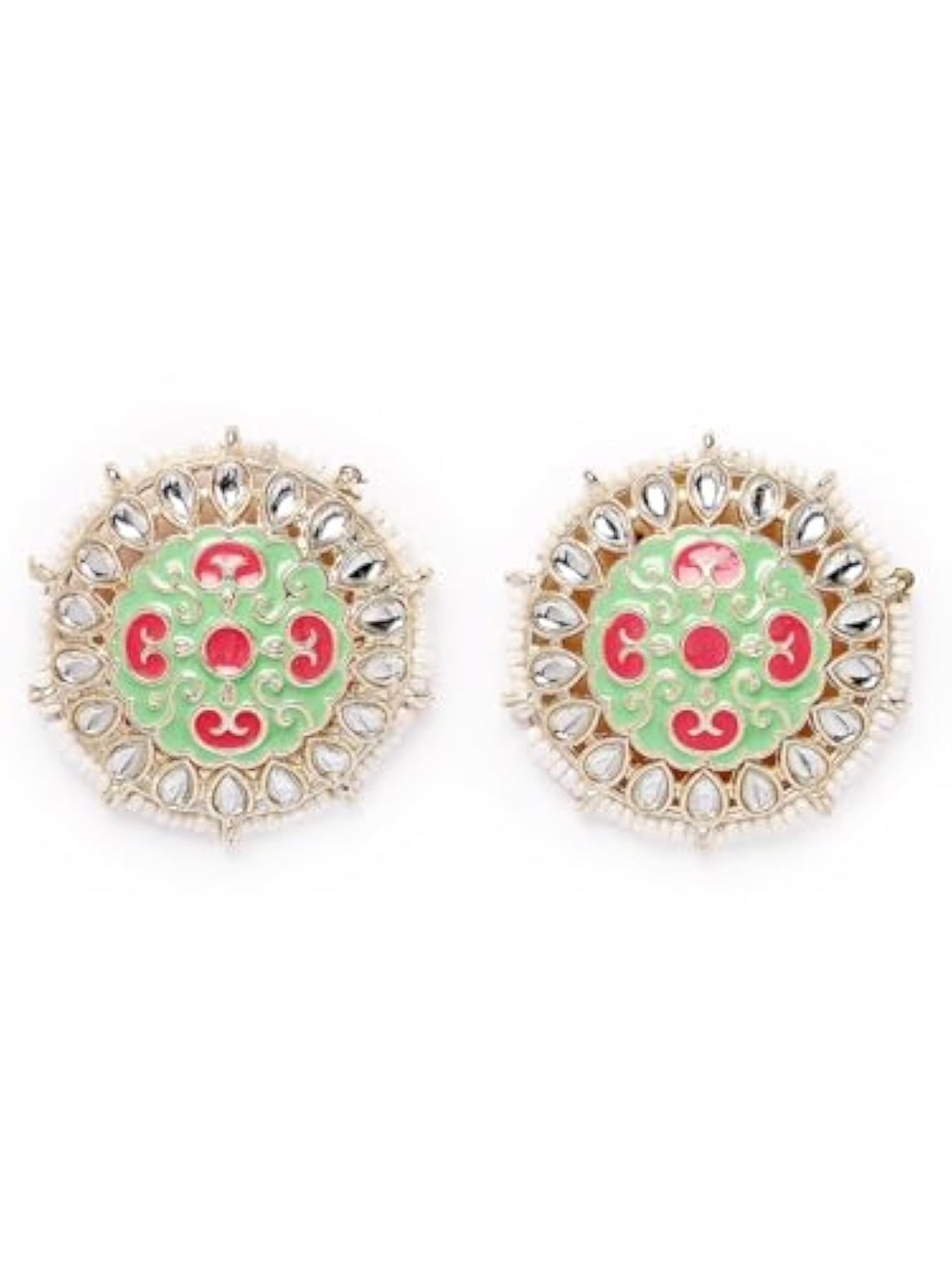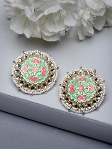 Elegant plated Kundan earrings featuring mint green and pink Meenakari studs. Perfect for any occasion.