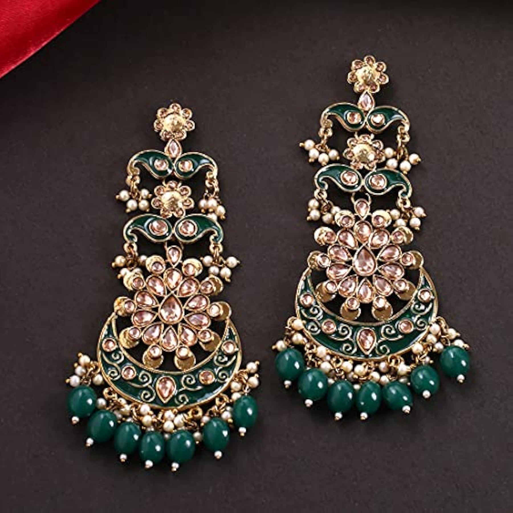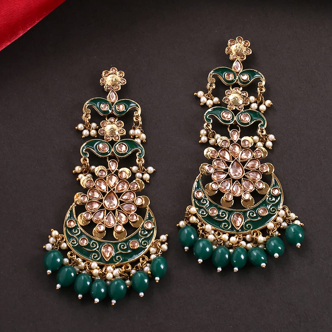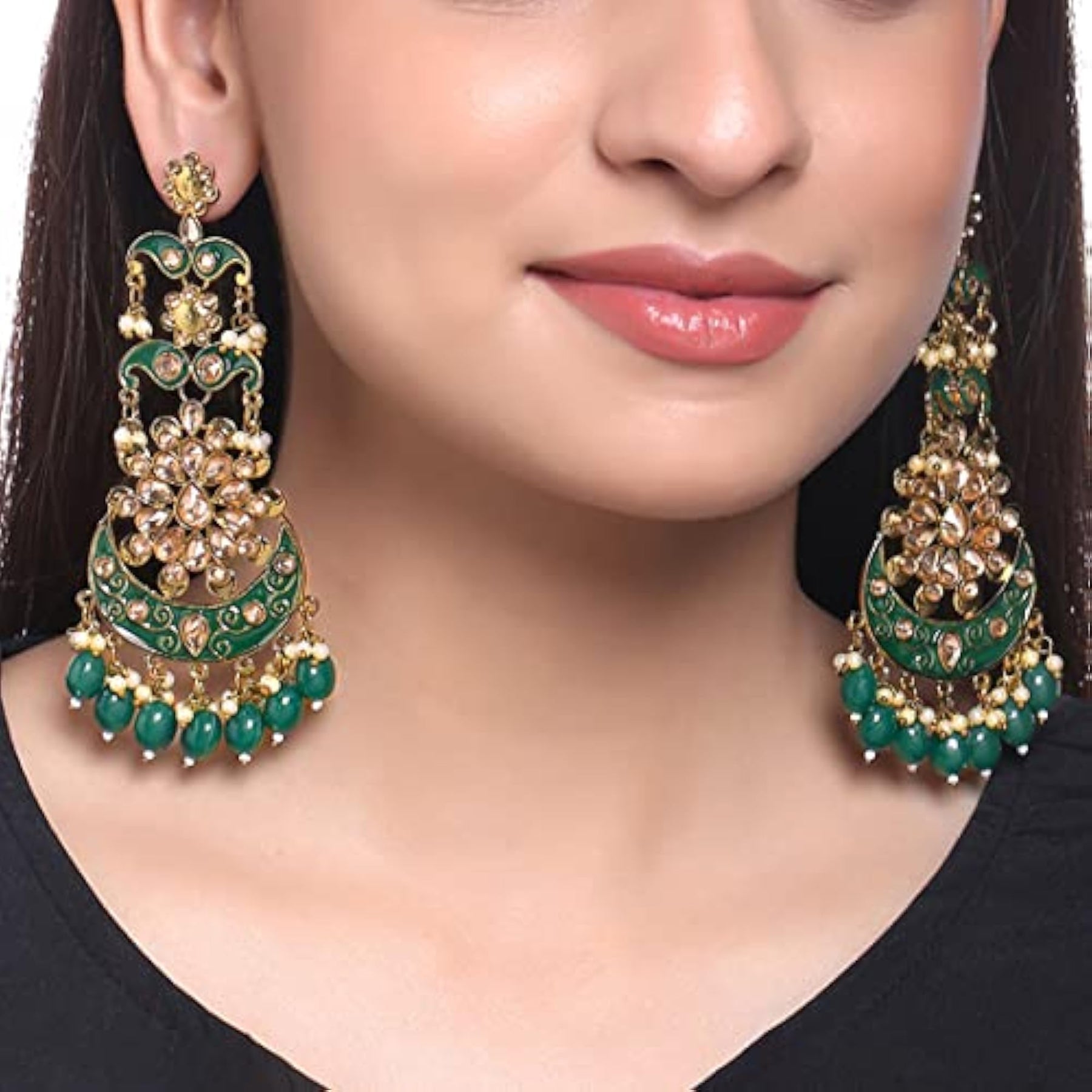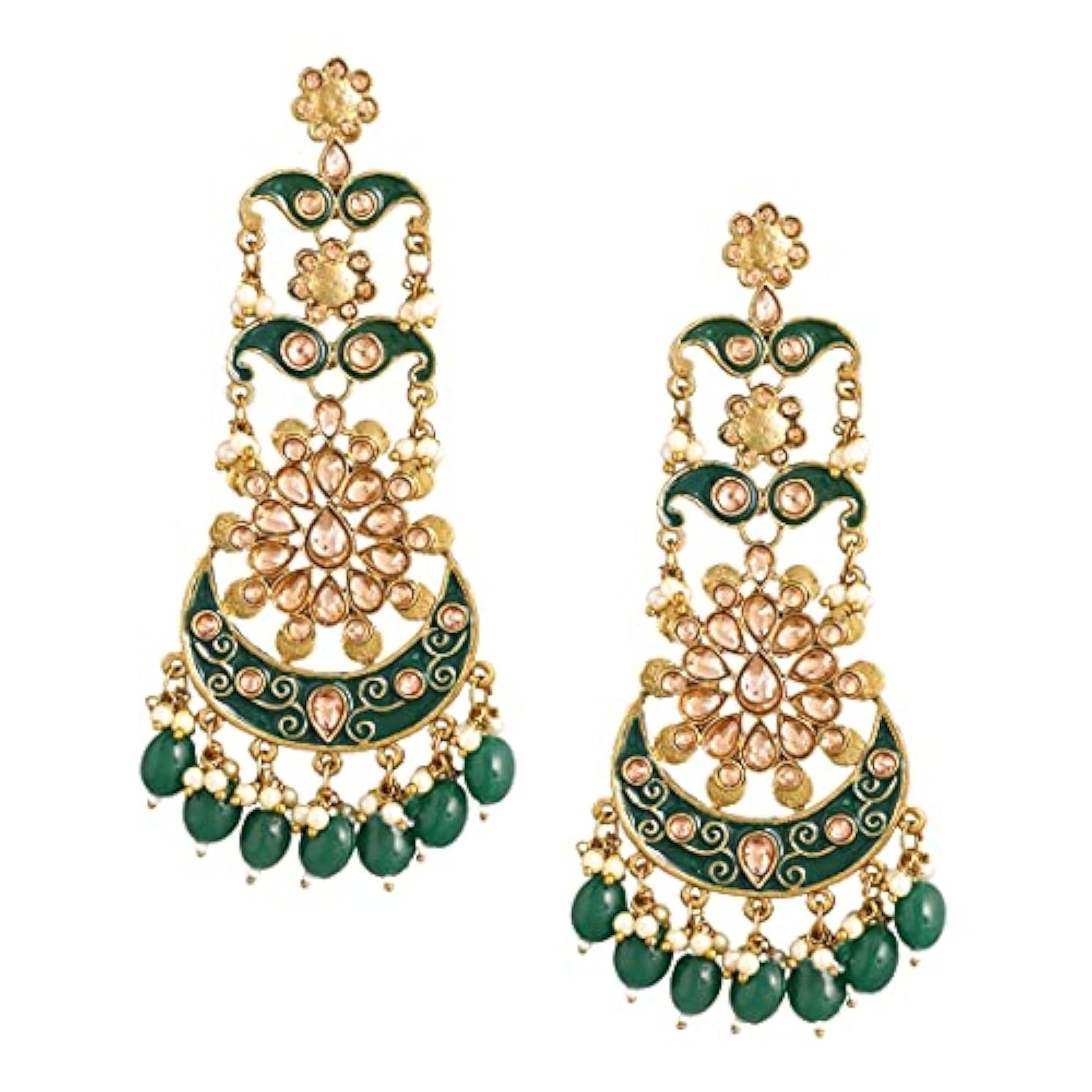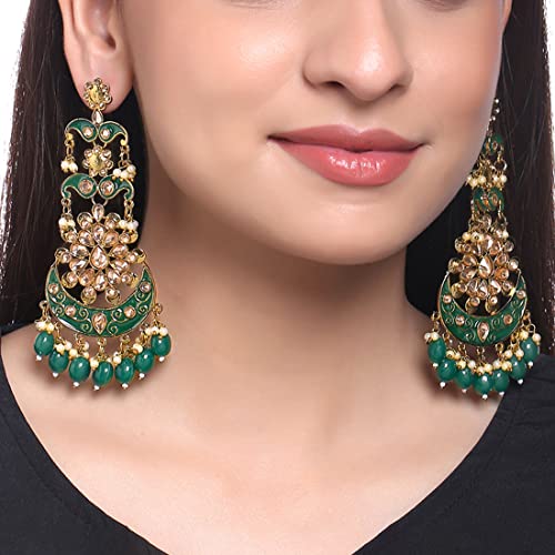 These stunning danglers feature intricate green Meenakari work and Kundan accents for a traditional touch.