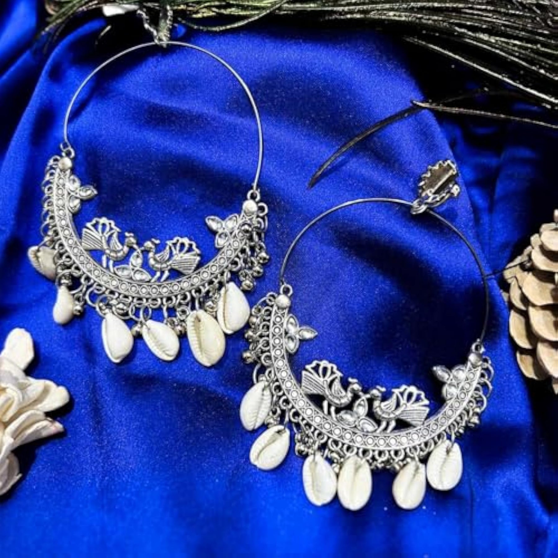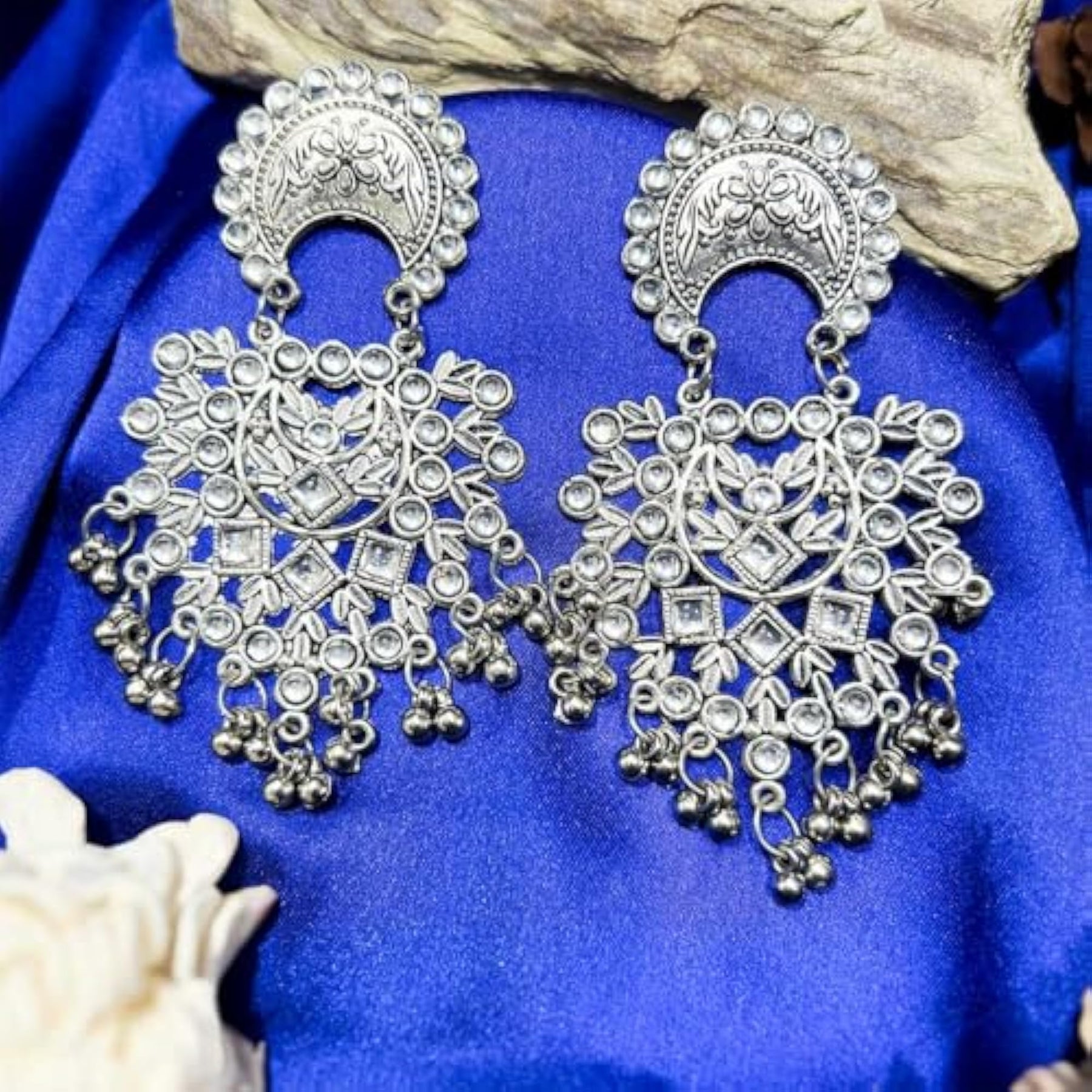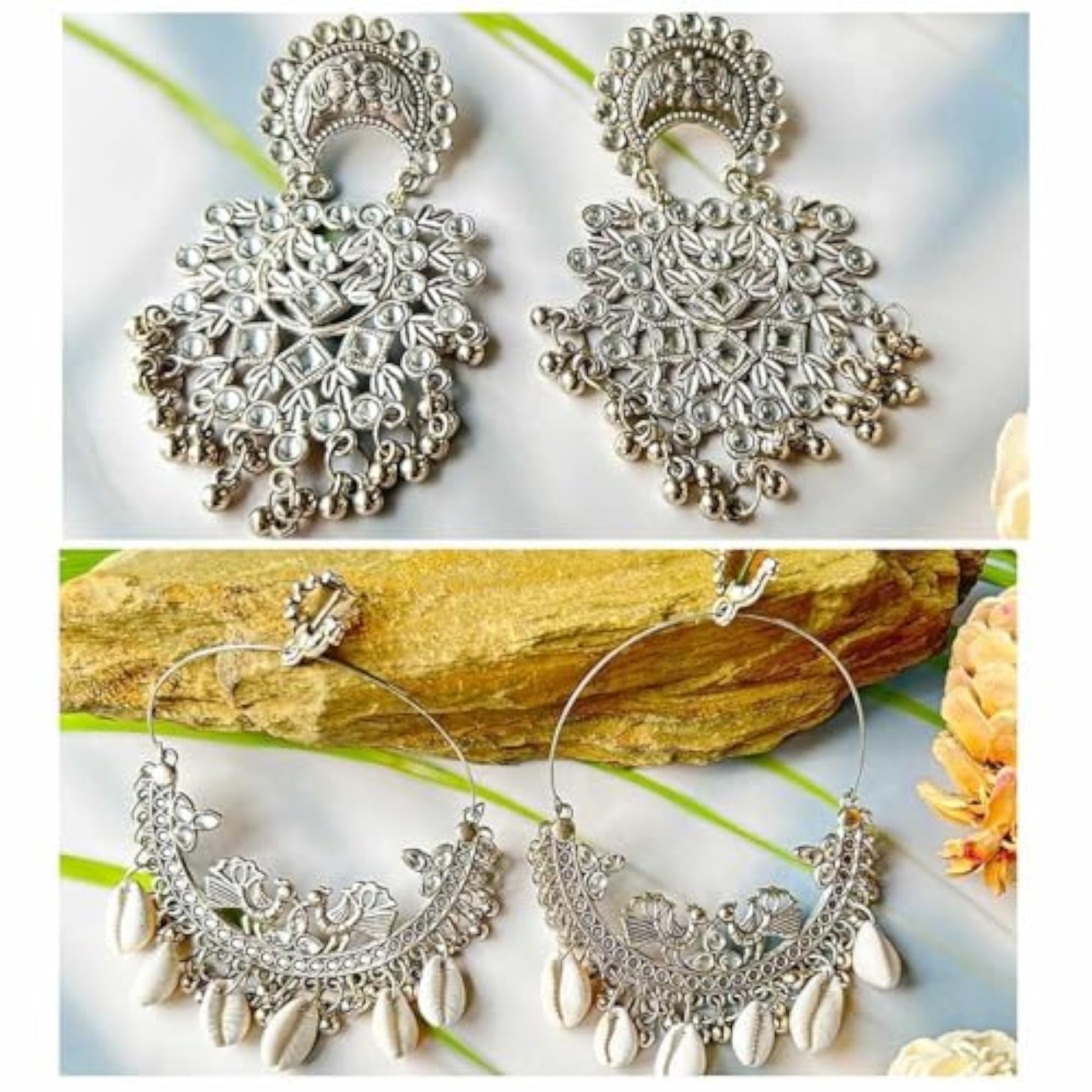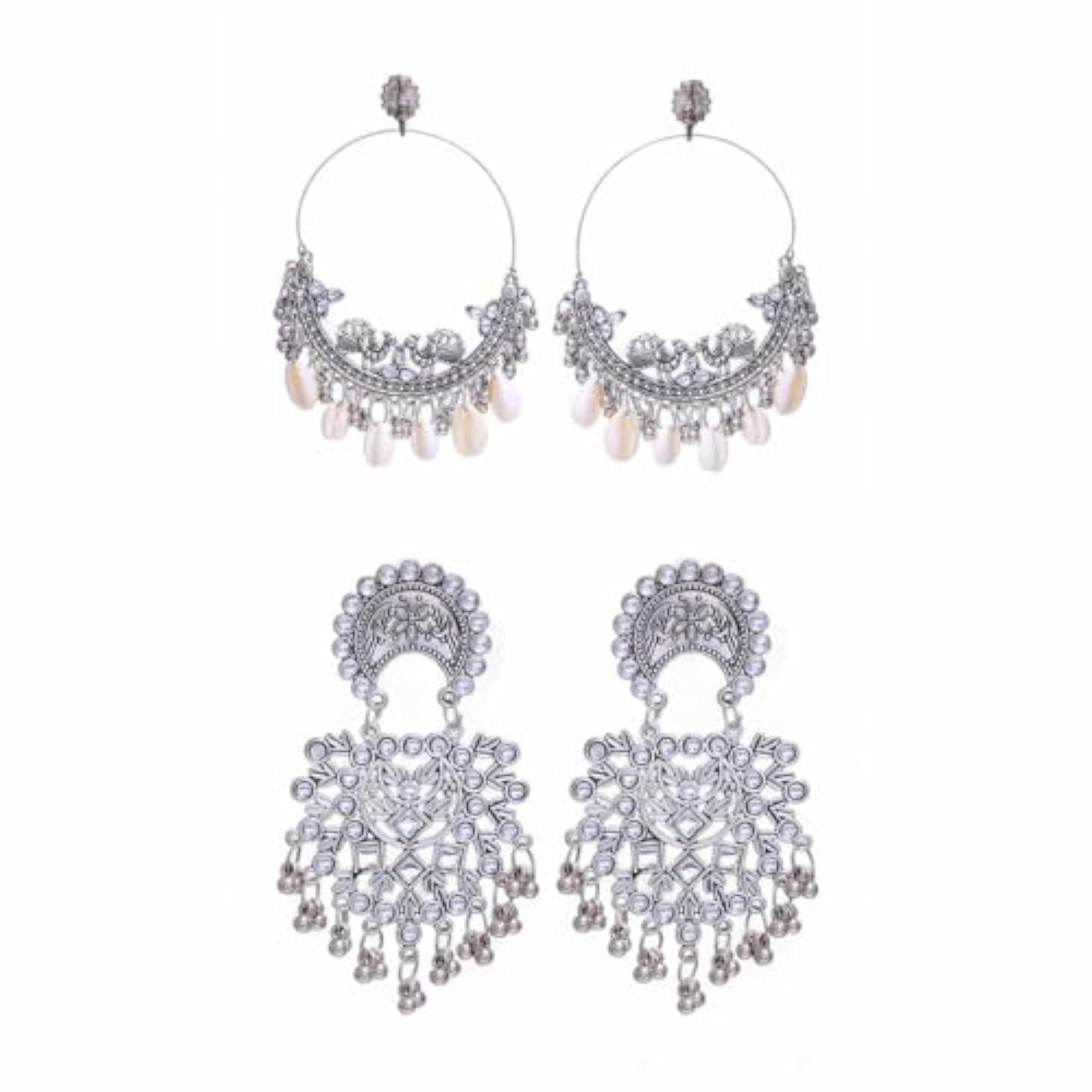 This set includes 2 stylish oxidised dangling earrings with an antique touch. They are made with hypoallergenic metal.