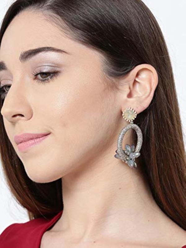 These stunning circular drop earrings feature stones studded design in a beautiful gold color. Perfect for adding a touch of elegance to your outfit.