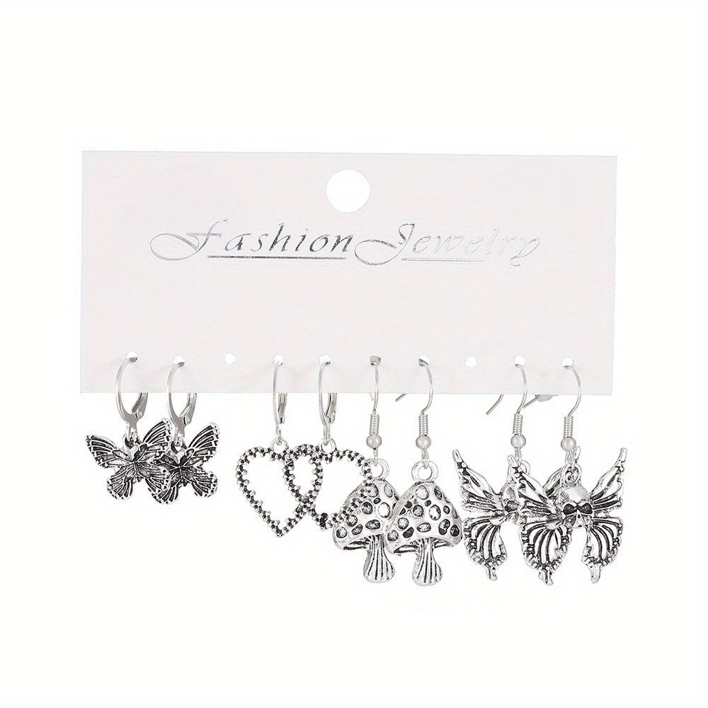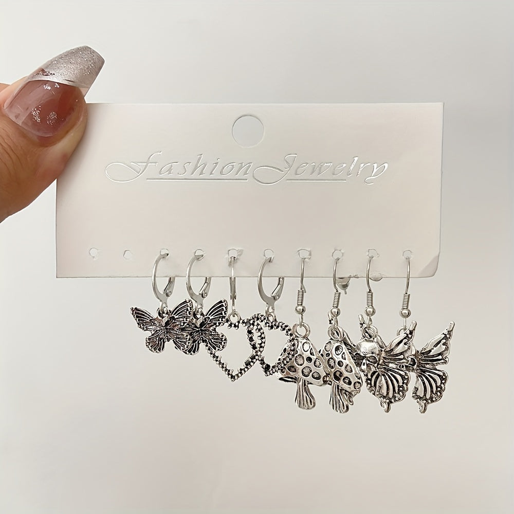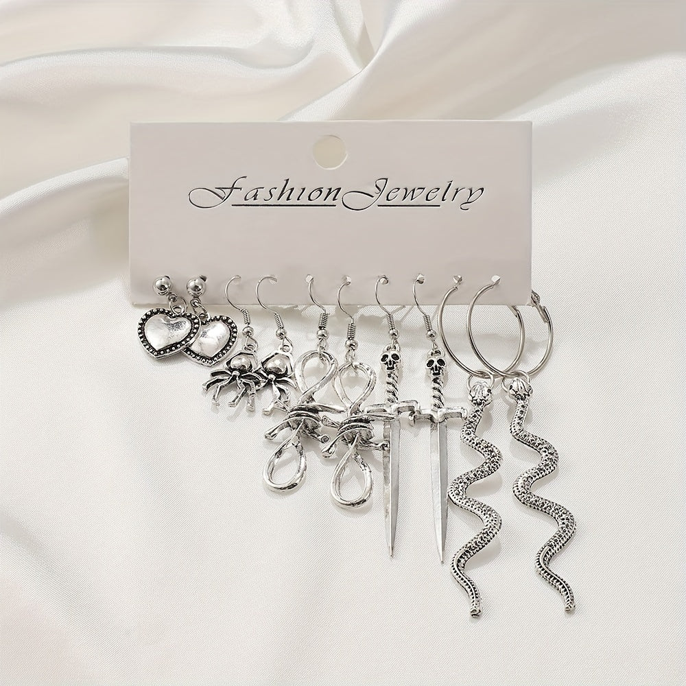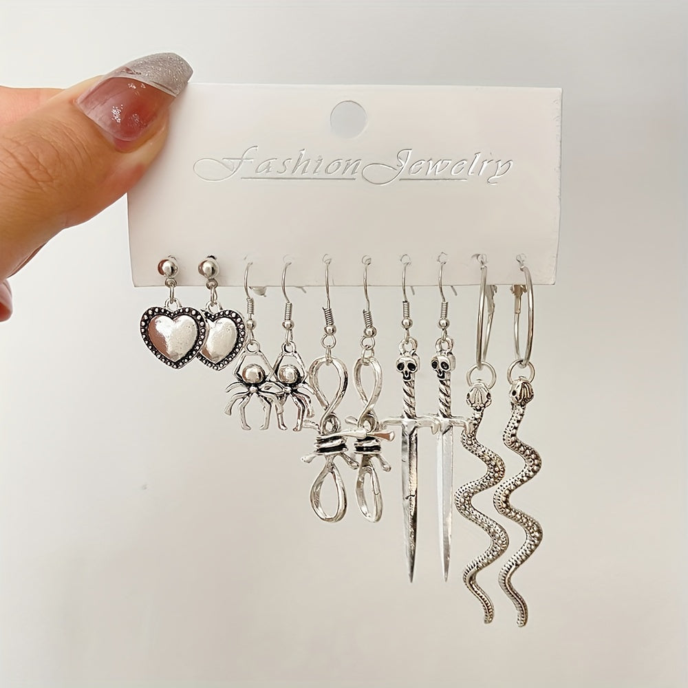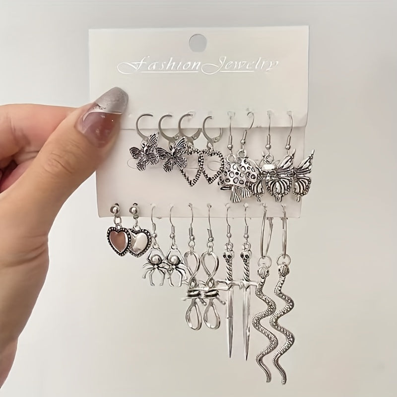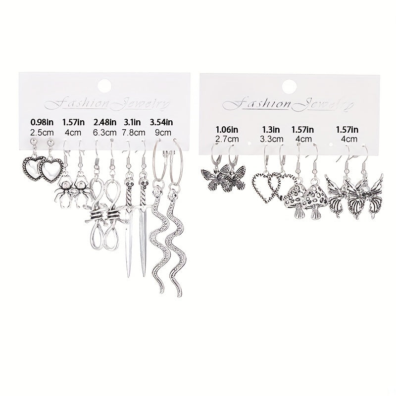 This set includes a heart, butterfly, snake, sword, spider, and mushroom dangle earrings in retro style perfect for Halloween.