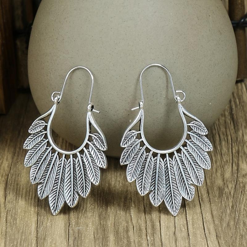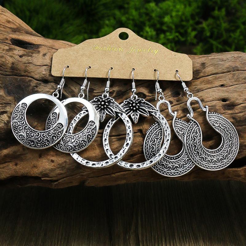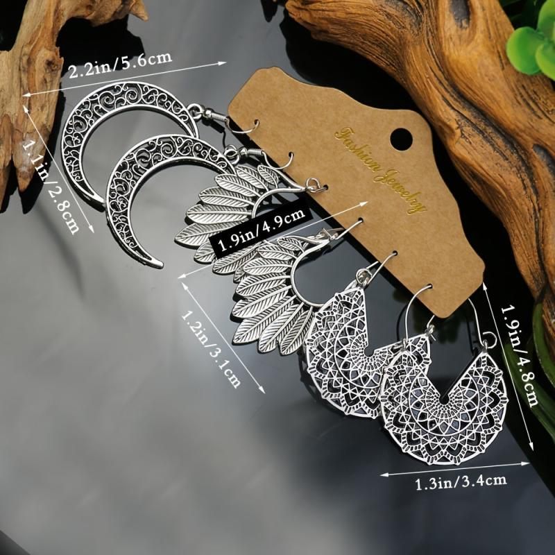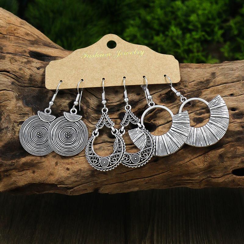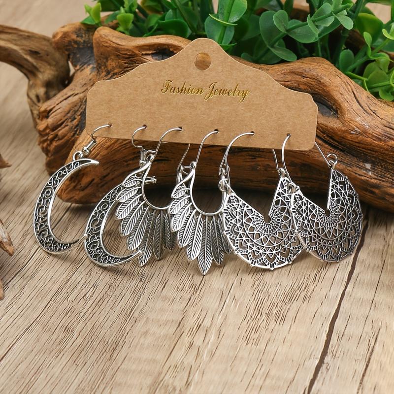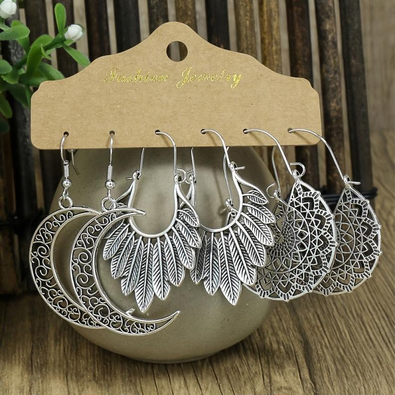 Add a touch of vintage charm with this set of 3 pairs of earrings featuring geometric, leaf, and hollow pendant designs. The antique silver finish adds a classic appeal to your look.