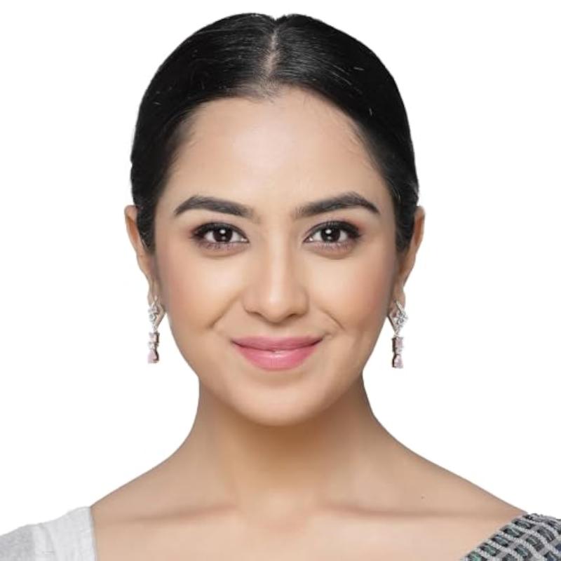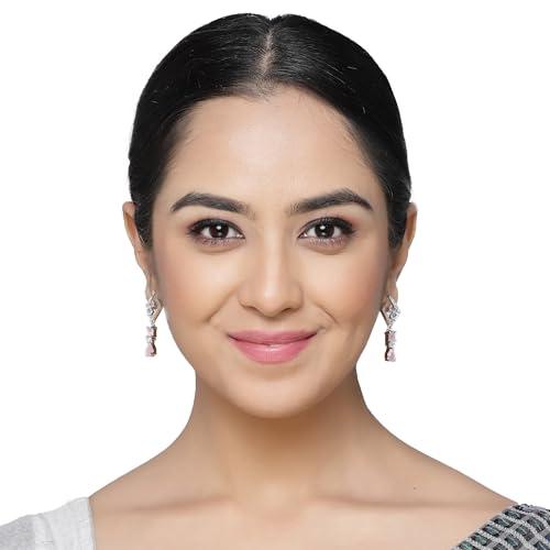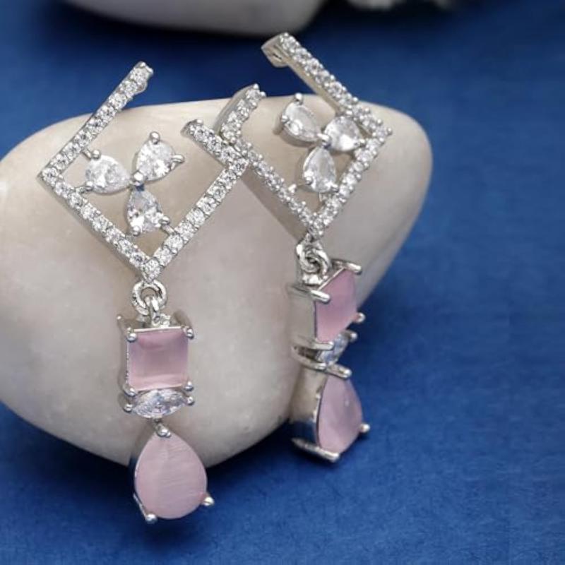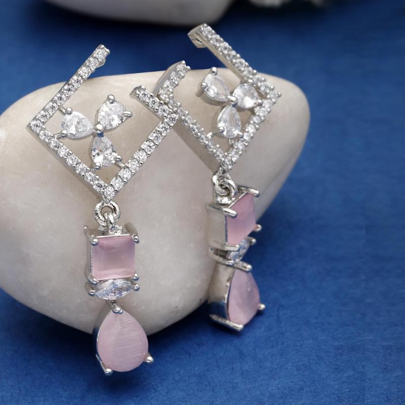 Elegant rhodium-plated earrings with American diamond studded square and teardrop shapes.