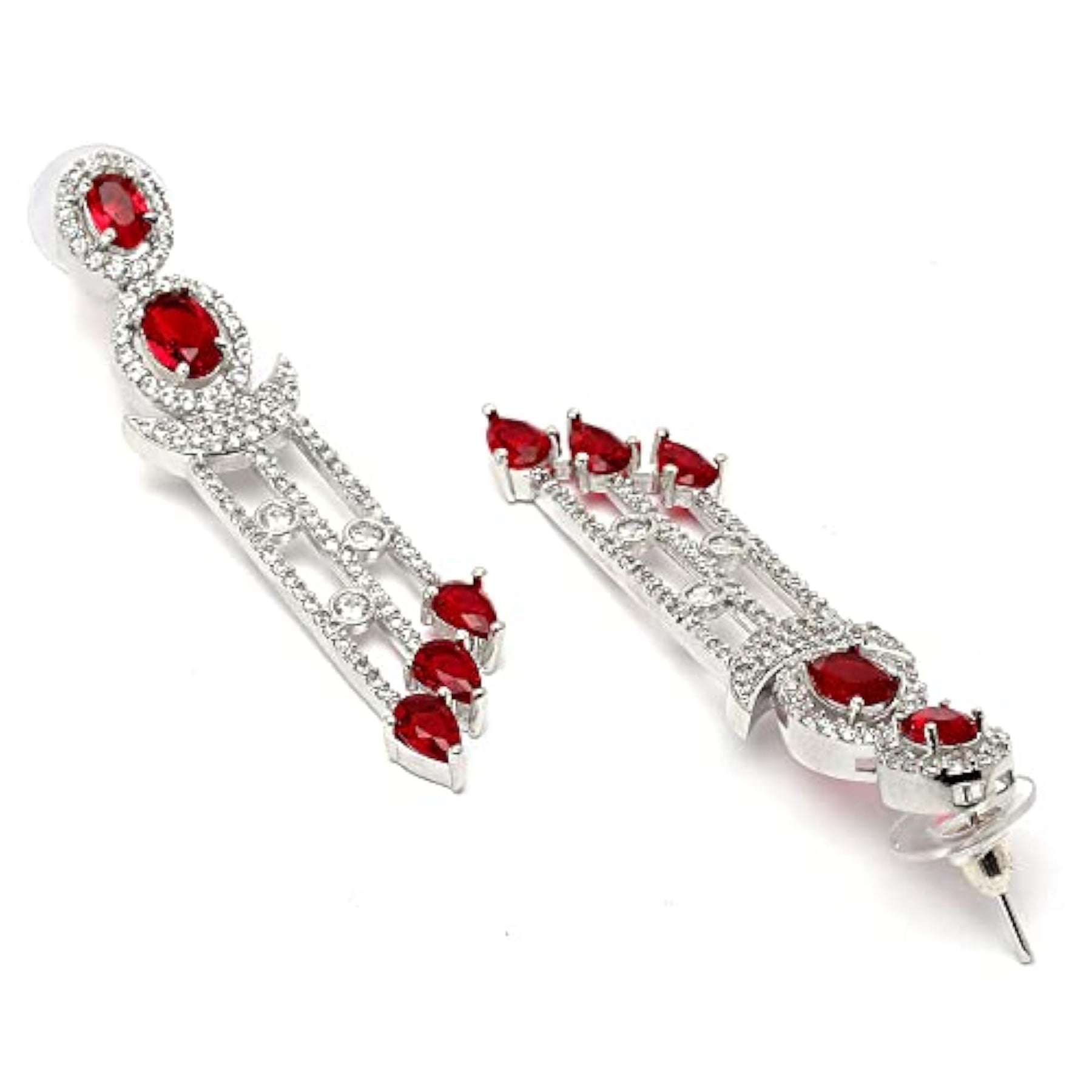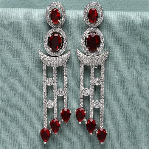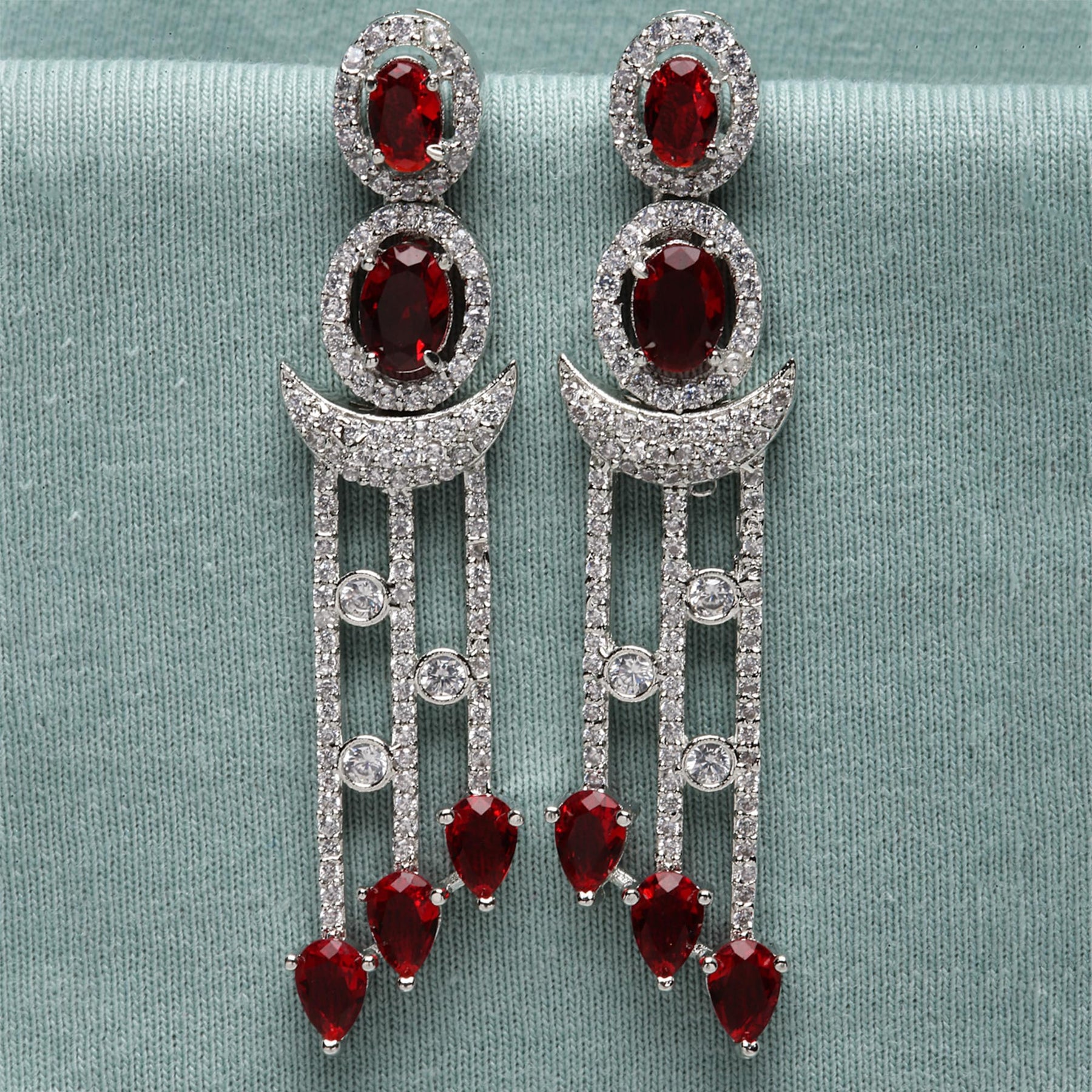 Elegant earrings featuring a crescent shape design with American Diamonds, plated with rhodium for a luxurious finish.
