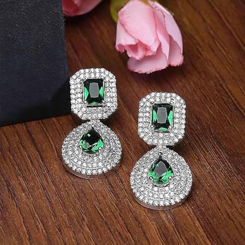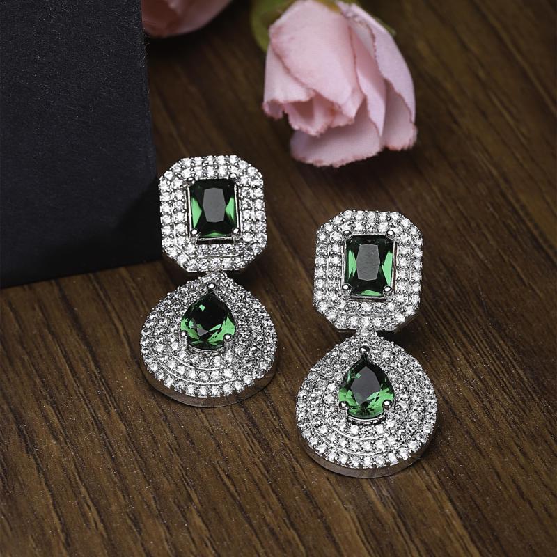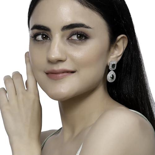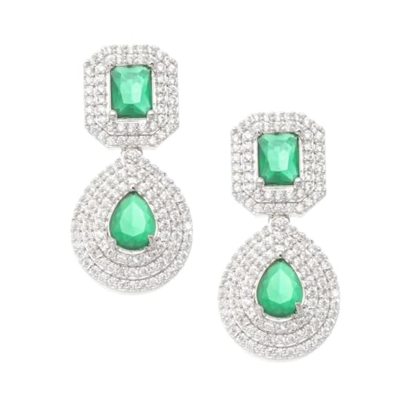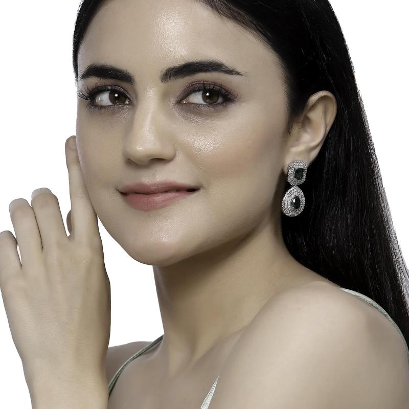 Enhance your style with these elegant drop earrings featuring a square and teardrop design. The rhodium plating adds a touch of sophistication, while the American diamond studding provides a glamorous sparkle.