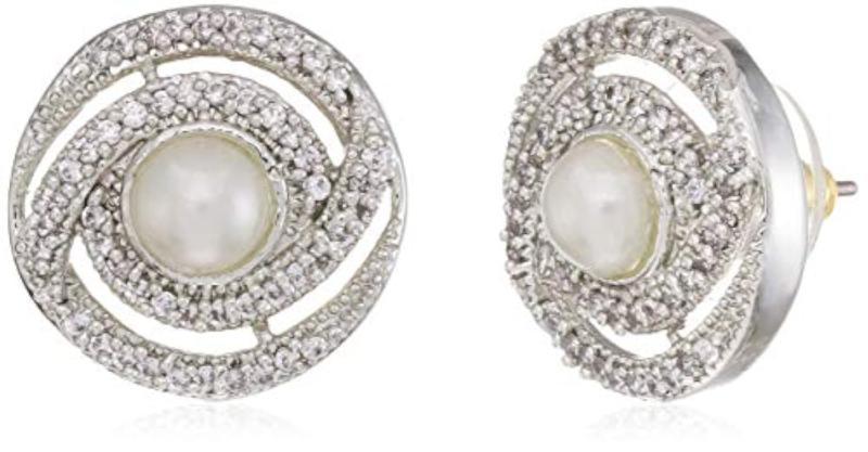 Add a touch of elegance with these beautiful rhodium-plated stud earrings featuring American diamond accents and a pearl center. Perfect for both casual and formal occasions.