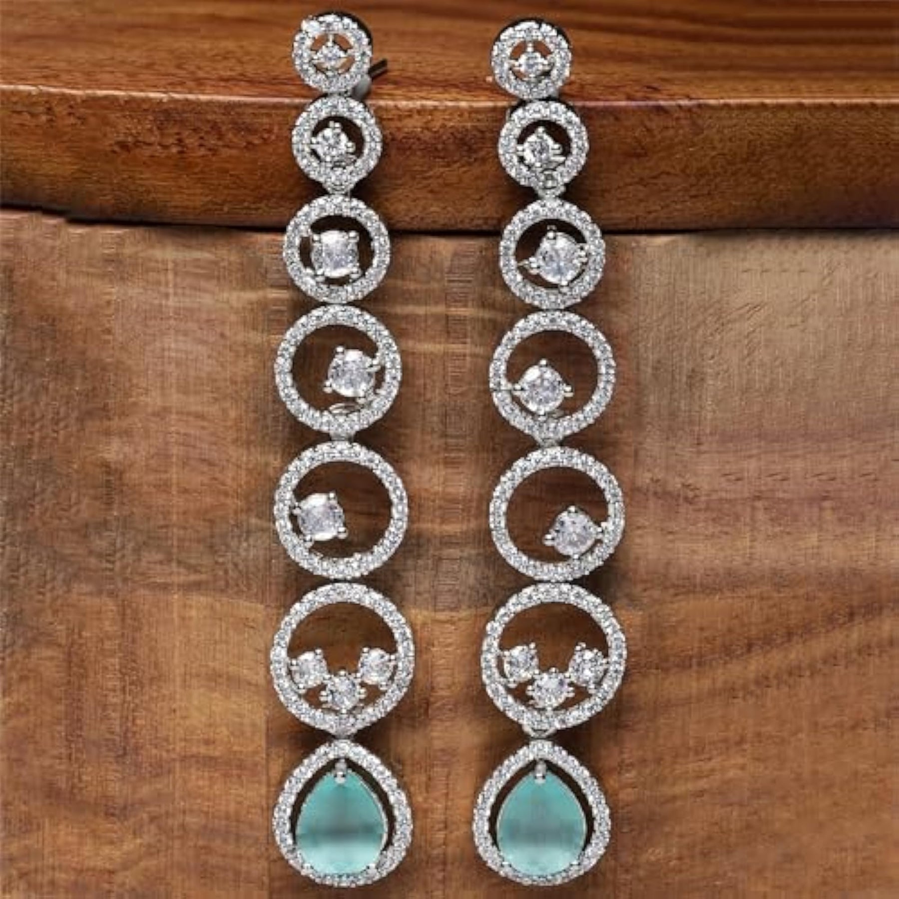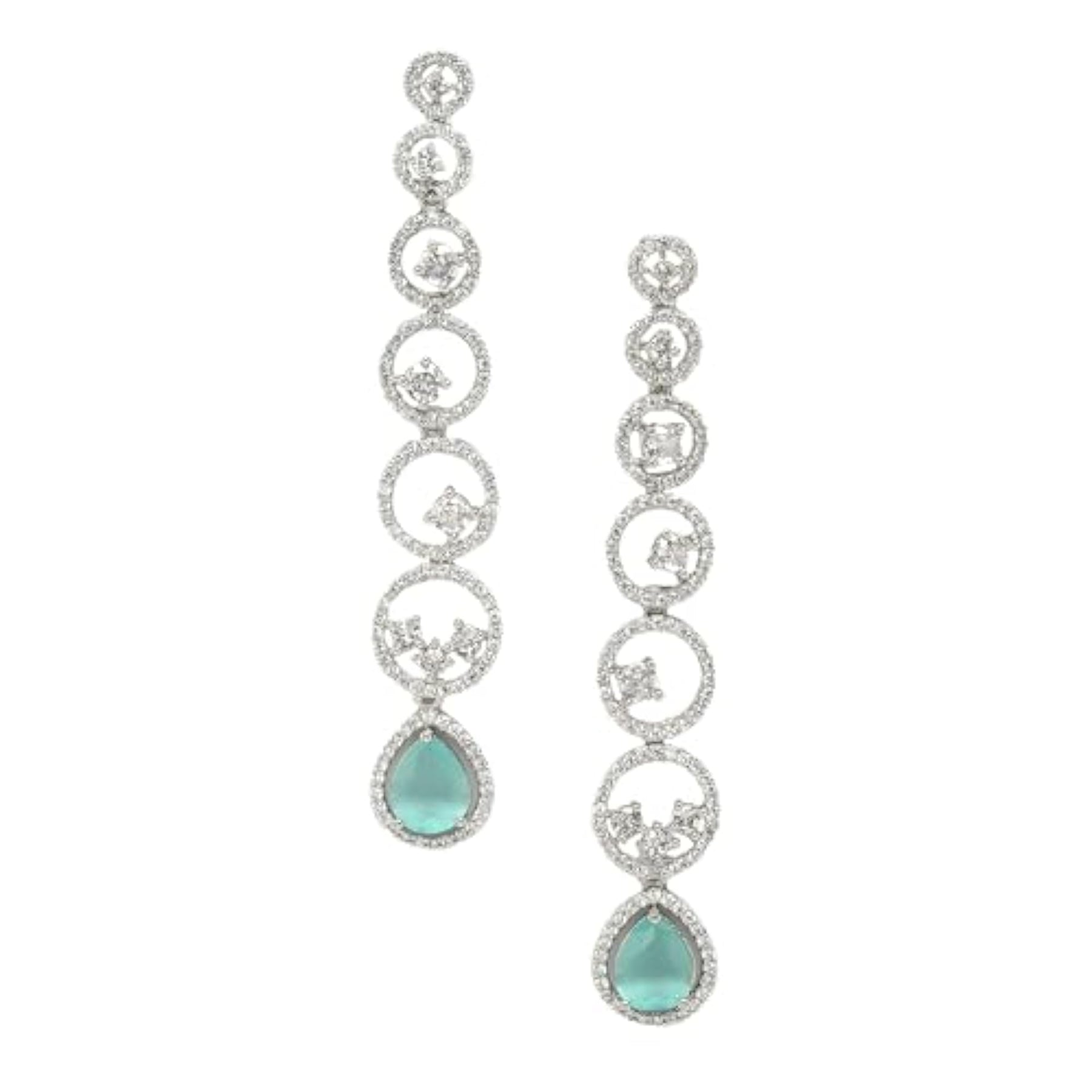 Elegant circular drop earrings featuring American Diamond studs, plated with rhodium for a classy look.