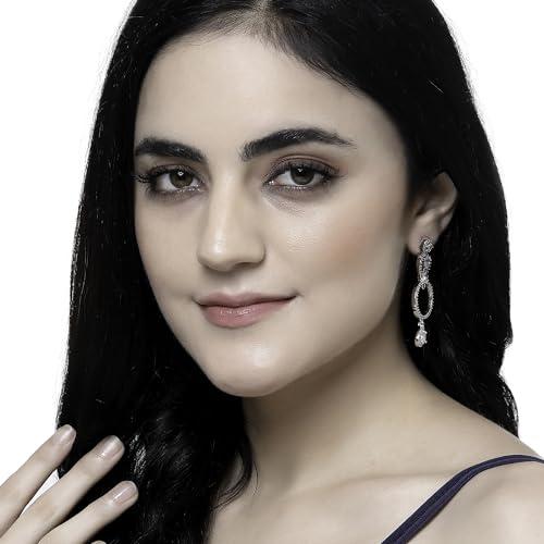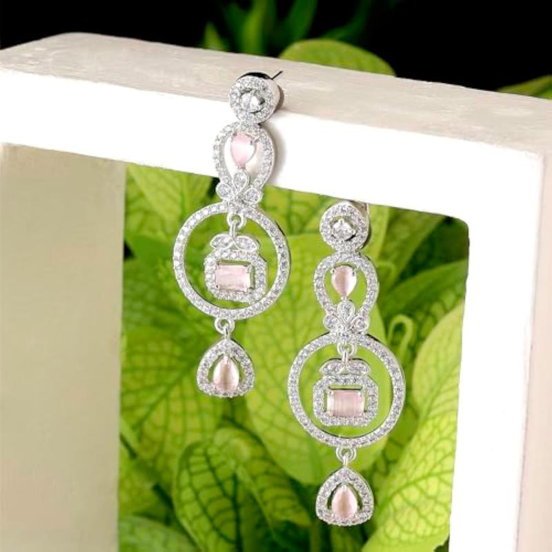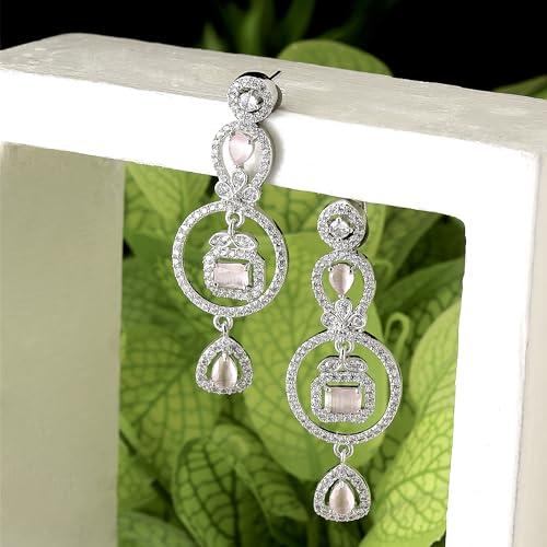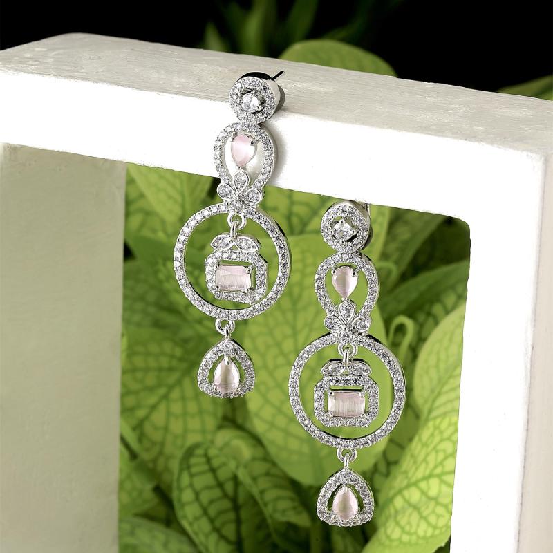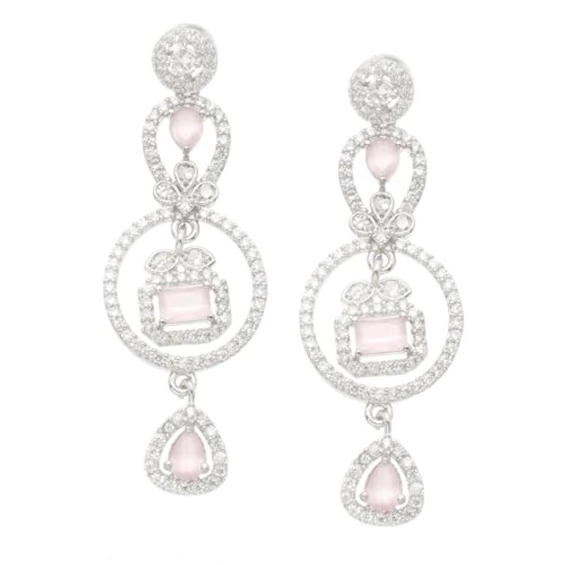 Elegant circular drop earrings with American diamond studding in a rhodium-plated finish.