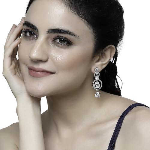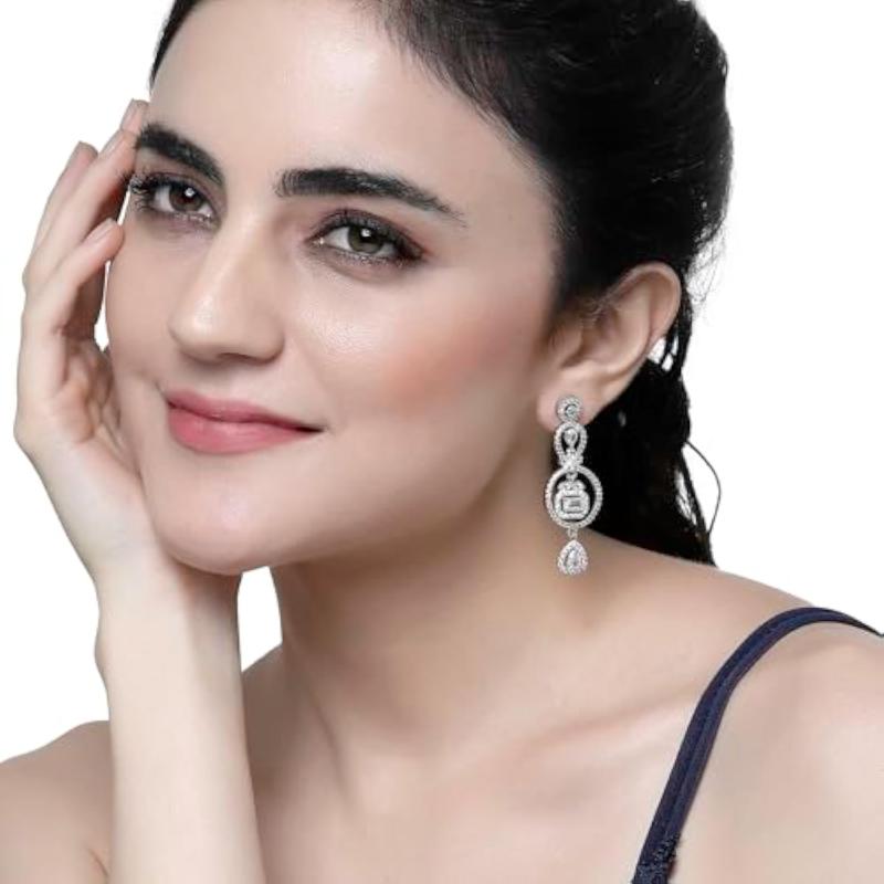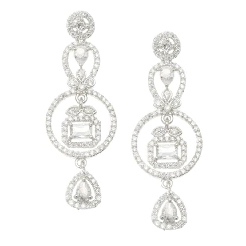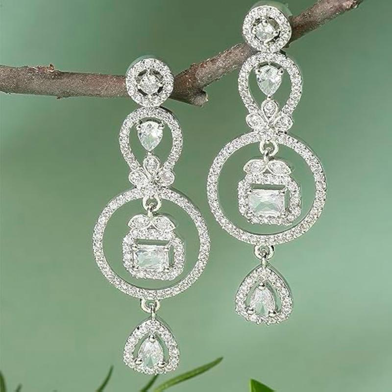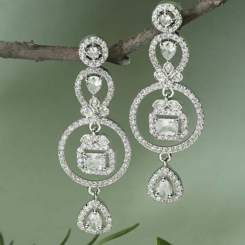 Elegant circular drop earrings with sparkling American Diamonds, plated with rhodium for a polished look.