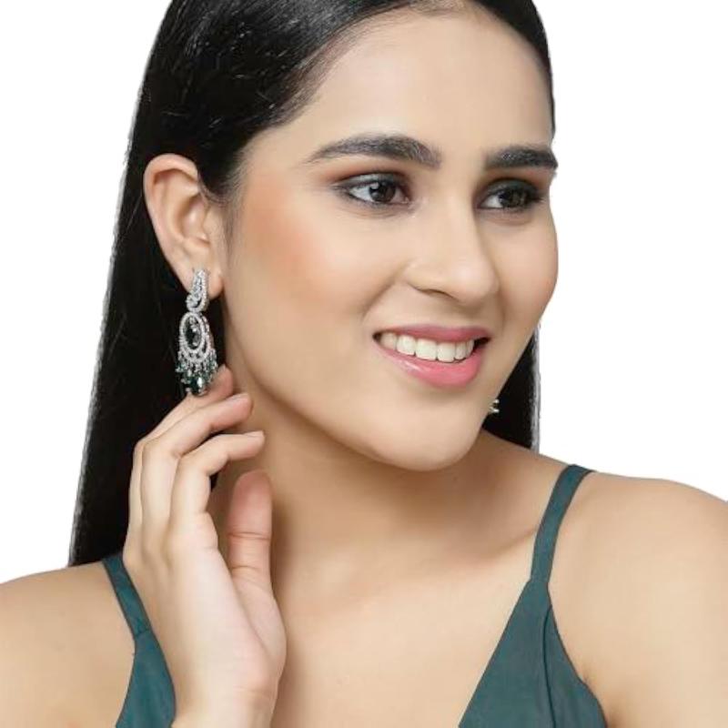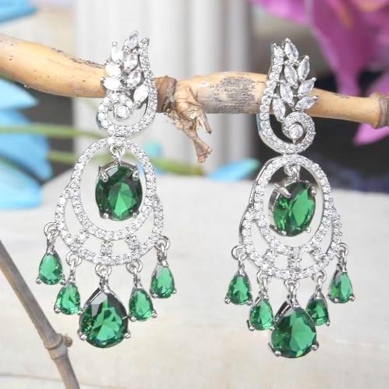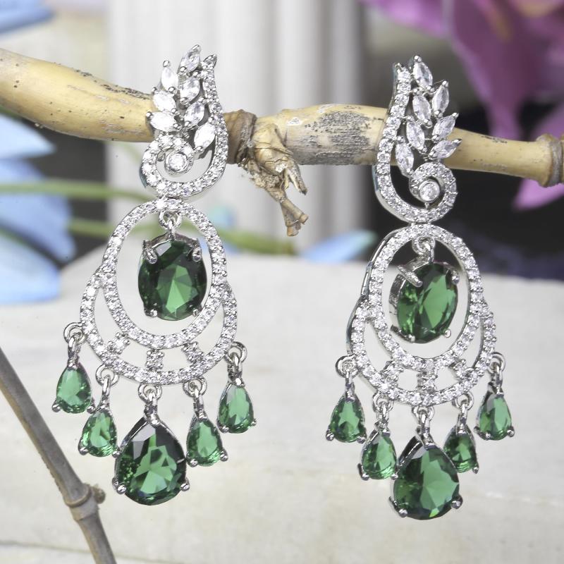 Elegant rhodium-plated earrings with American diamond studding. Features oval and leaf-shaped drops.
