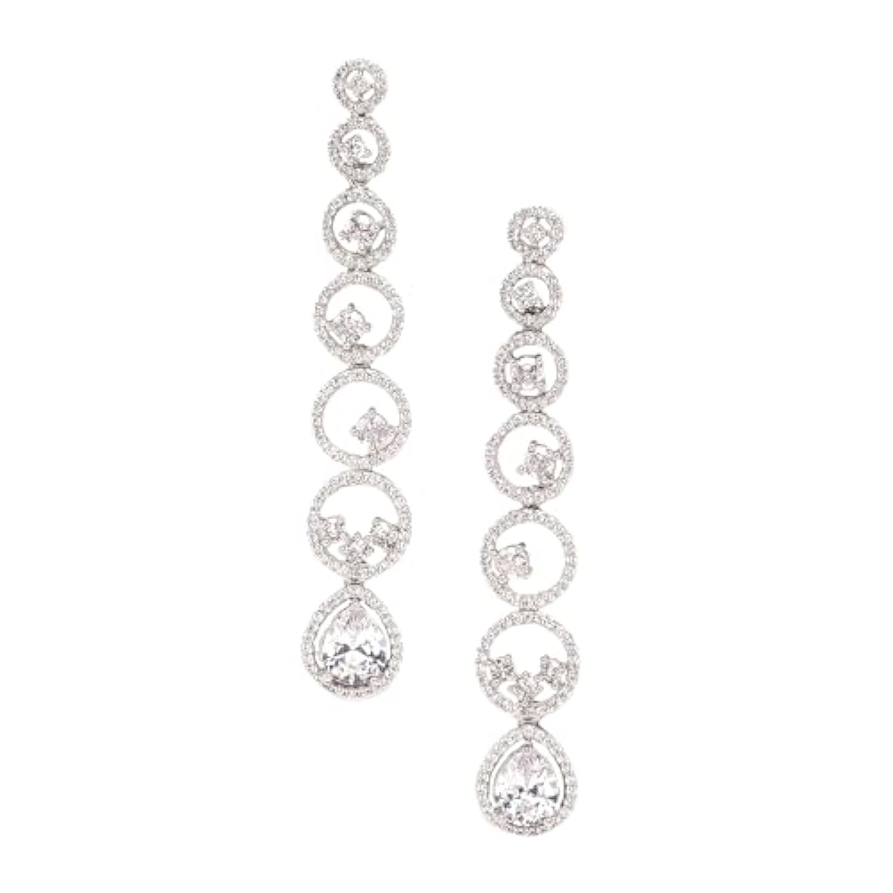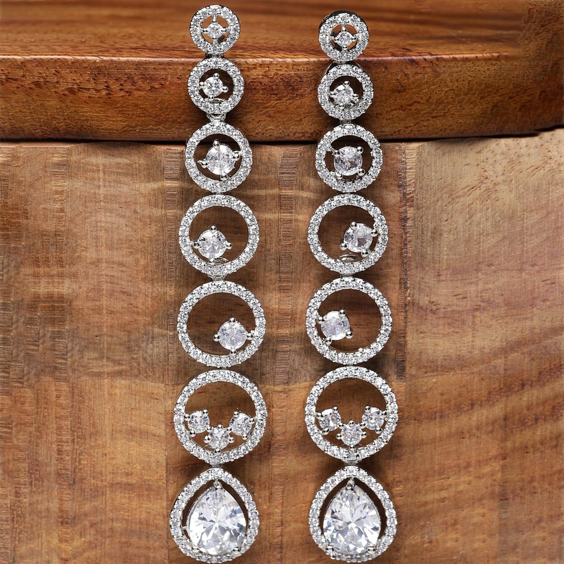 Stylish circular drop earrings featuring sparkling American diamond for a touch of elegance.