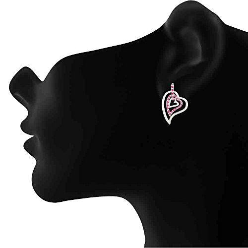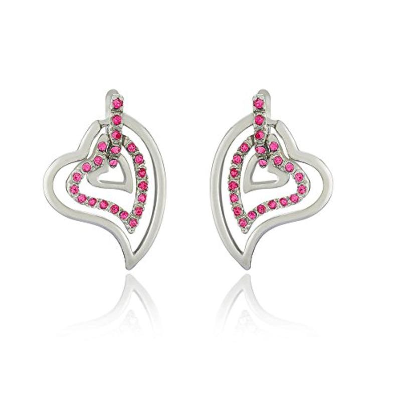 Add a touch of elegance to your outfit with these stunning rhodium plated earrings featuring three hearts adorned with pink crystals.