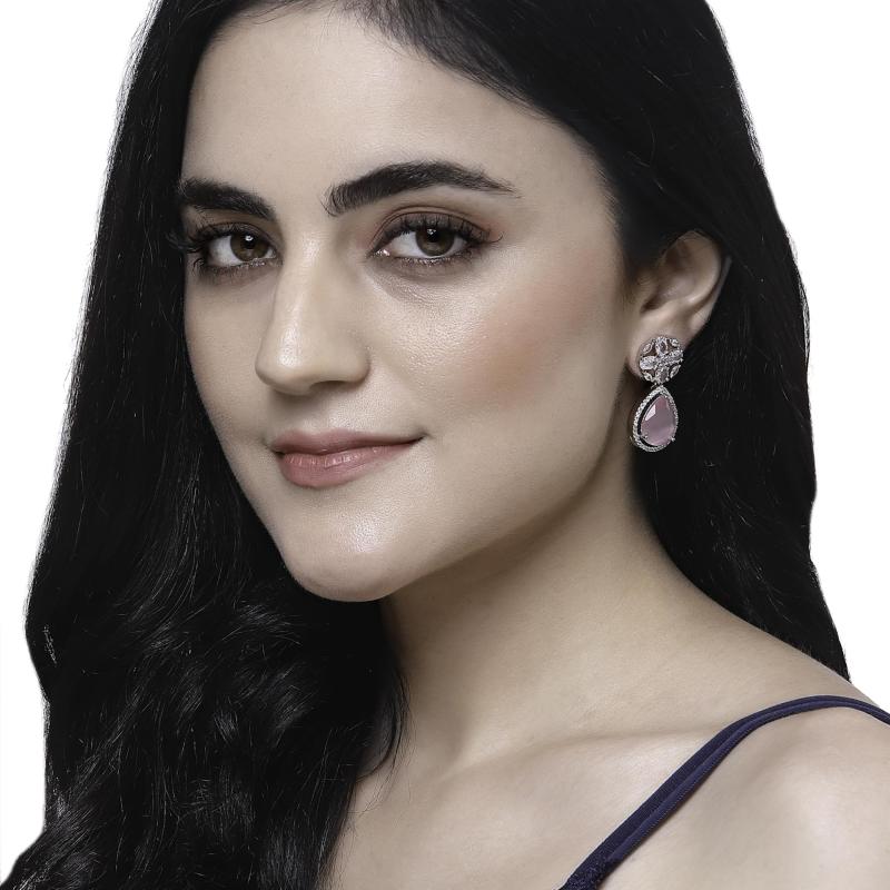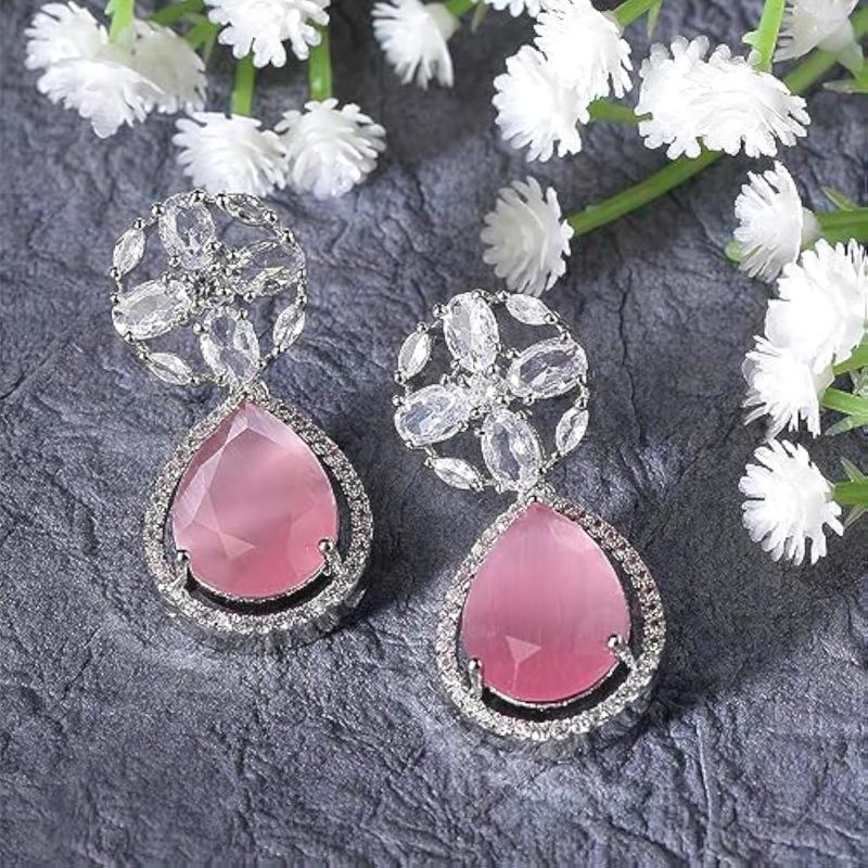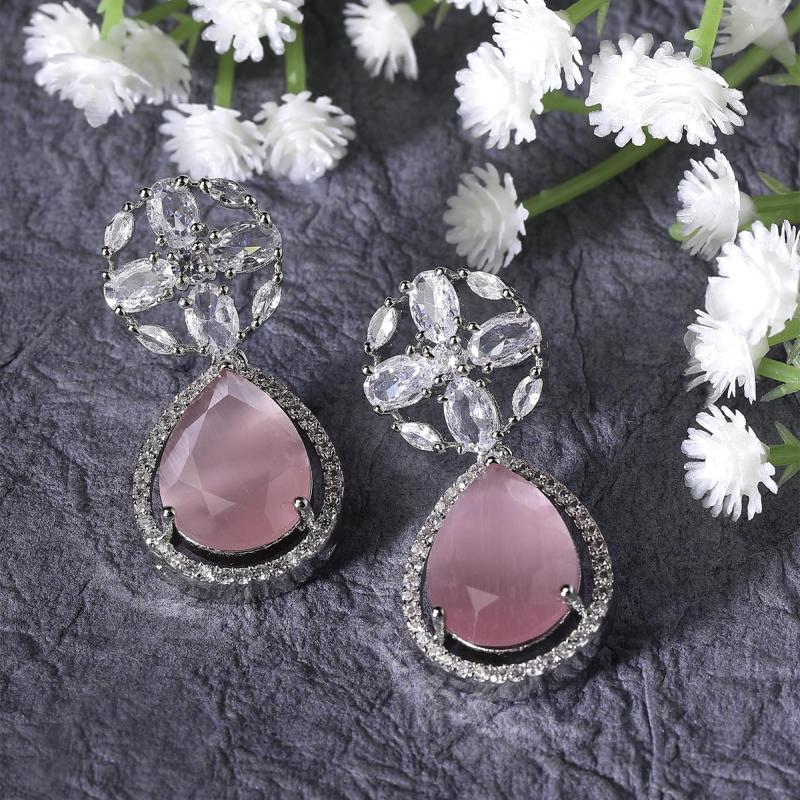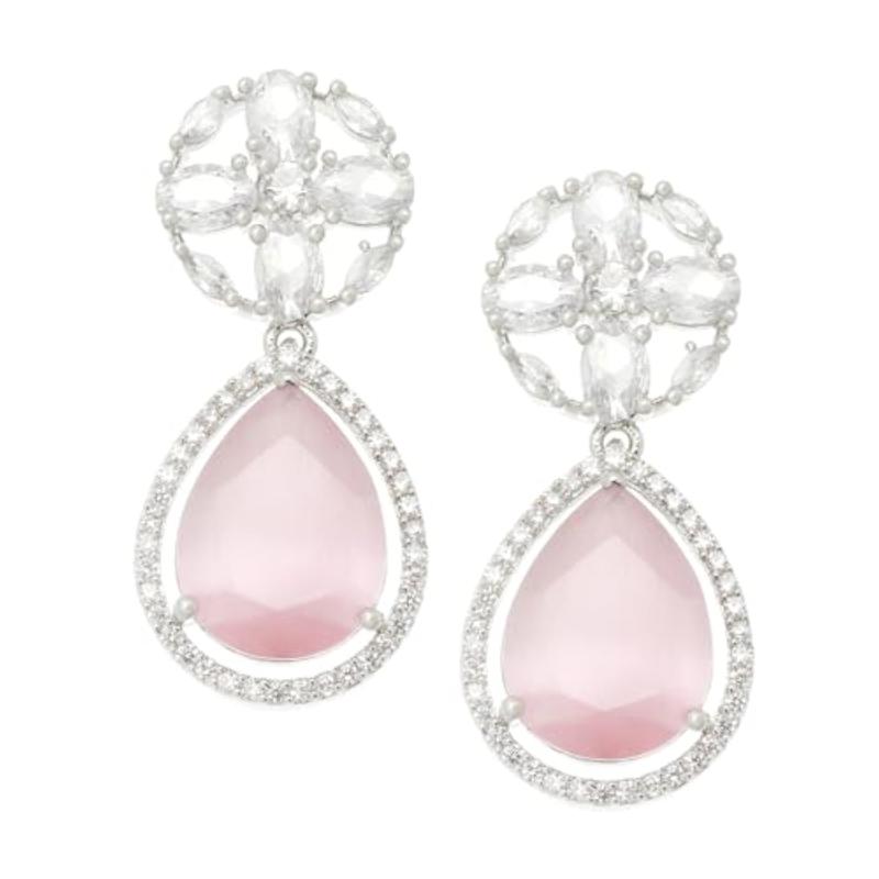 Elegant rhodium-plated earrings with teardrop and floral design, perfect for any occasion.