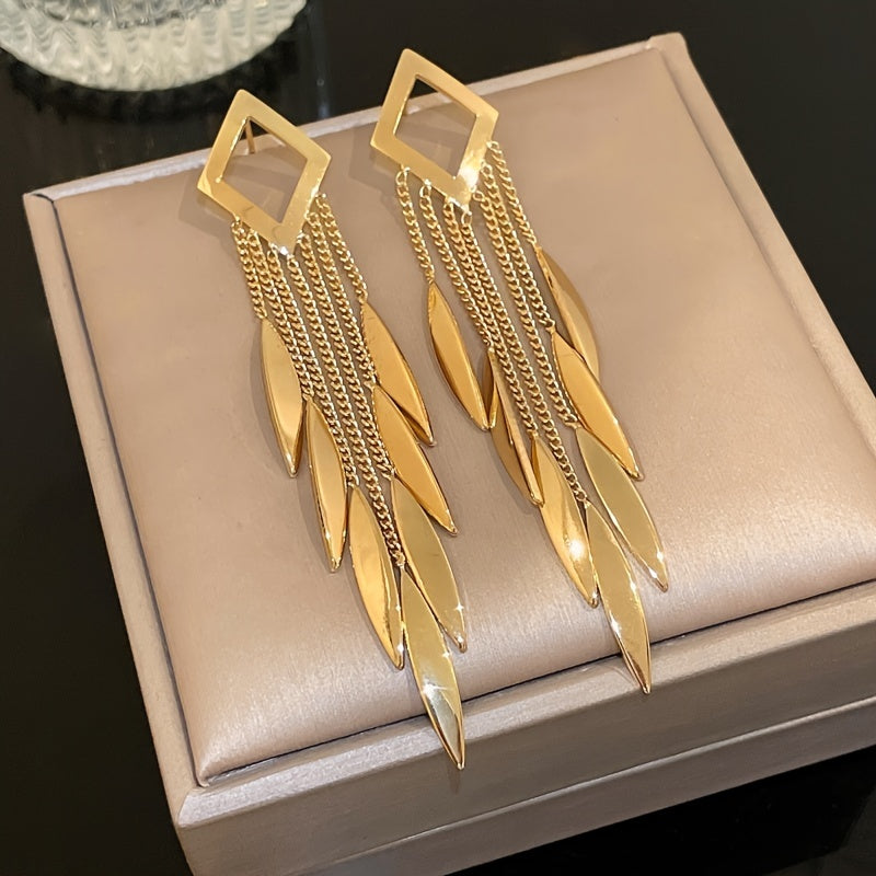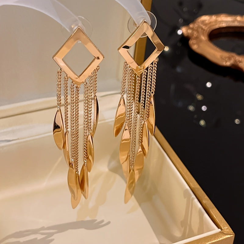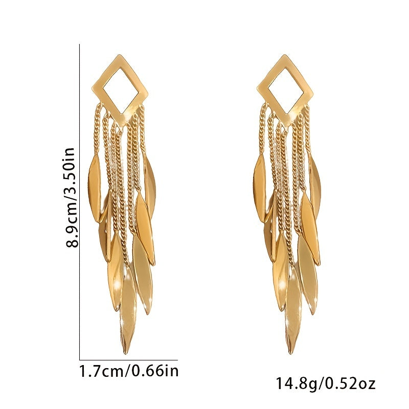 Enhance your look with these stunning rhombus tassel drop earrings. Made of 18K plated metal, these earrings add an elegant touch to any outfit.