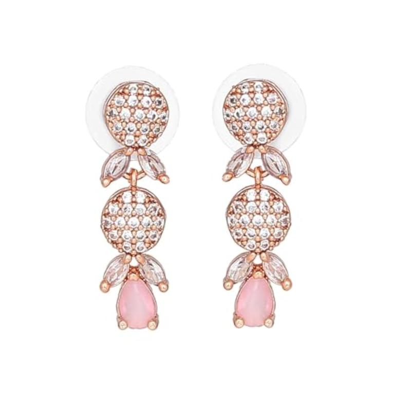 Elegant drop earrings featuring mint pink stones encircled by CZ stones. Rose gold plating adds a touch of luxury.