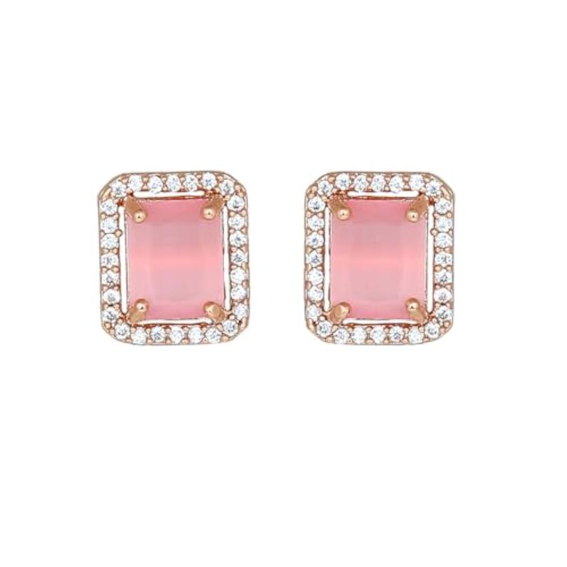Elegant square stud earrings featuring mint pink stones surrounded by sparkling CZ stones. Rose plated for a luxurious finish.