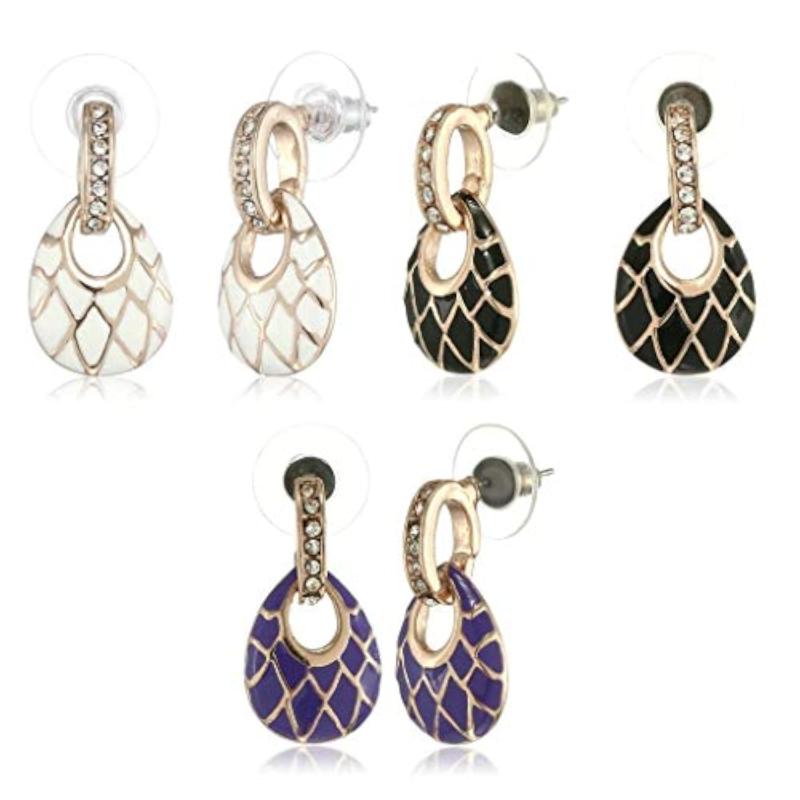 Enhance your style with this stunning combo of rose plated stud earrings in white, purple, and black. Perfect for both men and women.