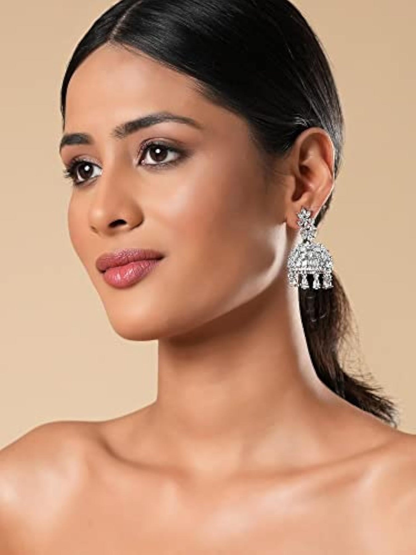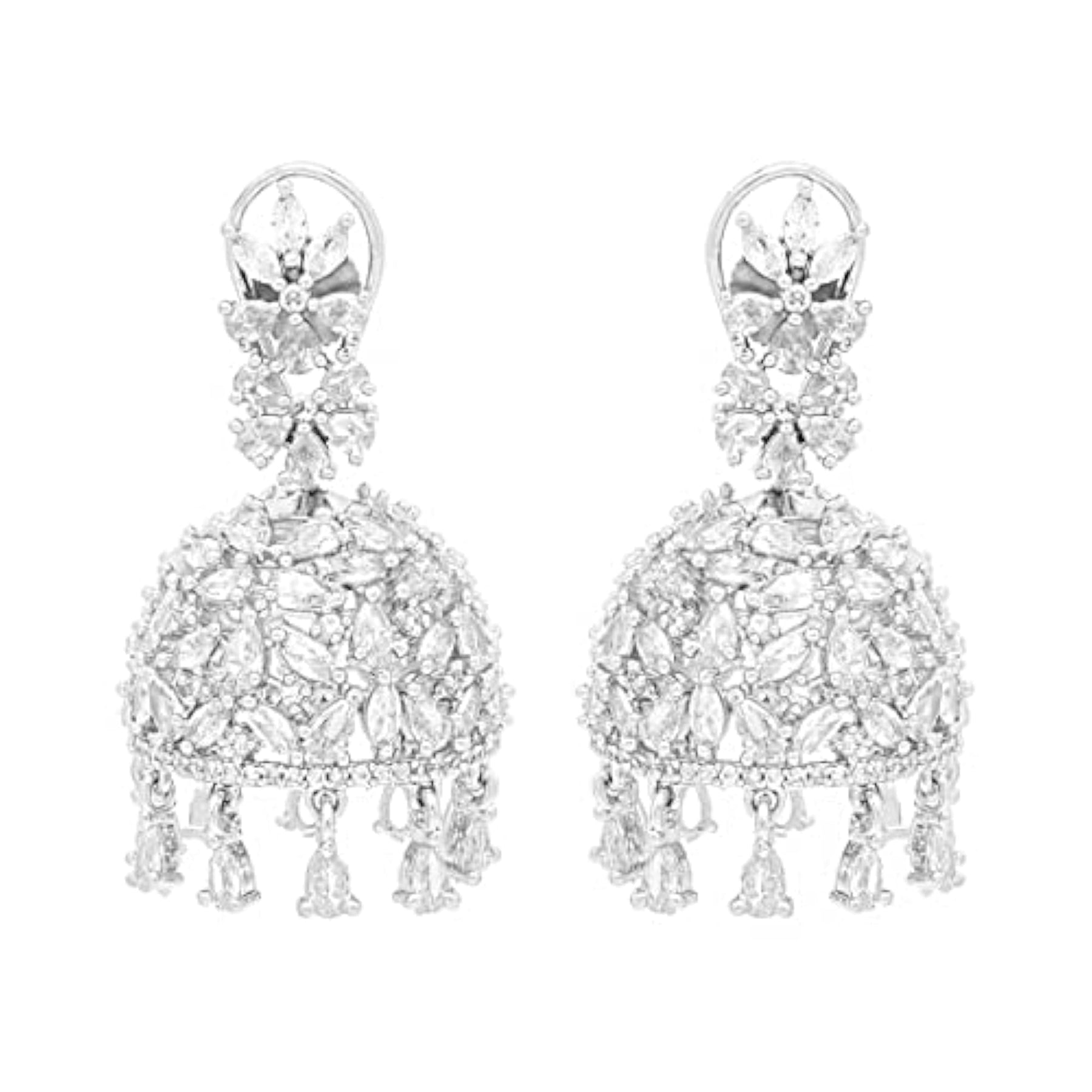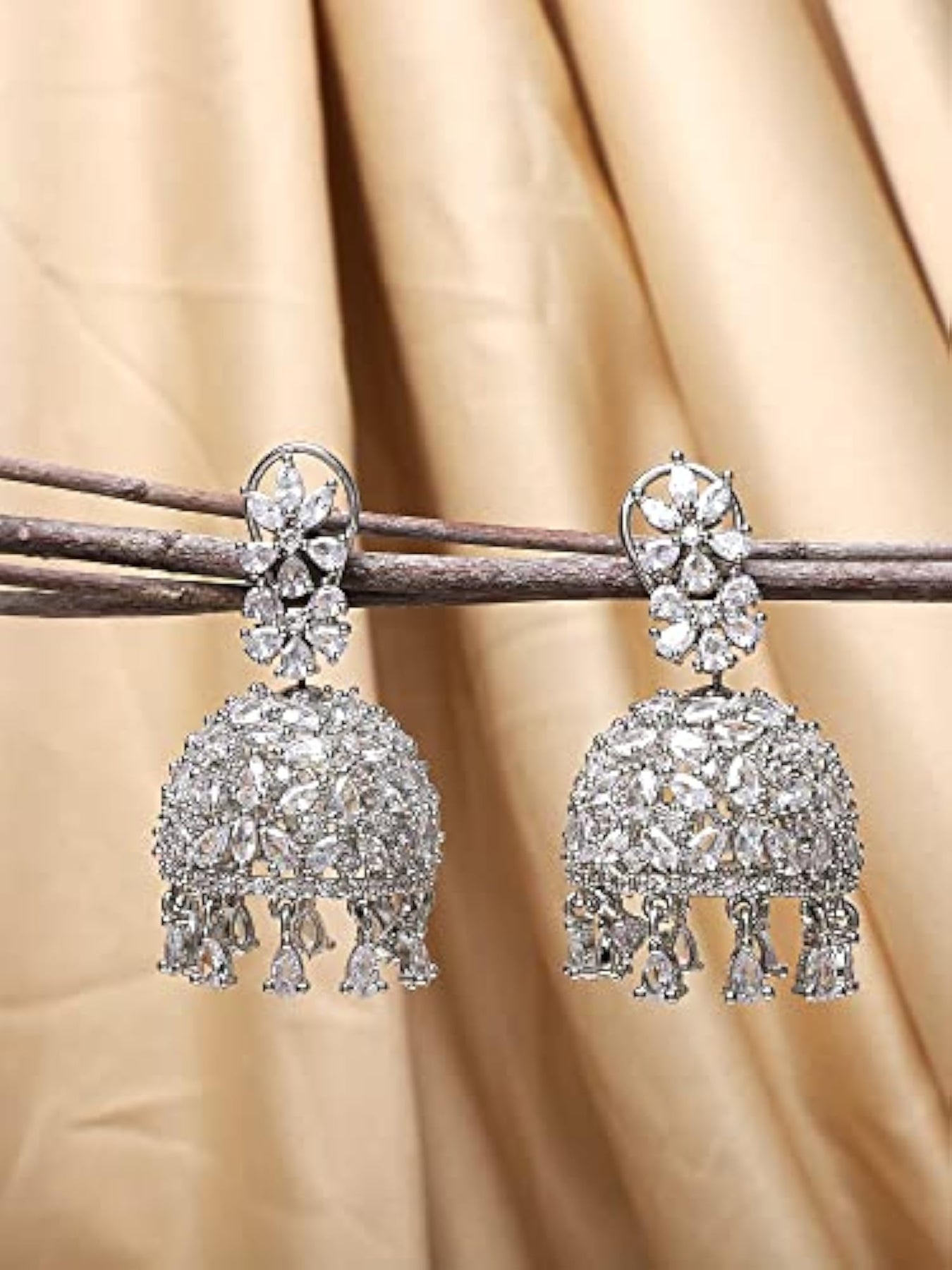 Elegant jhumka earrings featuring American Diamond studded design, perfect for adding a touch of glamour to any outfit.