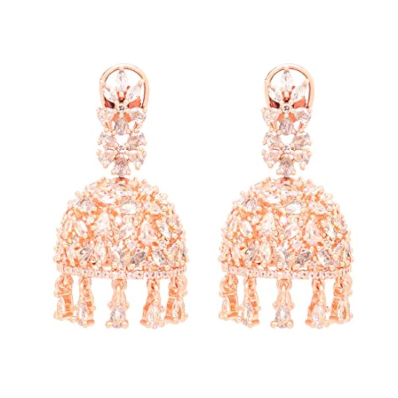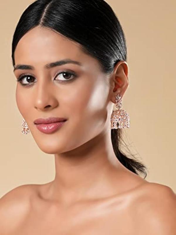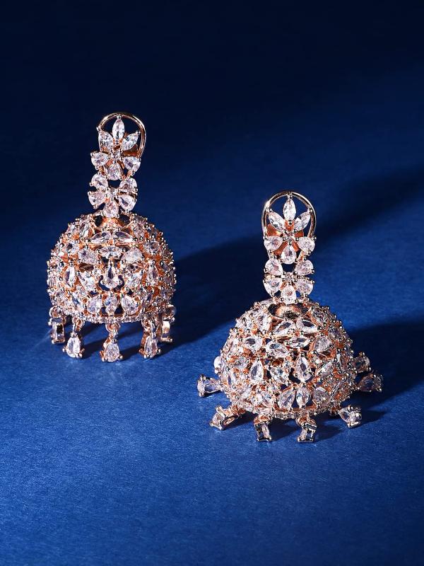 Elegant jhumka earrings featuring American diamond studding in rose gold plating. Perfect for women and girls.
