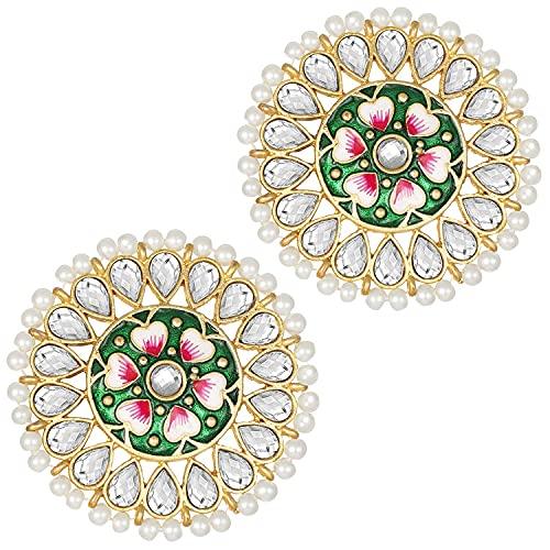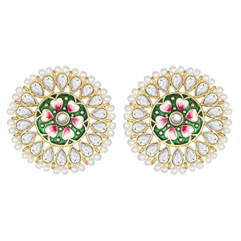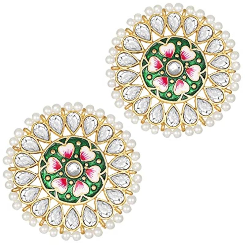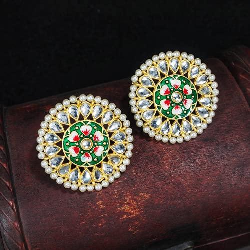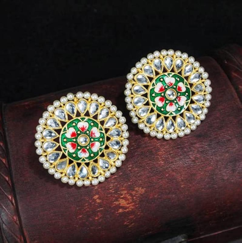 Elegant handcrafted stud earrings with kundan and pearl detailing, featuring intricate meena work. Plated in 18k gold for a luxurious finish.