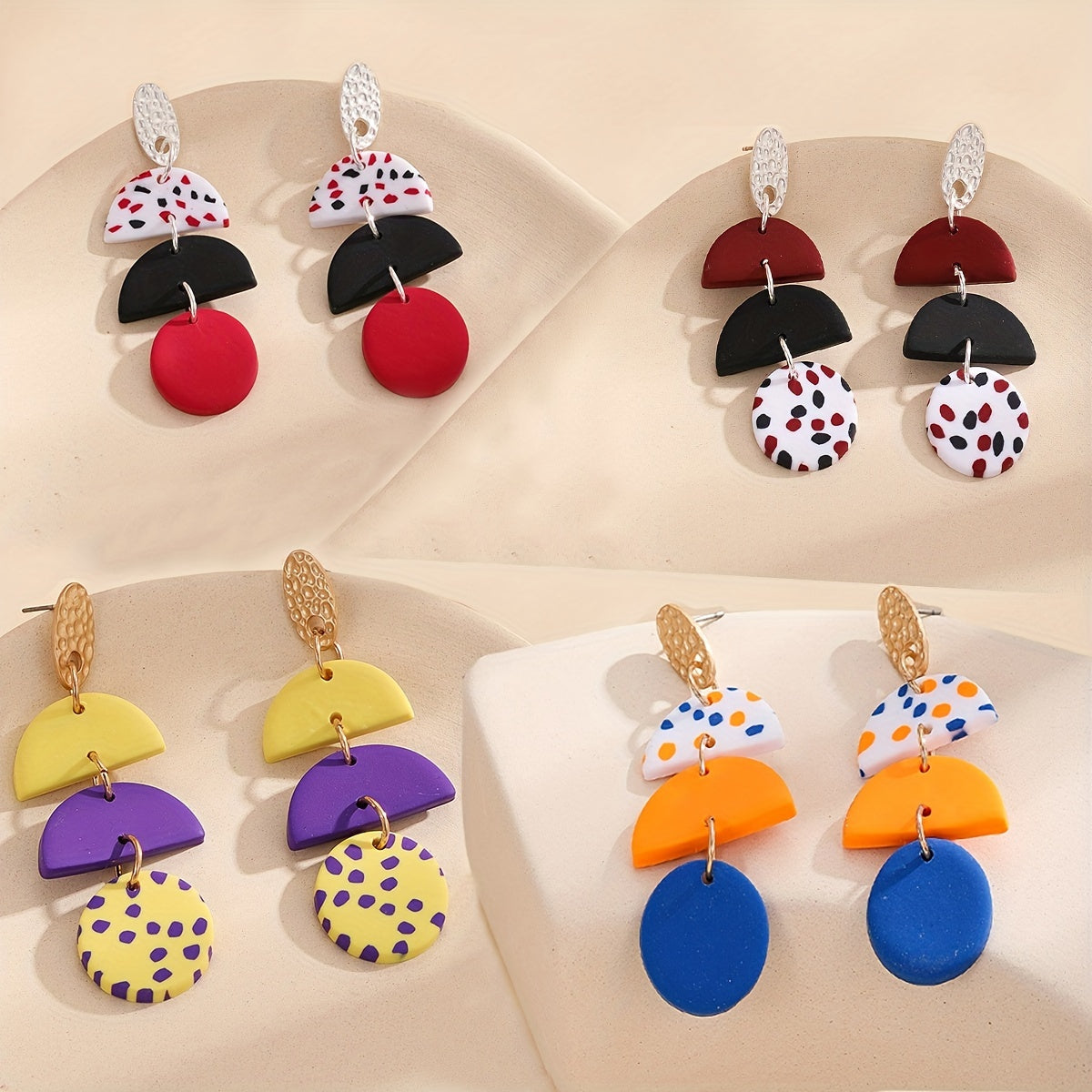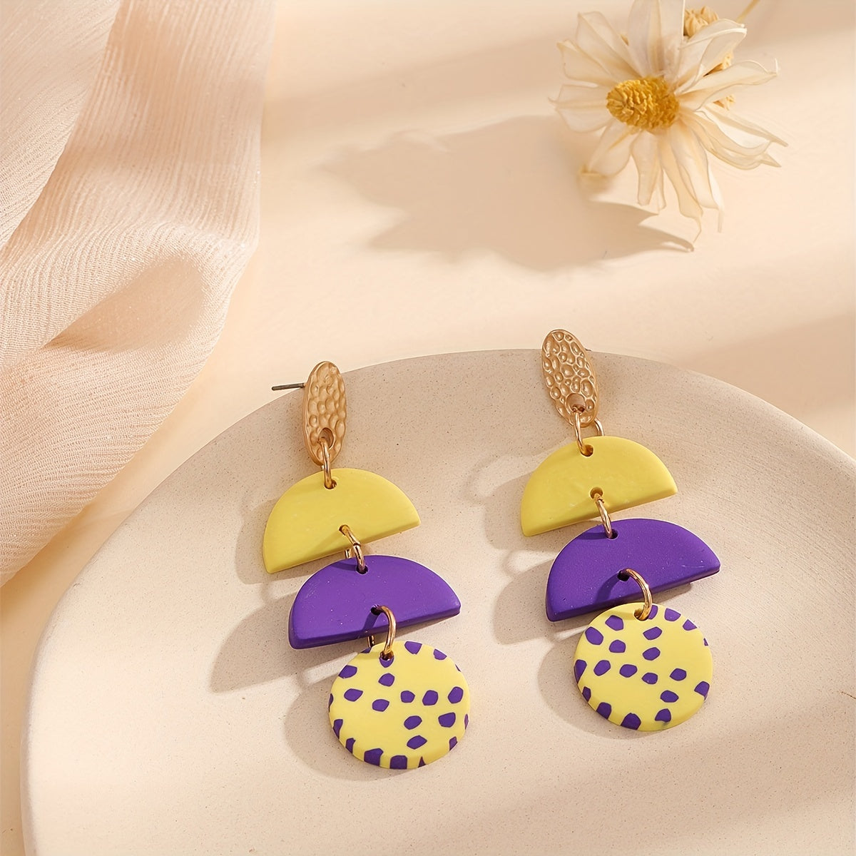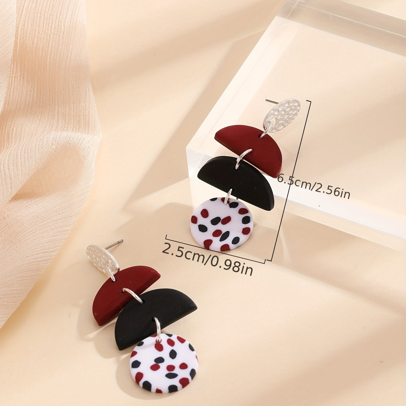 These stylish dangle earrings feature a semi circle and round shape design with a dot pattern. Perfect for a classic and elegant look, these soft clay earrings make a great gift for any occasion.