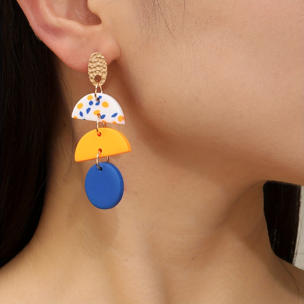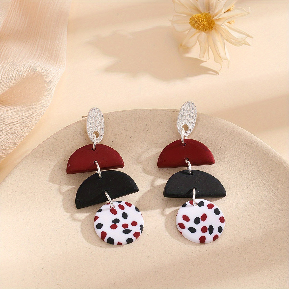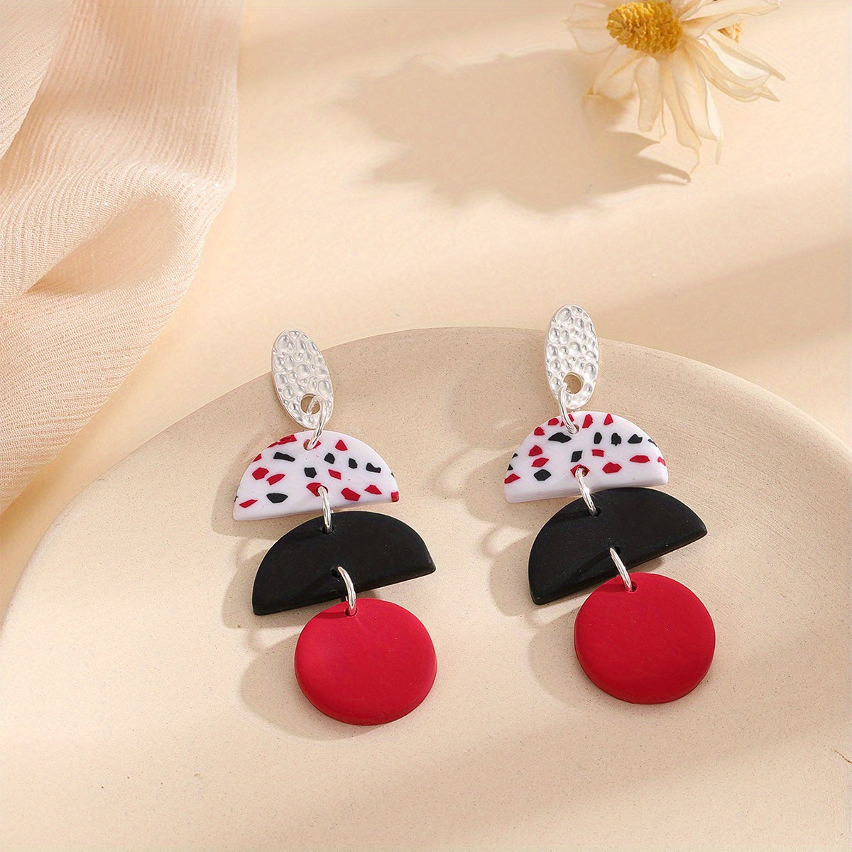 These stylish dangle earrings feature a semi circle and round shape design with a dot pattern. Perfect for a classic and elegant look, these soft clay earrings make a great gift for any occasion.