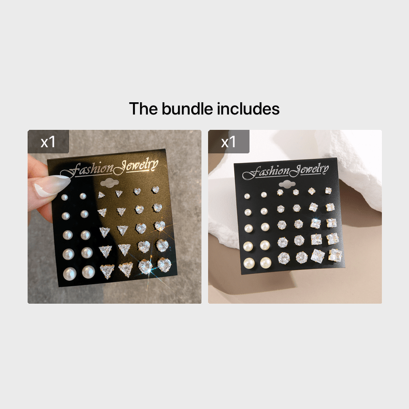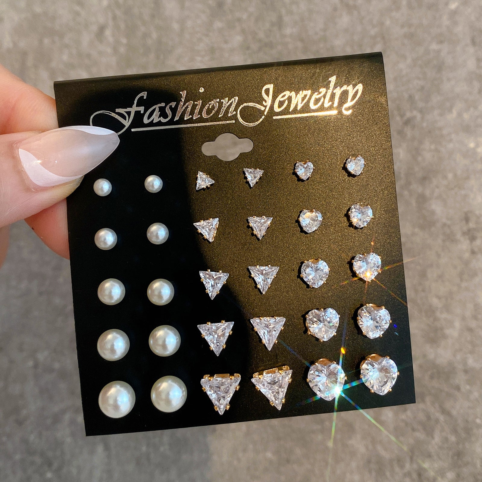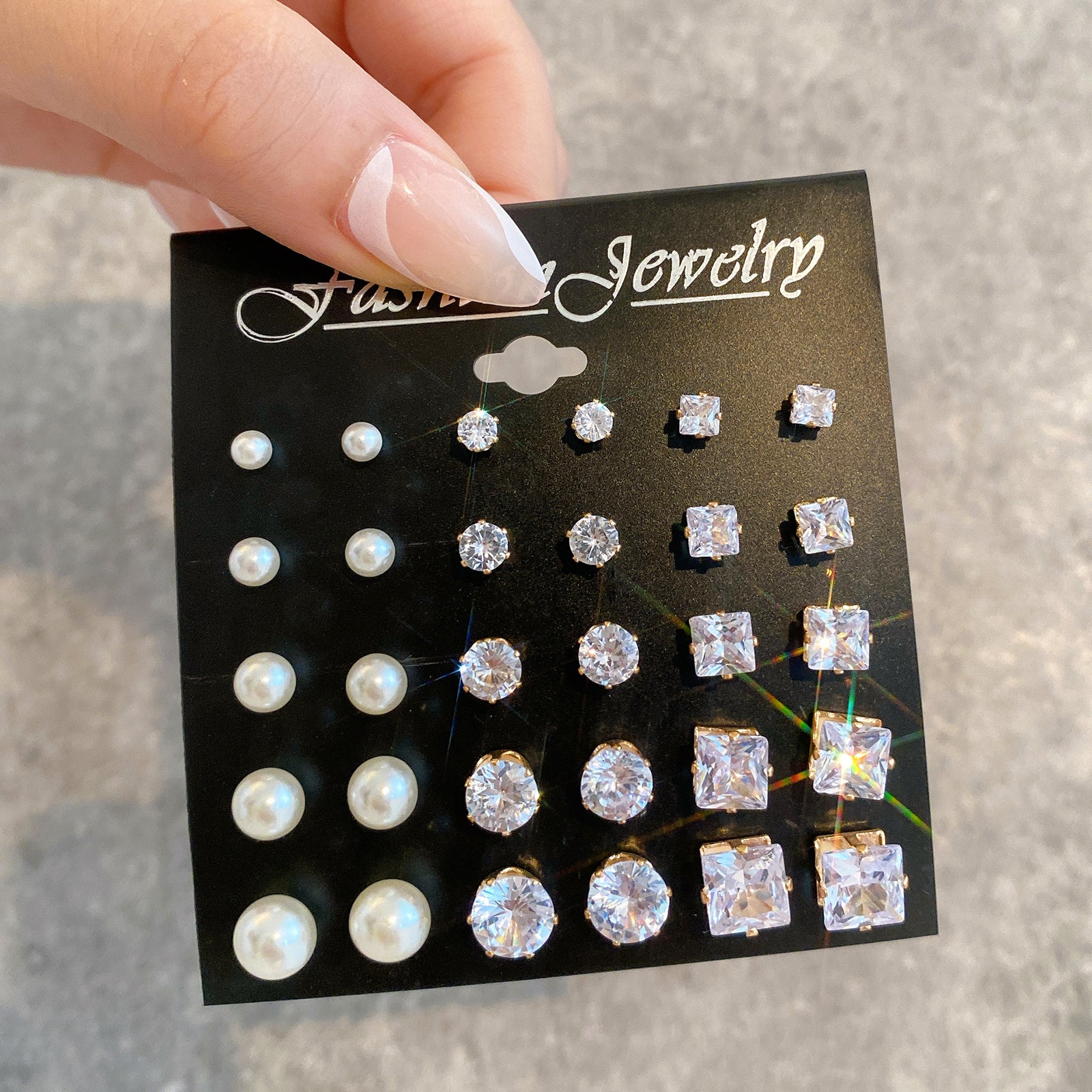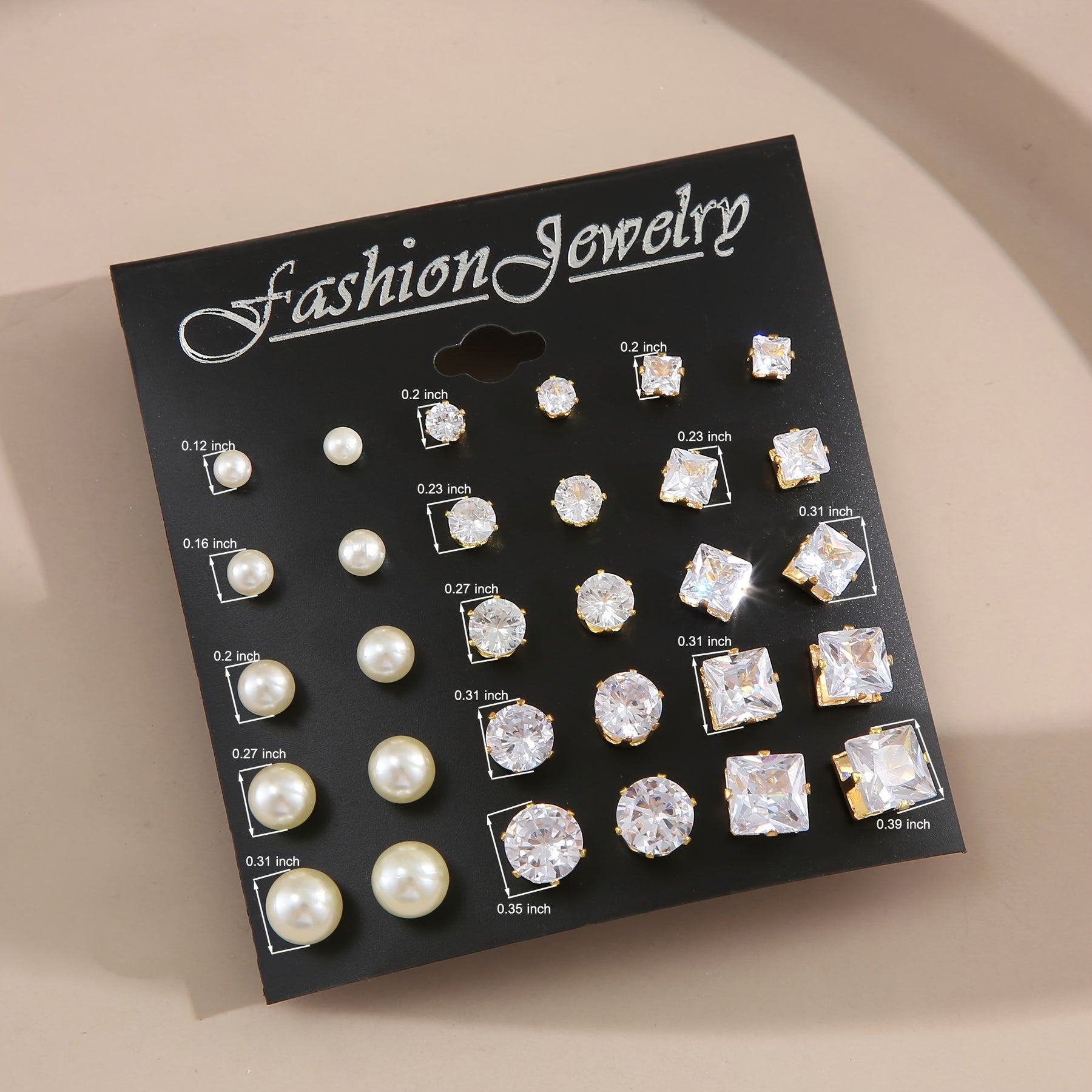 Elegant and versatile stud earrings set featuring round, square, zircon, and pearl designs. Comes in a pack of 15 pairs.