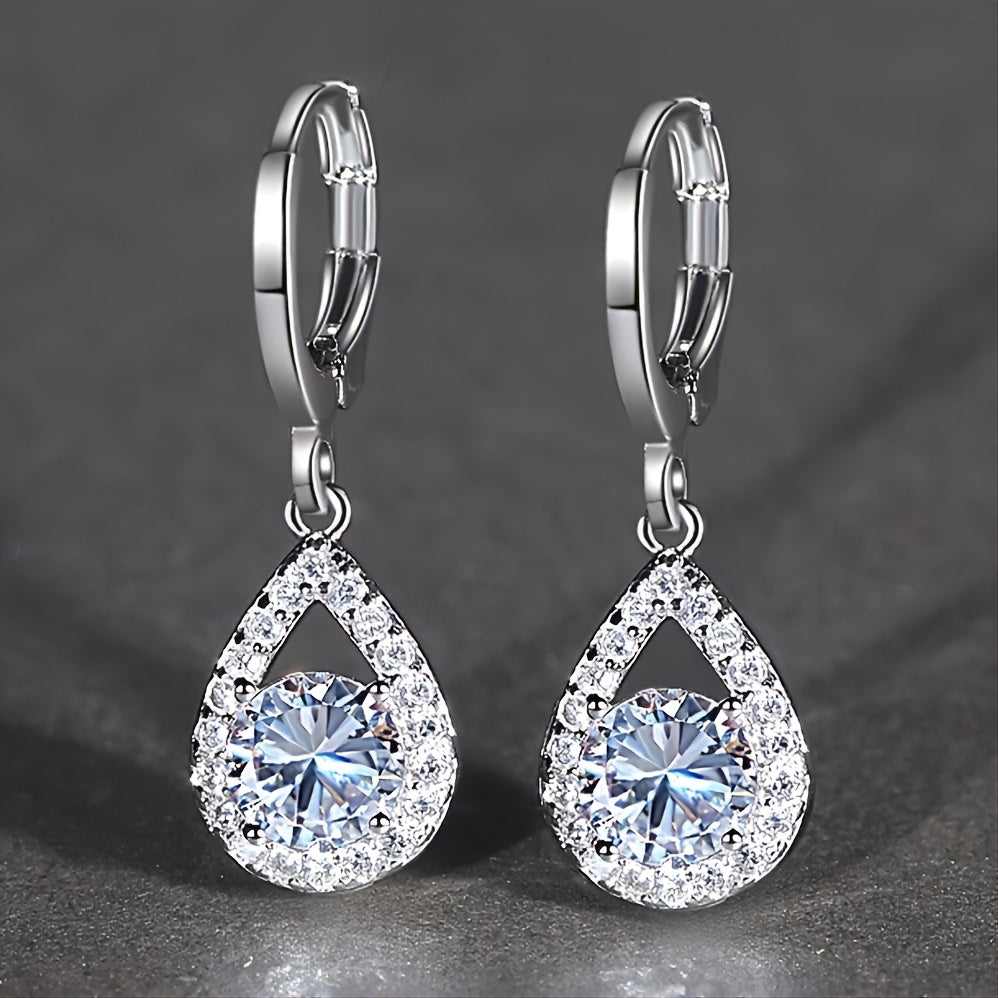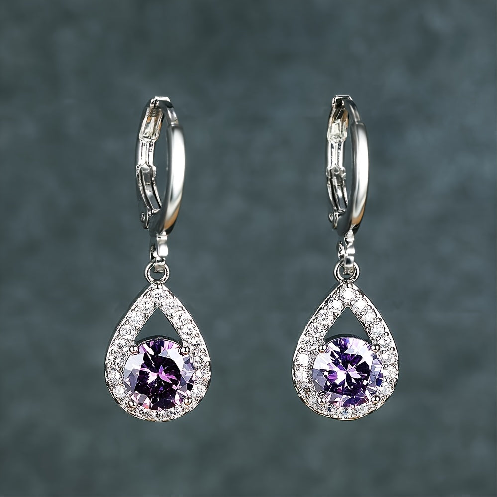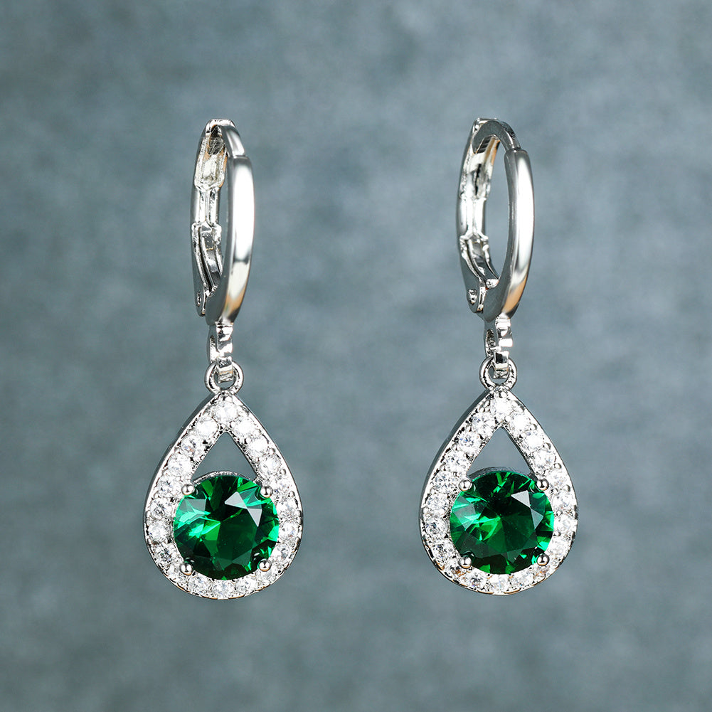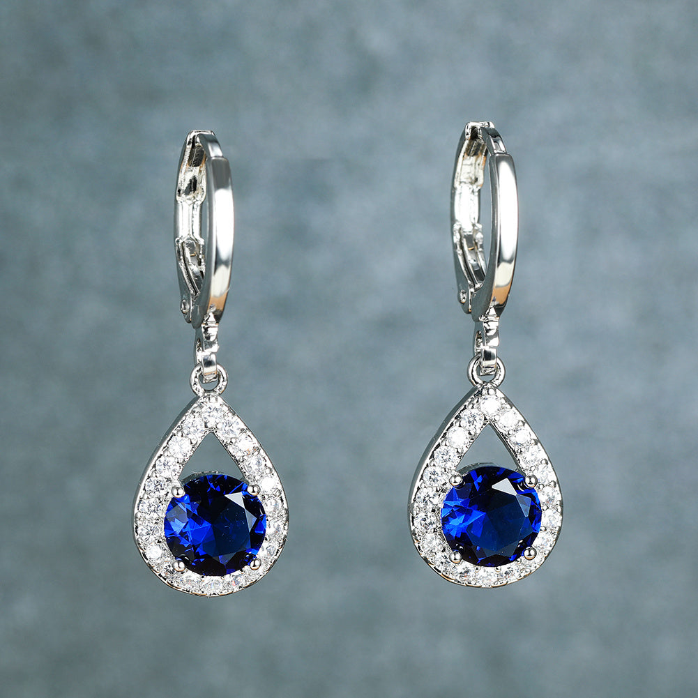 Elegant round sapphire drop earrings designed for females. These golden dangle hoop earrings are perfect for brides on their wedding day.