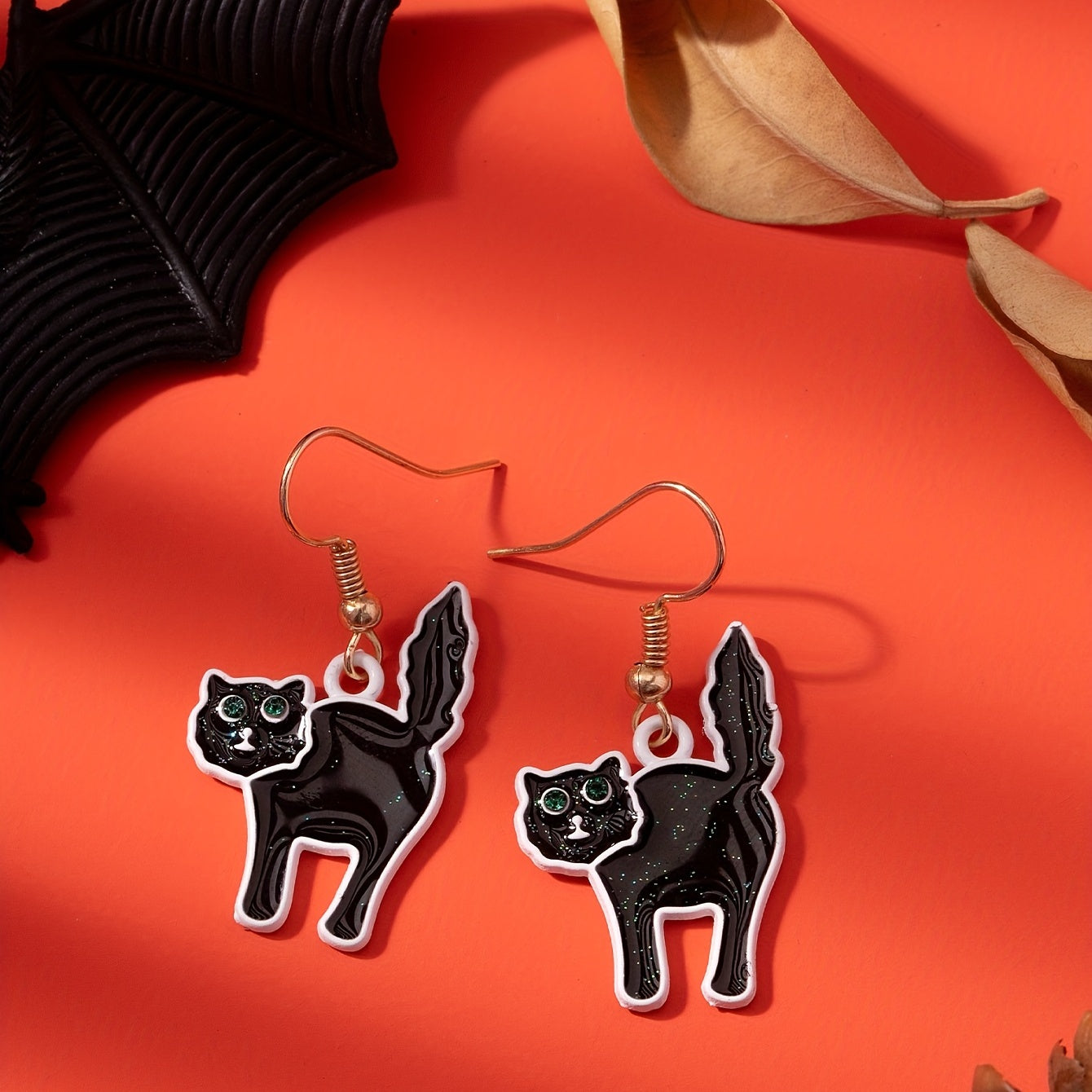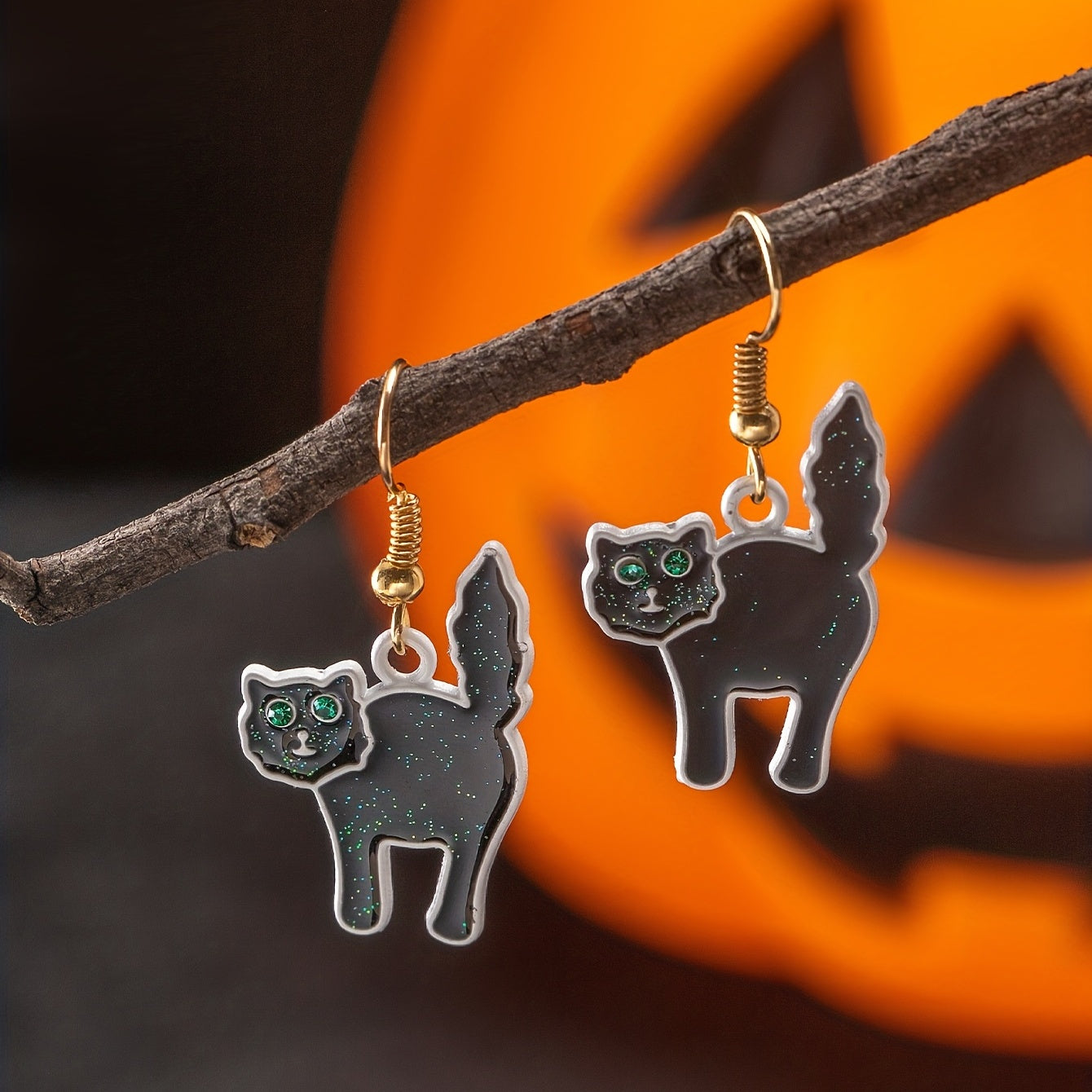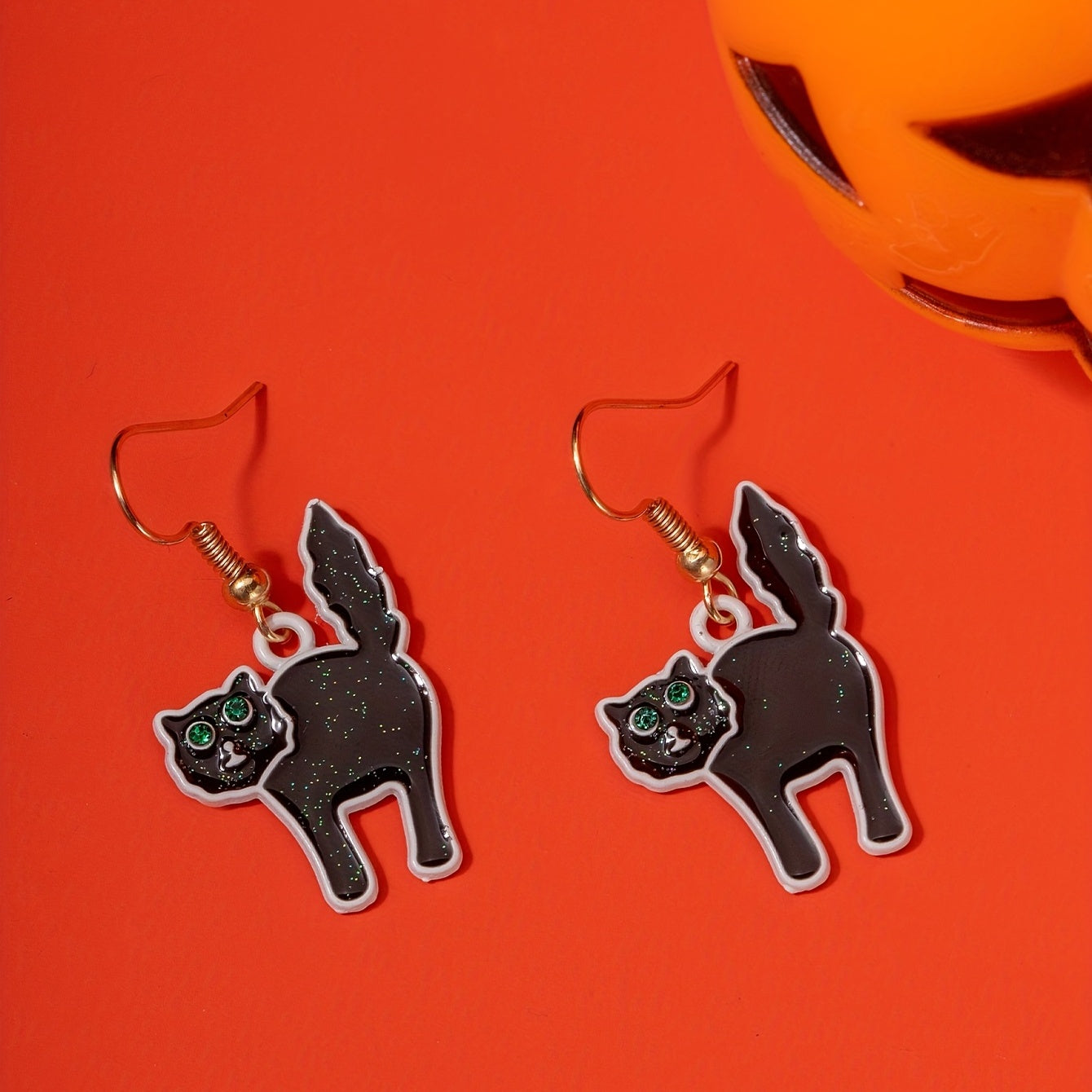 These Halloween themed earrings feature a scared cat design with green zircon eyes. Made from zinc alloy, these dangle earrings are perfect for adding a touch of goth style to any outfit. A creative and unique gift for any female in your life.