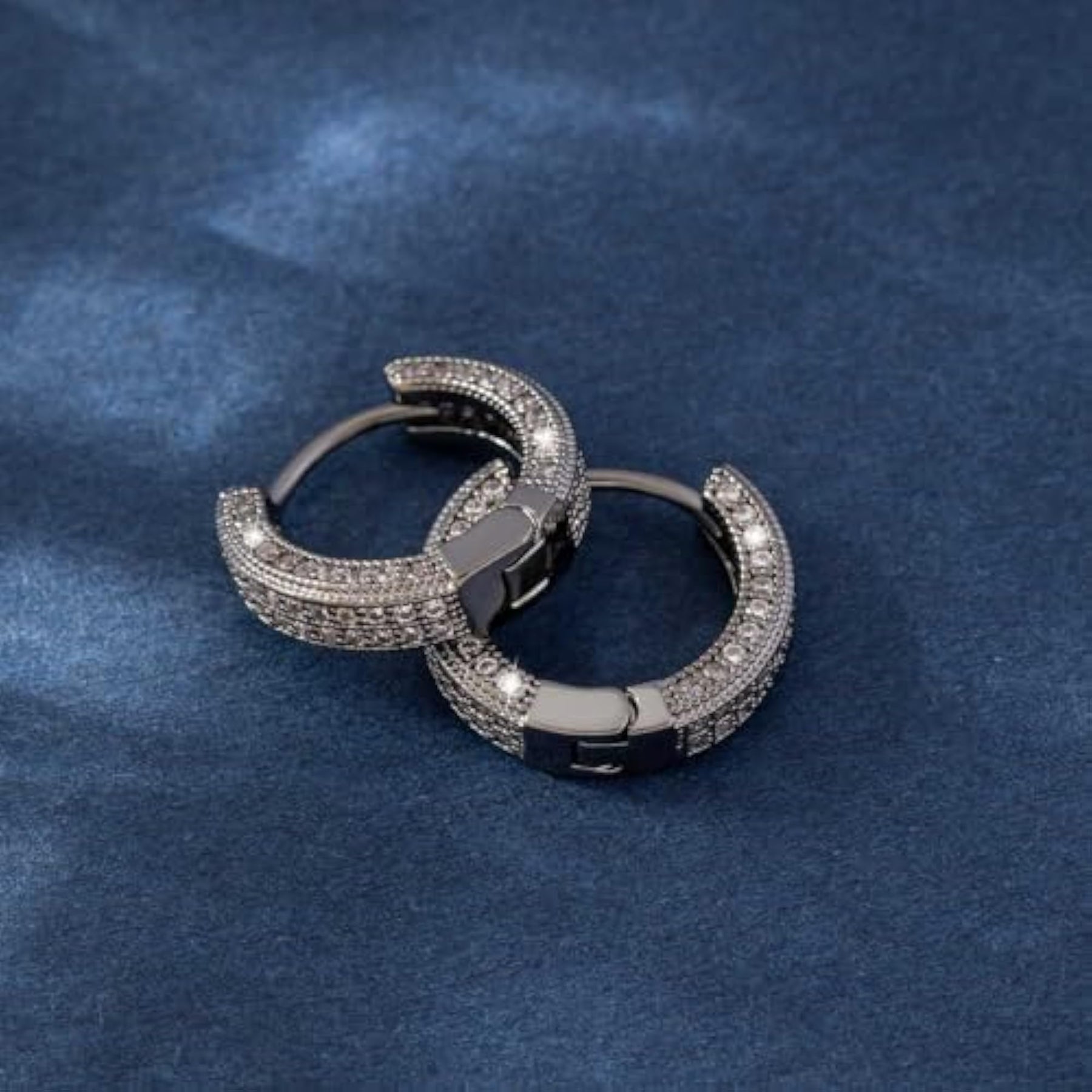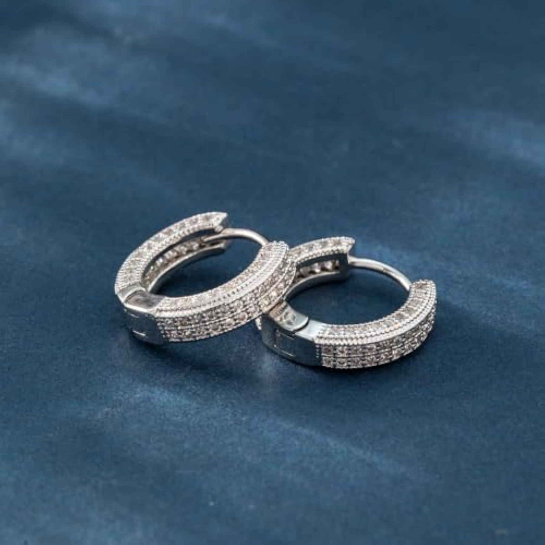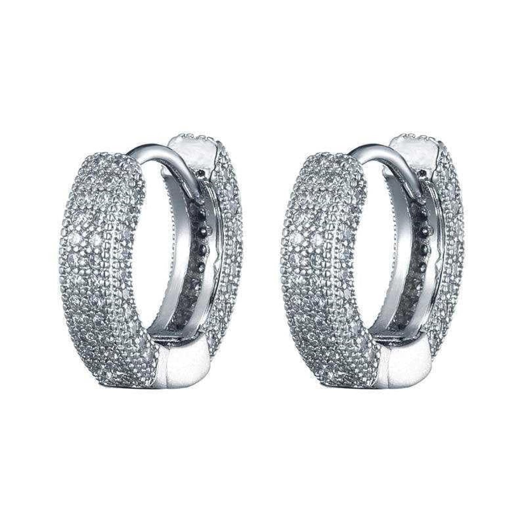 Stylish and elegant silver plated huggie hoop earrings with pave cubic zirconia embellishments. Perfect for adding a touch of sparkle to any outfit.