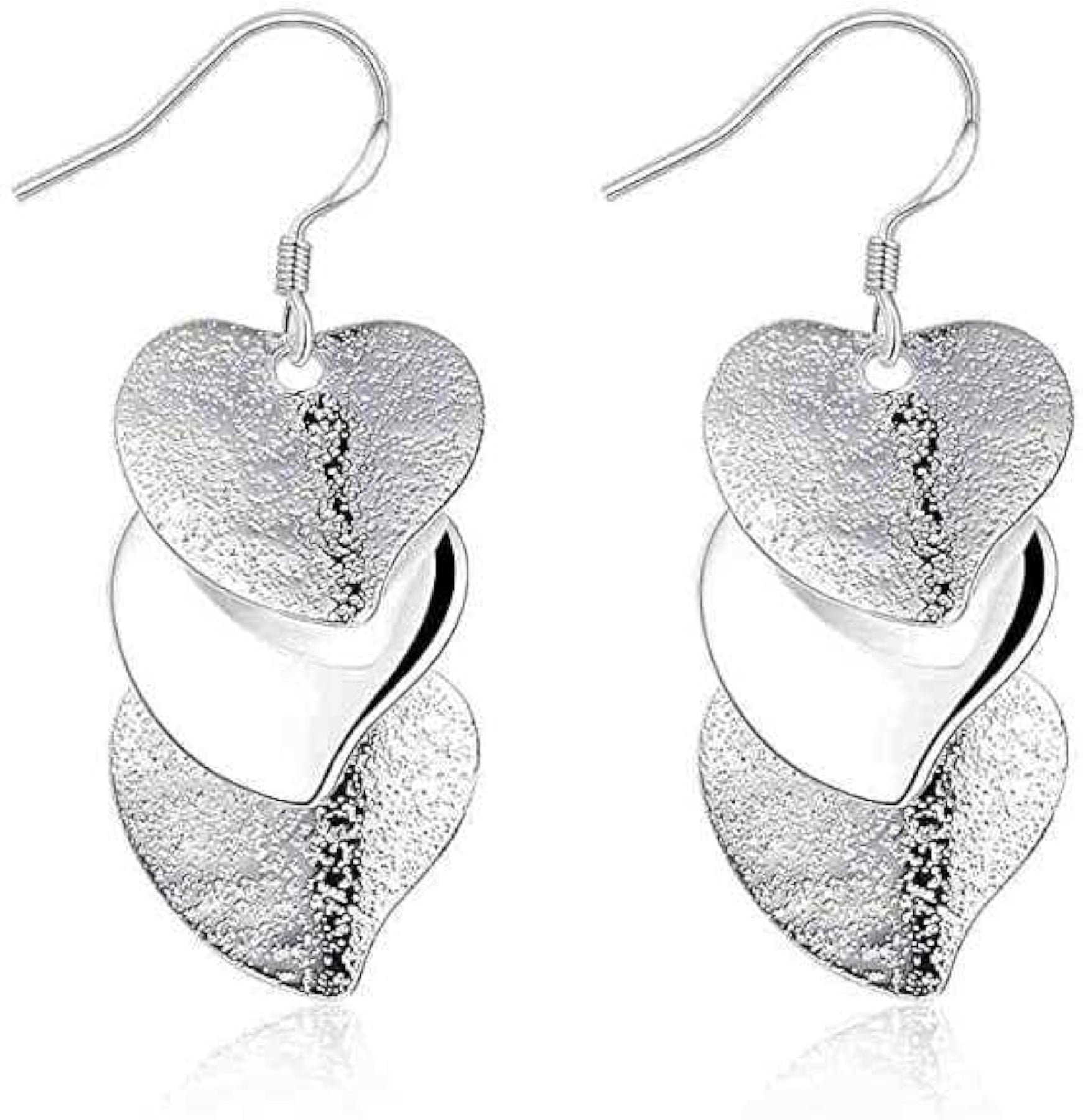 Trendy and modern silver plated earrings featuring triple heart design. Perfect for any occasion.