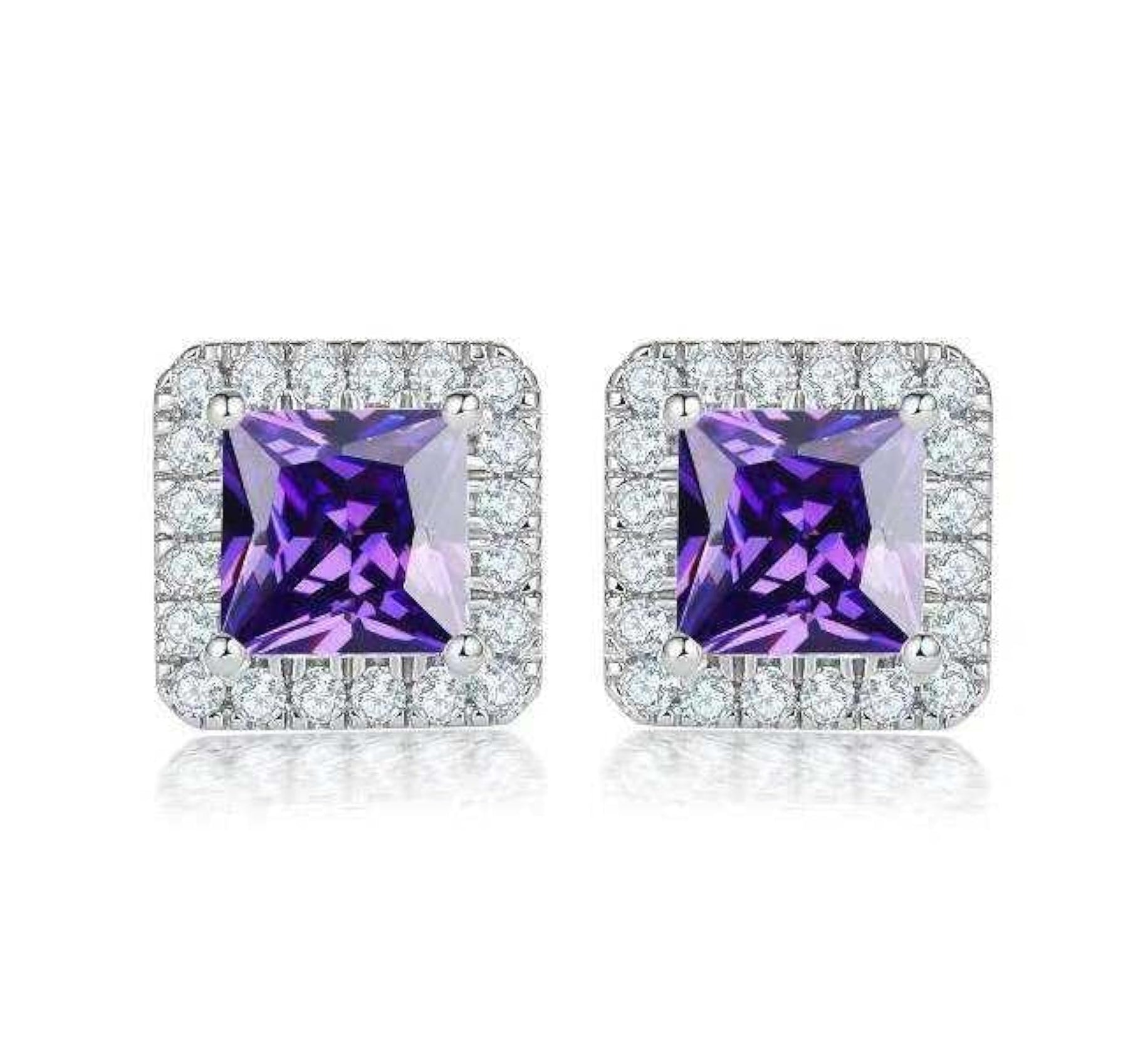 Silver Plated Zirconia Stud Earrings, Princess Cut Halo, Moissanite Jewelry