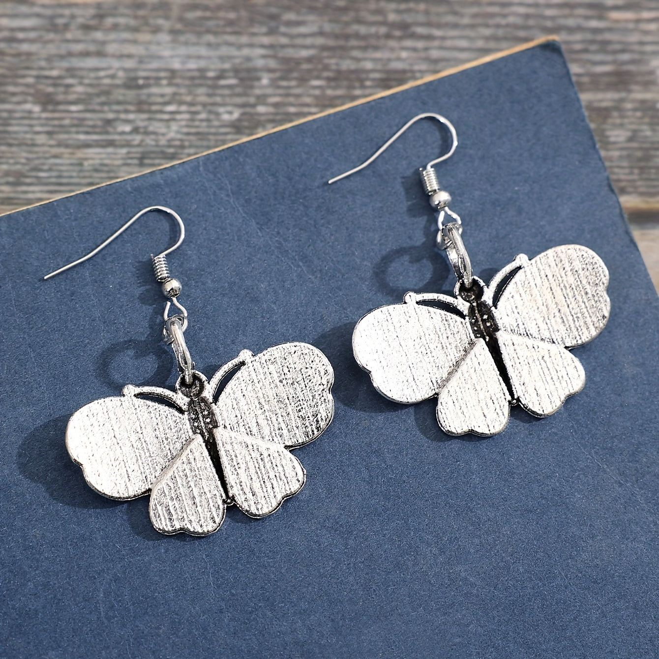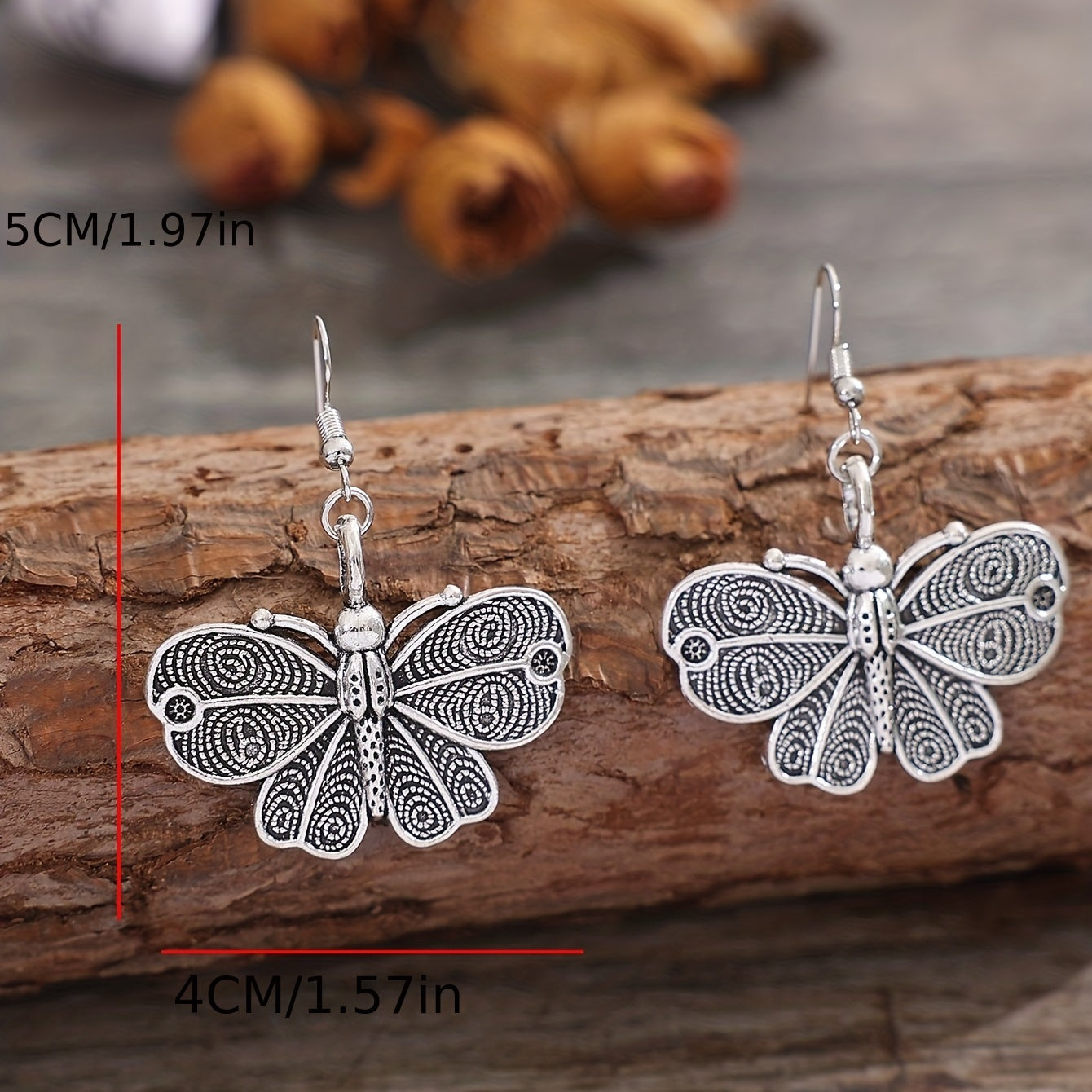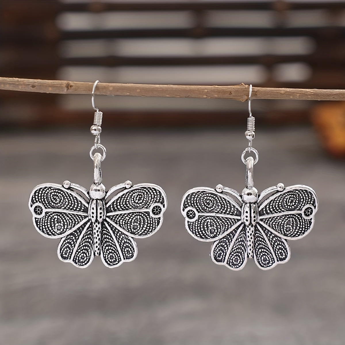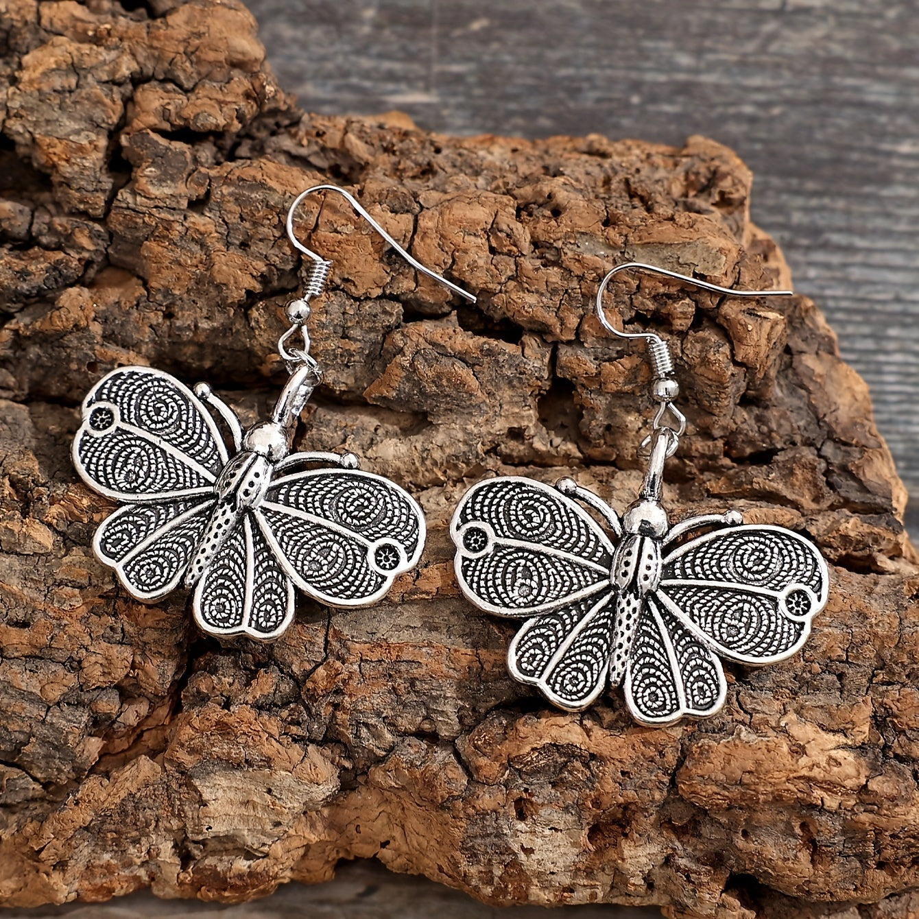Elegant silvery butterfly dangle earrings with a retro bohemian style, made of zinc alloy and silver plated. Perfect gift for females.