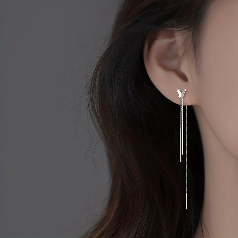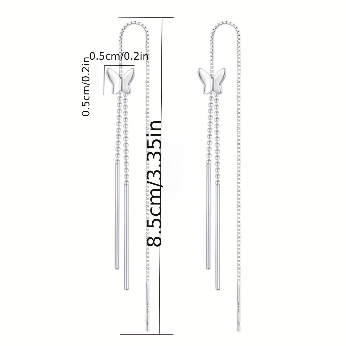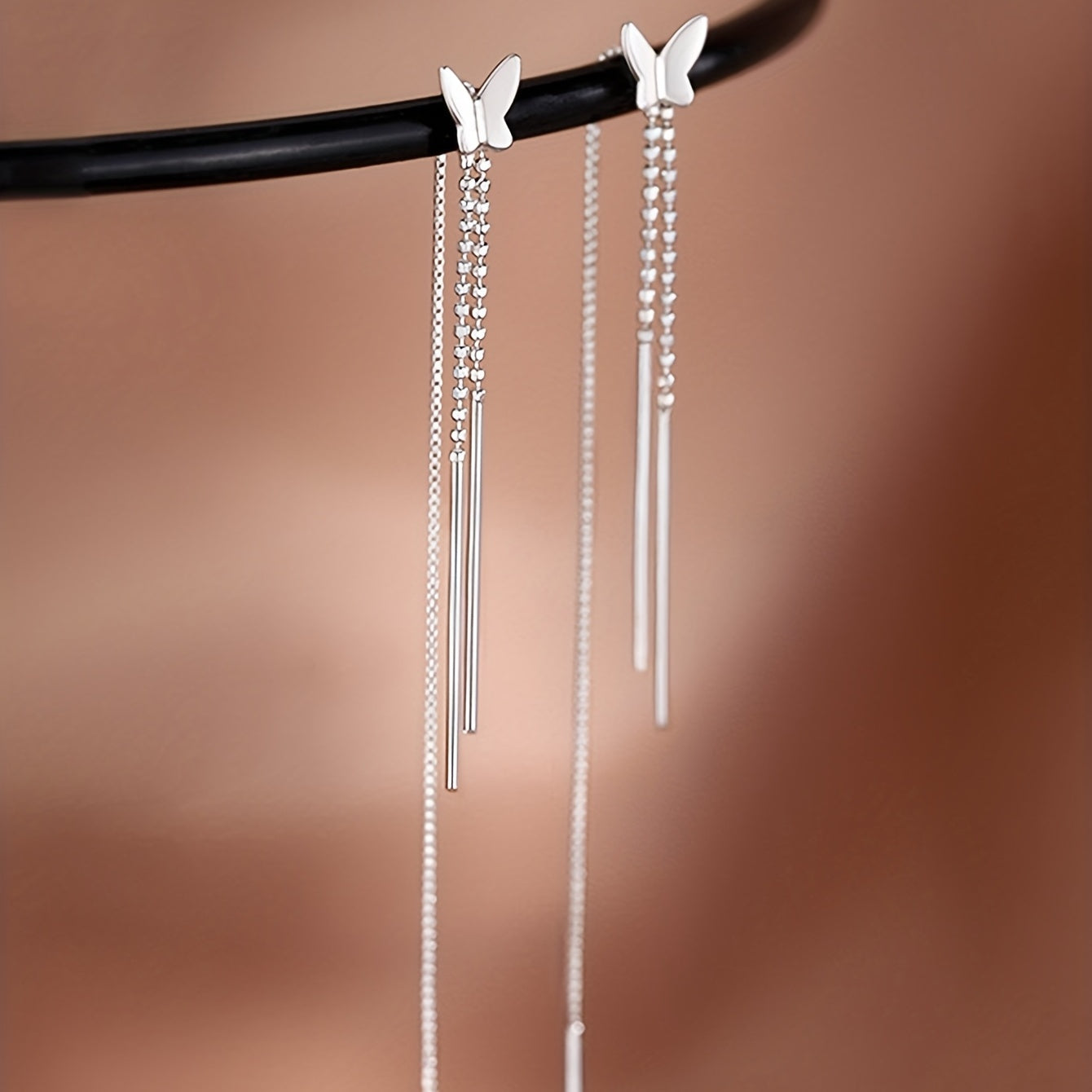 Add a touch of fairy charm to your outfit with these silvery butterfly long chain dangle earrings. Made of copper with a silver plated finish, these earrings are perfect for adding a whimsical flair to your look.