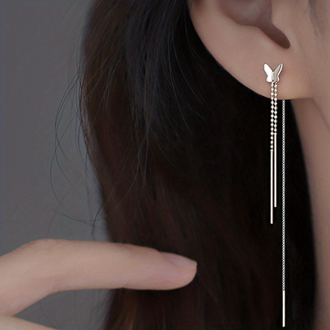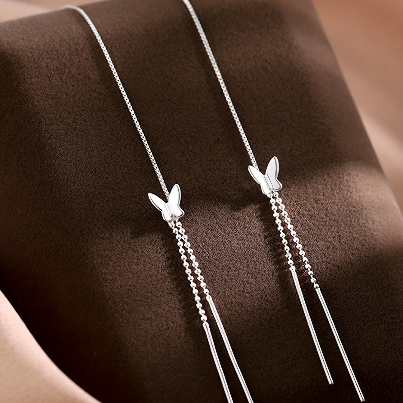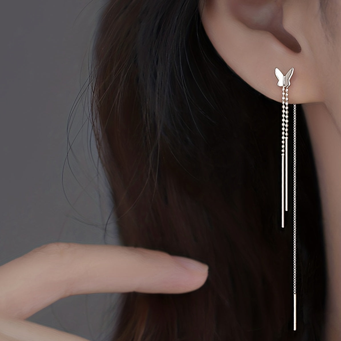 Add a touch of fairy charm to your outfit with these silvery butterfly long chain dangle earrings. Made of copper with a silver plated finish, these earrings are perfect for adding a whimsical flair to your look.