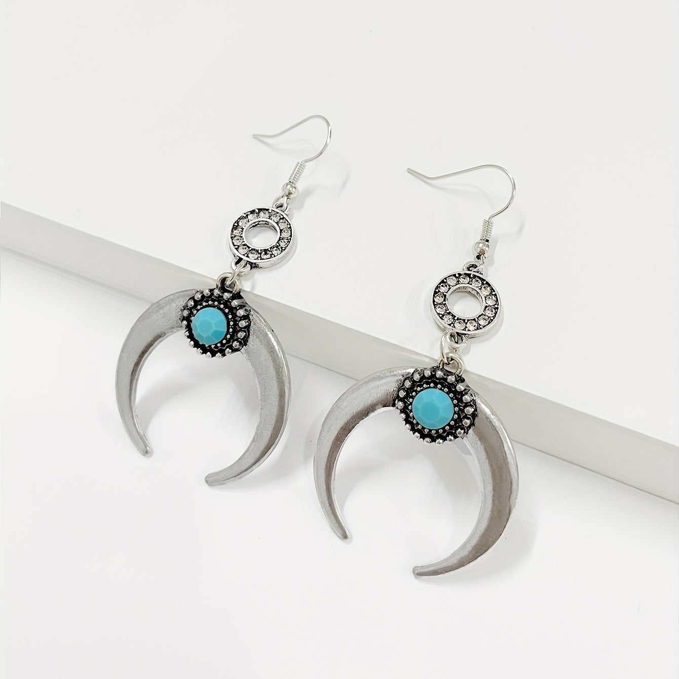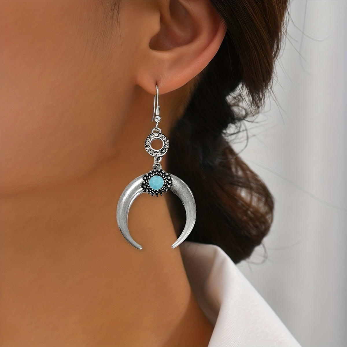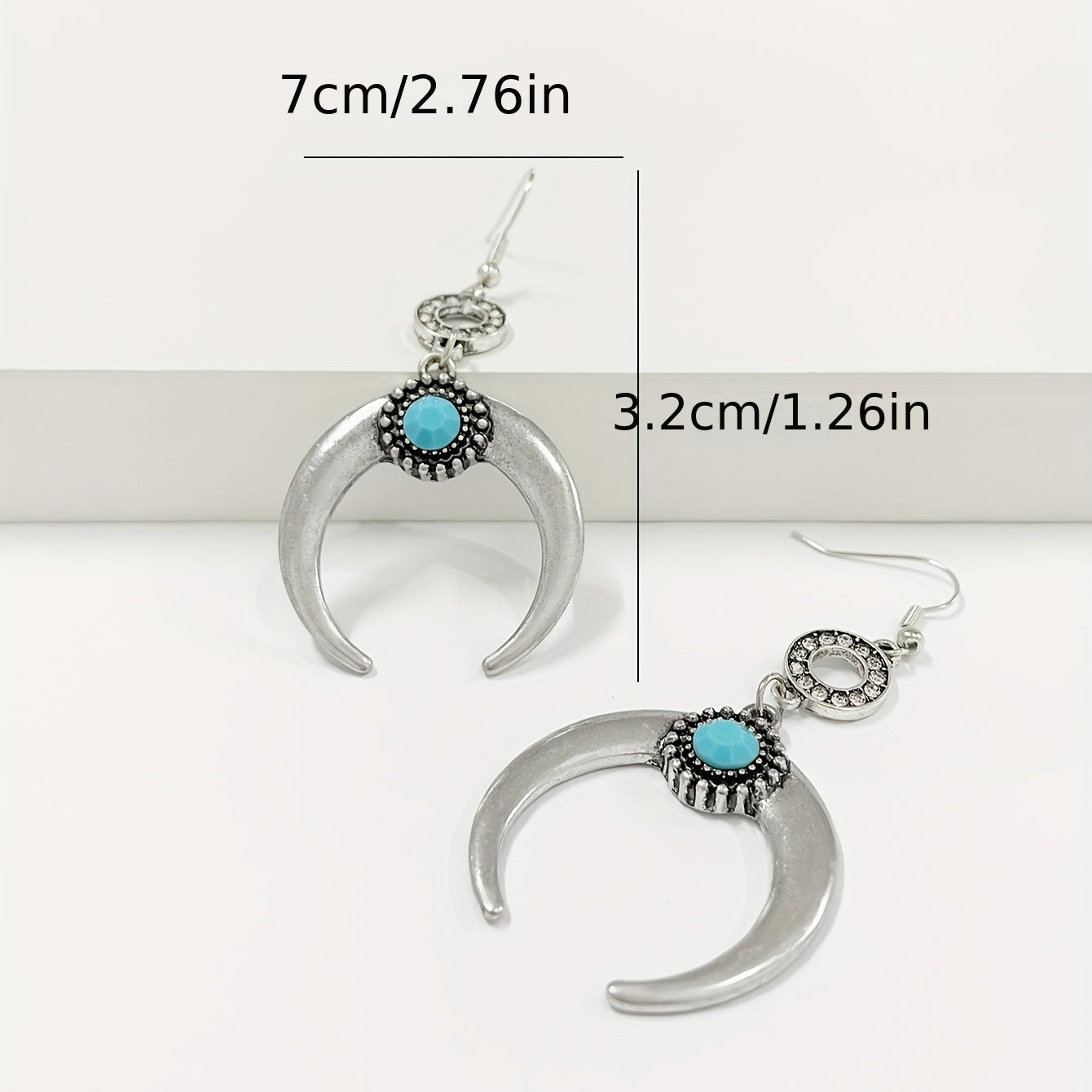 These dangle earrings feature a silvery moon design with turquoise decor, perfect for those who love bohemian ethnic style jewelry. Made of zinc alloy, these delicate earrings make a great gift for any female.