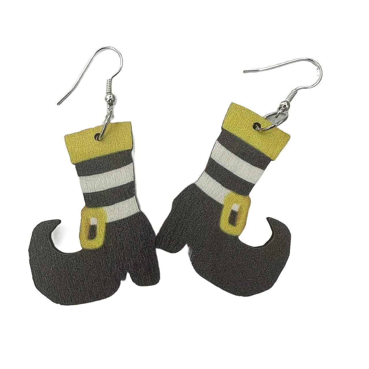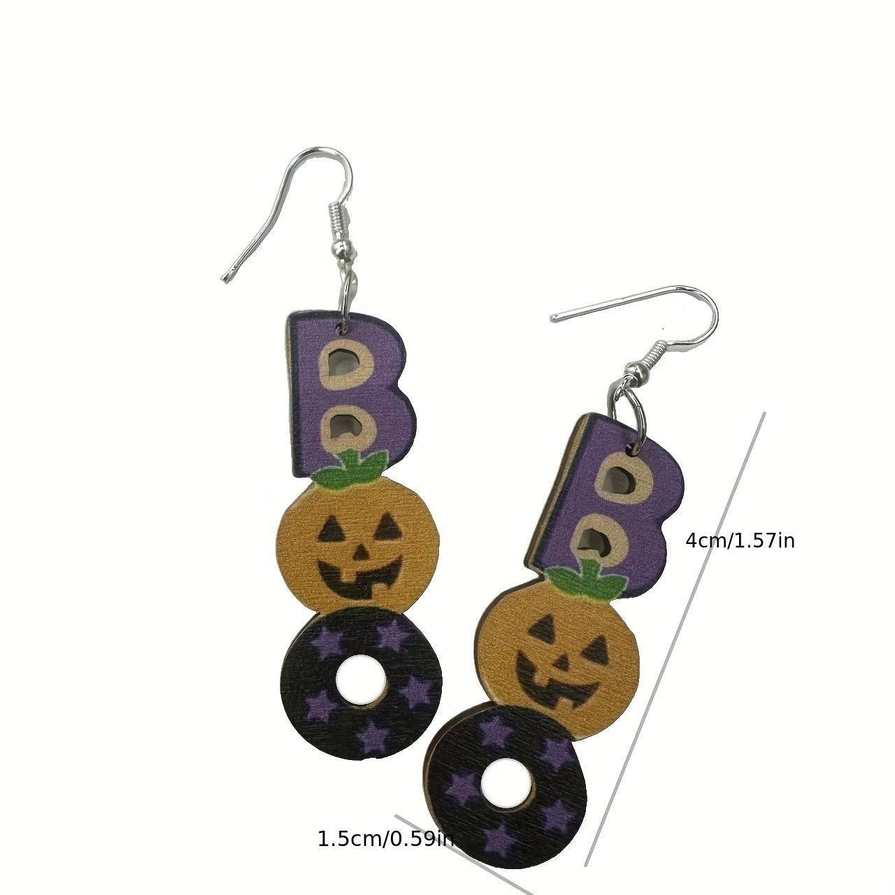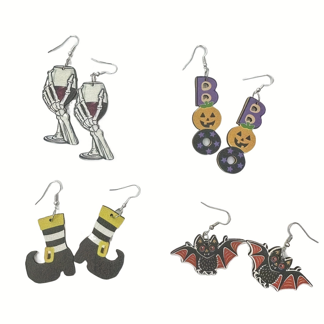 Embrace the gothic style with these spooky Halloween earrings featuring a creative design of skeleton hand, witch's boots, bat, and 'BOO' dangle elements.
