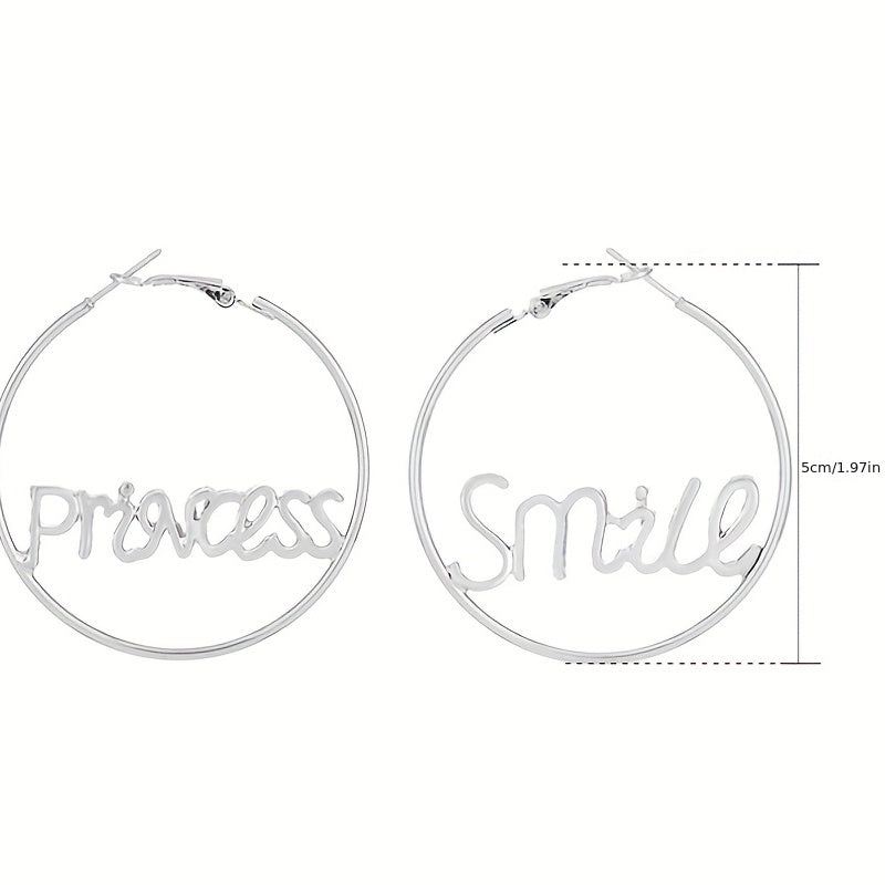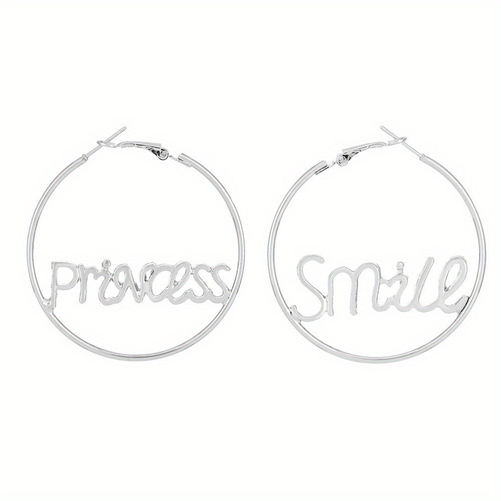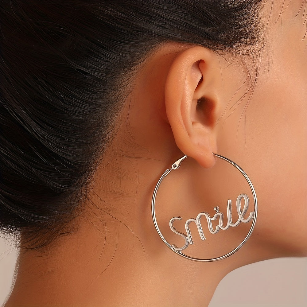These eye-catching round dangle earrings feature the word SMILE inlaid on them. They exude a minimalist leisure style and are made of high-quality alloy with a 14K gold plating. A perfect gift for various occasions.